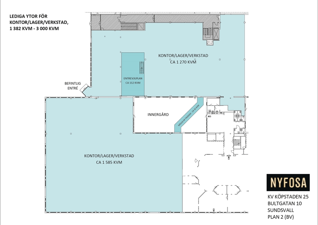 Lokalytorna ligger på plan 2, vilket är markplan vid den del av byggnaden där entrén till lokalerna finns, och det finns möjligheter att tillskapa fler entréer vid behov. Ytorna kan hyras såväl som en sammanhängande enhet om ca 3 000 kvm, eller delas upp i två stora ytor enligt föreslagen uppdelning som i bifogad planritning.