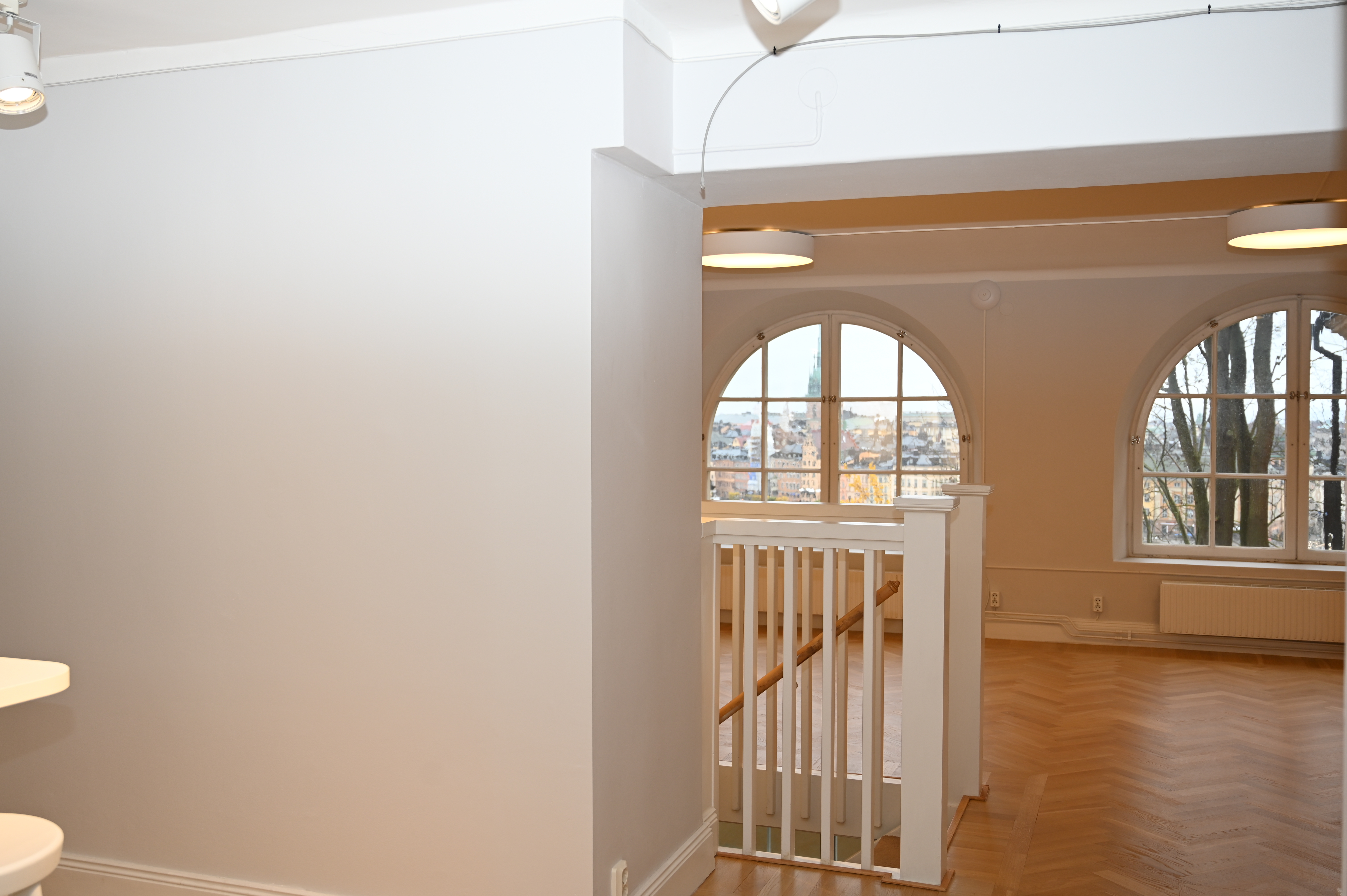 På det övre planet finns ett trevligt och välutrustat kök med tillhörande matplats. Det övre planet har fri utsikt över Gamla stan och Slussen.