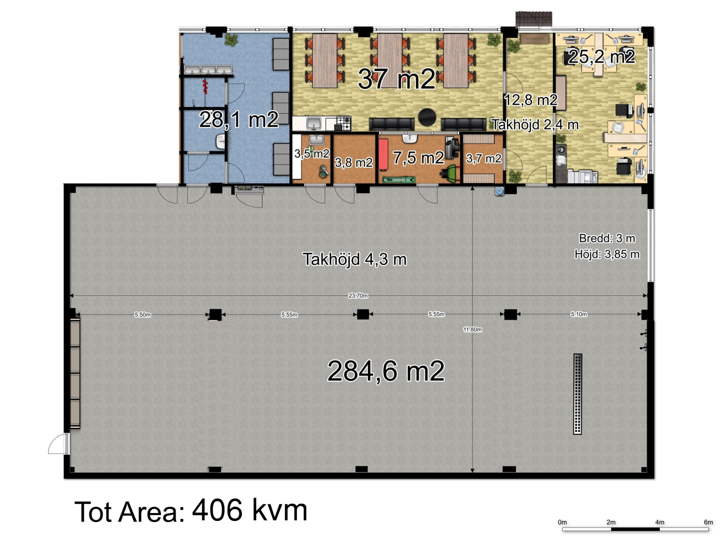 I lagret finns en port som är 3x3,85 m (bredd x höjd). I övrigt finns kontor, omklädning mm.