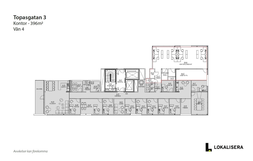 Välkommen till en nybyggd och representativ kontorslokal om 396 kvm, med en genomtänkt rumsbaserad planlösning i kombination med öppna arbetsytor och flera mötes- och konferensrum. Lokalen passar särskilt väl för tjänste- och kunskapsföretag som behöver arbetsro, integritet och professionella kundmöten som exempelvis konsulter, rådgivare, teknikbolag, arkitekter eller advokatverksamheter.
