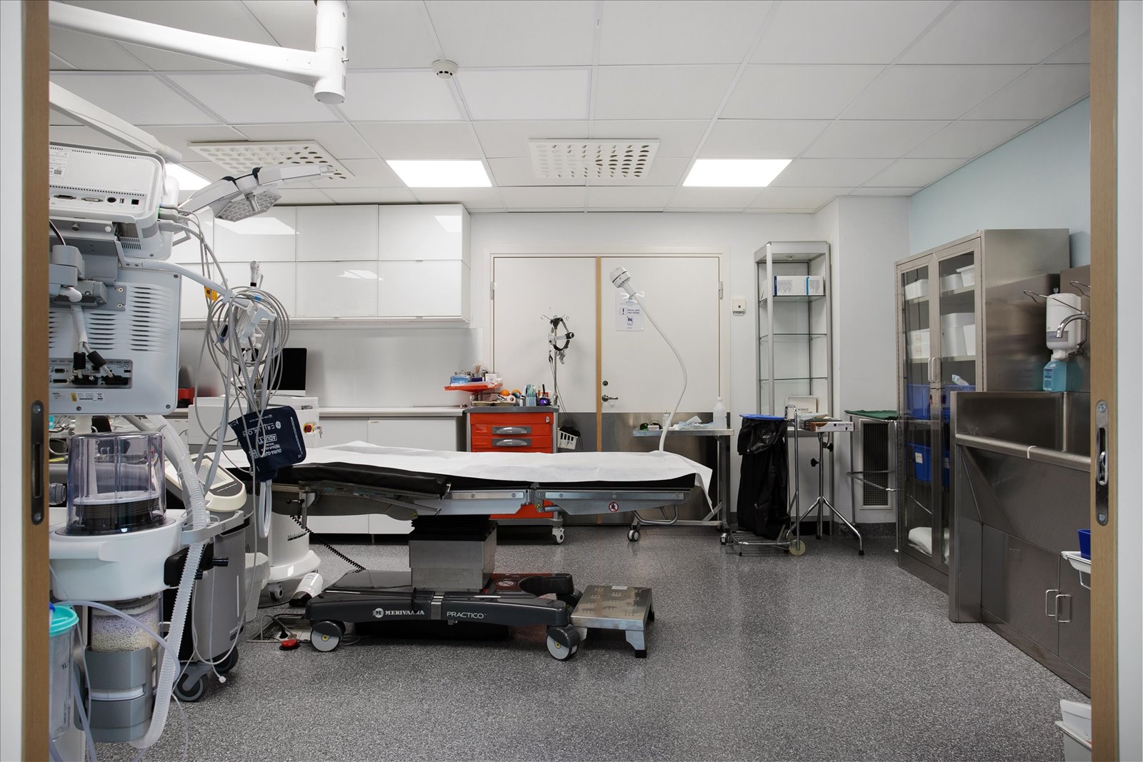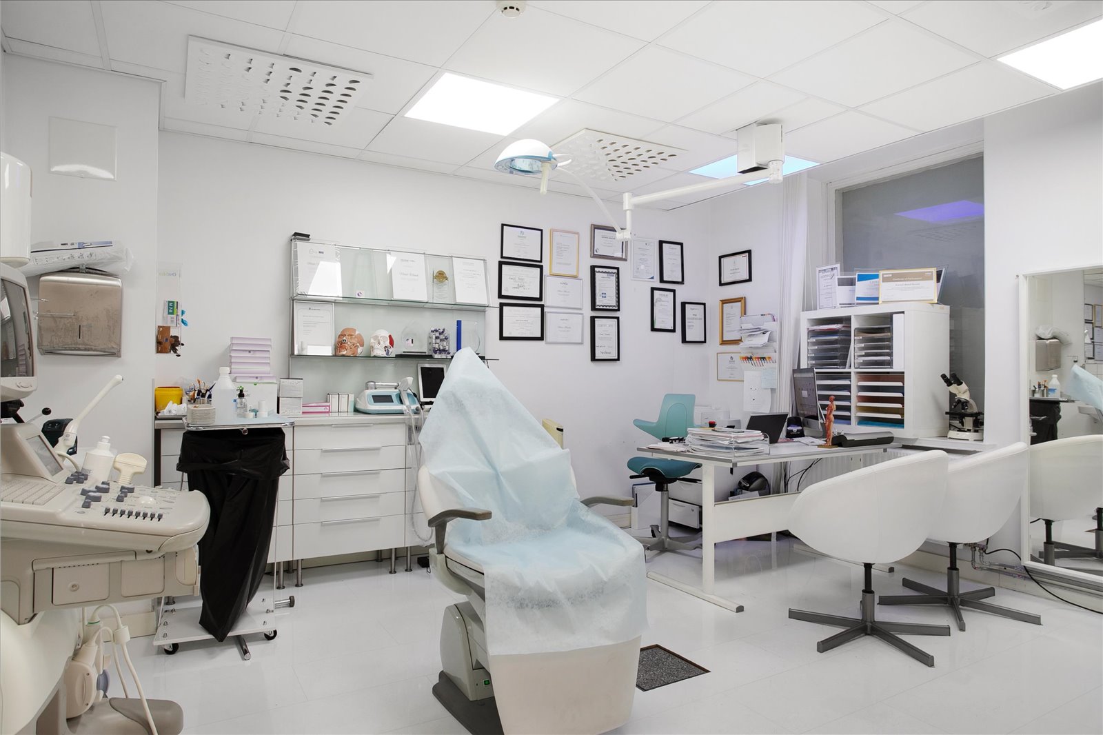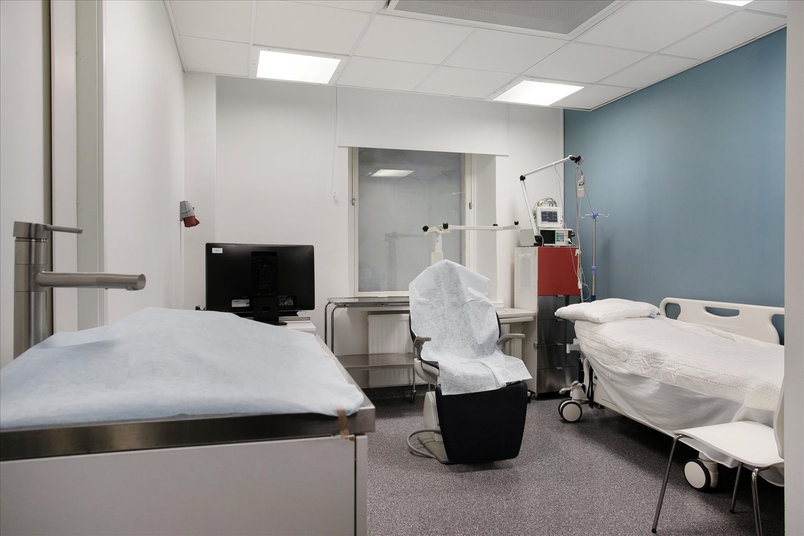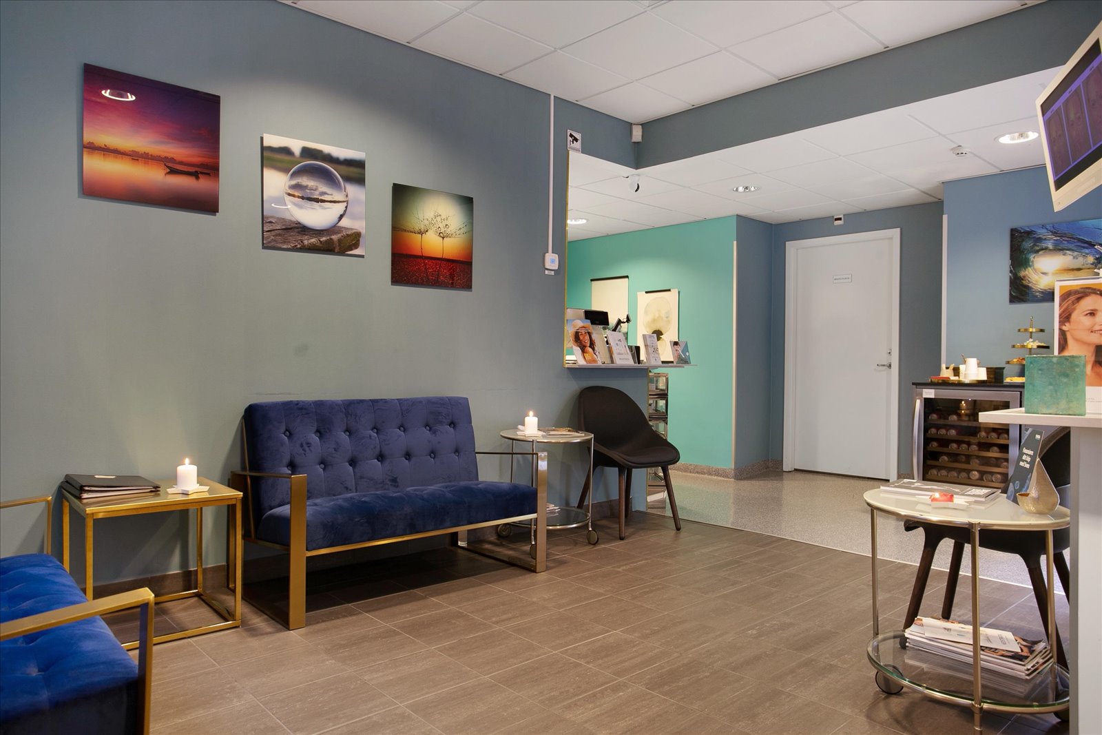 Genom huvudentrén från trapphuset (hiss finns) kommer man in till en entré med väntrum och reception med fönster mot innergården. Här finns även en HWC. Totalt finns det 5 WC och 5 behandlingsrum. Tre rum ligger i fil intill receptionen (varav två Typ B och en Typ A) där det mittersta rummet används som operationsrum, två separata rum ligger placerade lägre in i lokalen (Varav båda Typ A). WC finns i tre av rummen och samtliga rum har tvättställ.