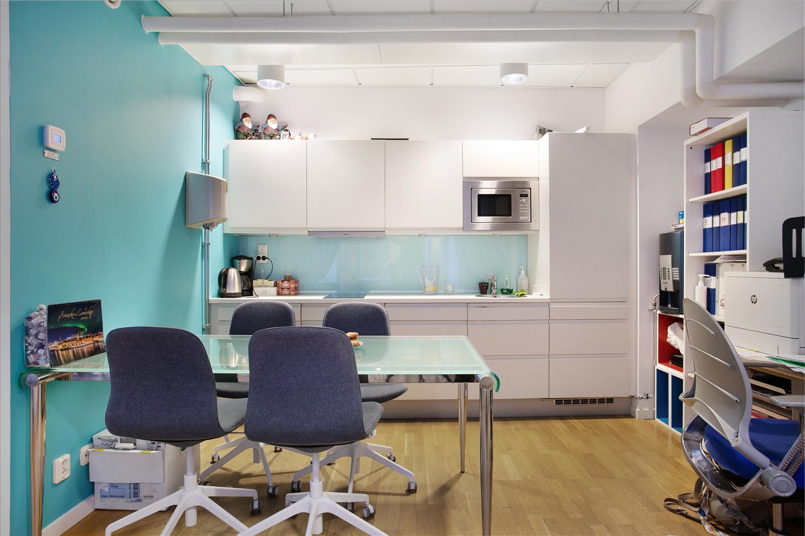Grannlokalen är idag kontorsytor för ca 8 personer med en öppen arbetsyta, två större konferensrum, ett telefonrum samt Pentry och WC.