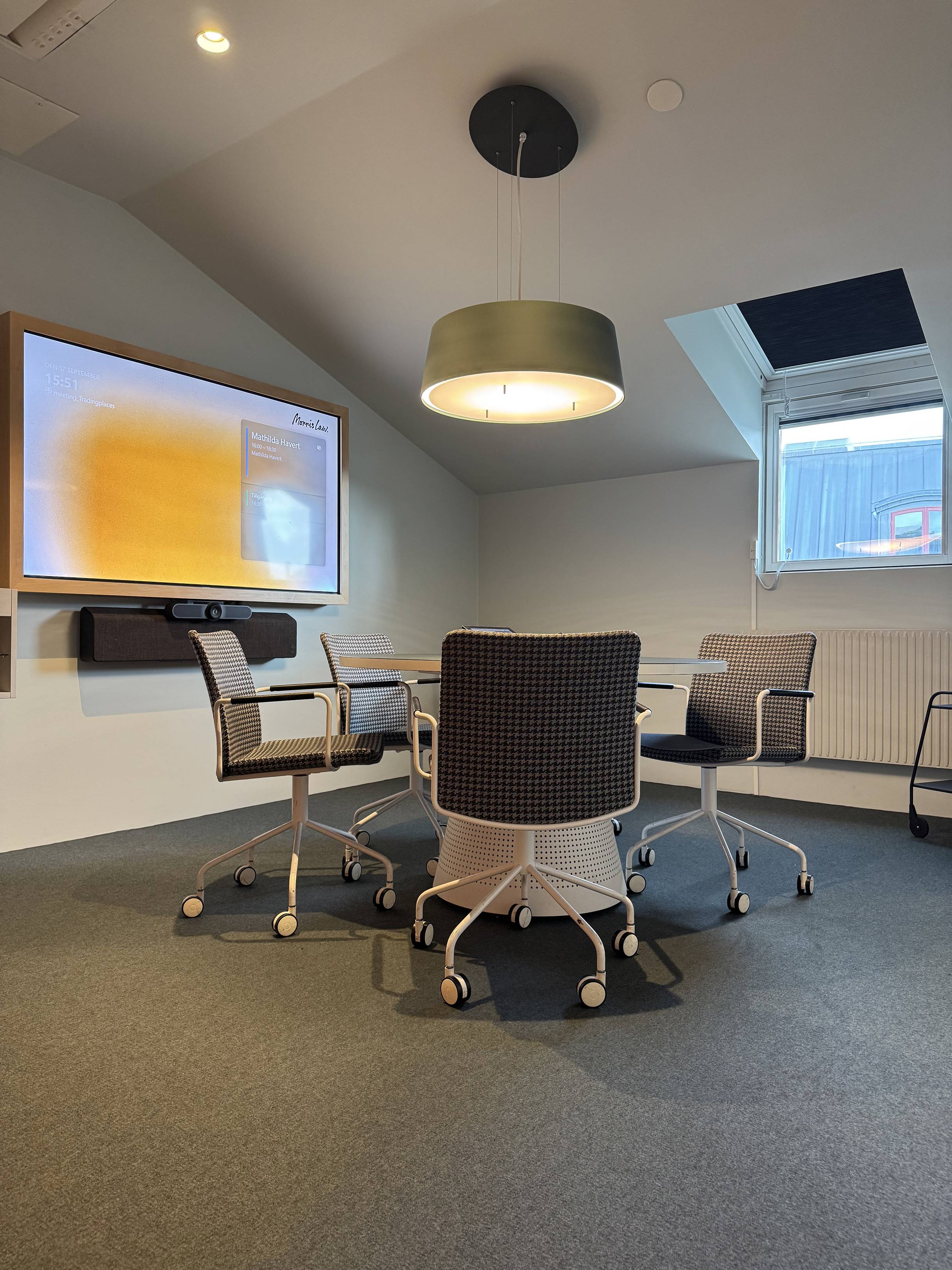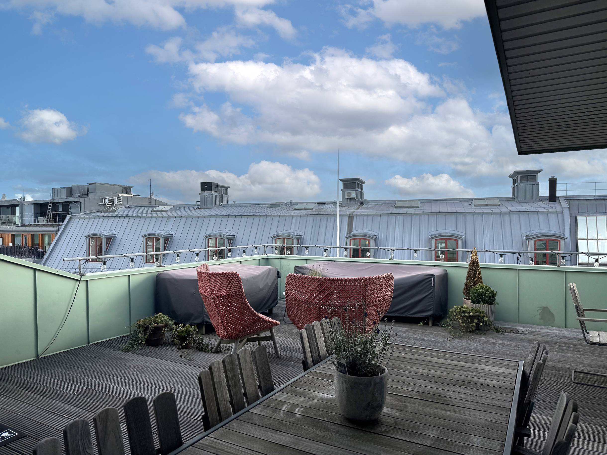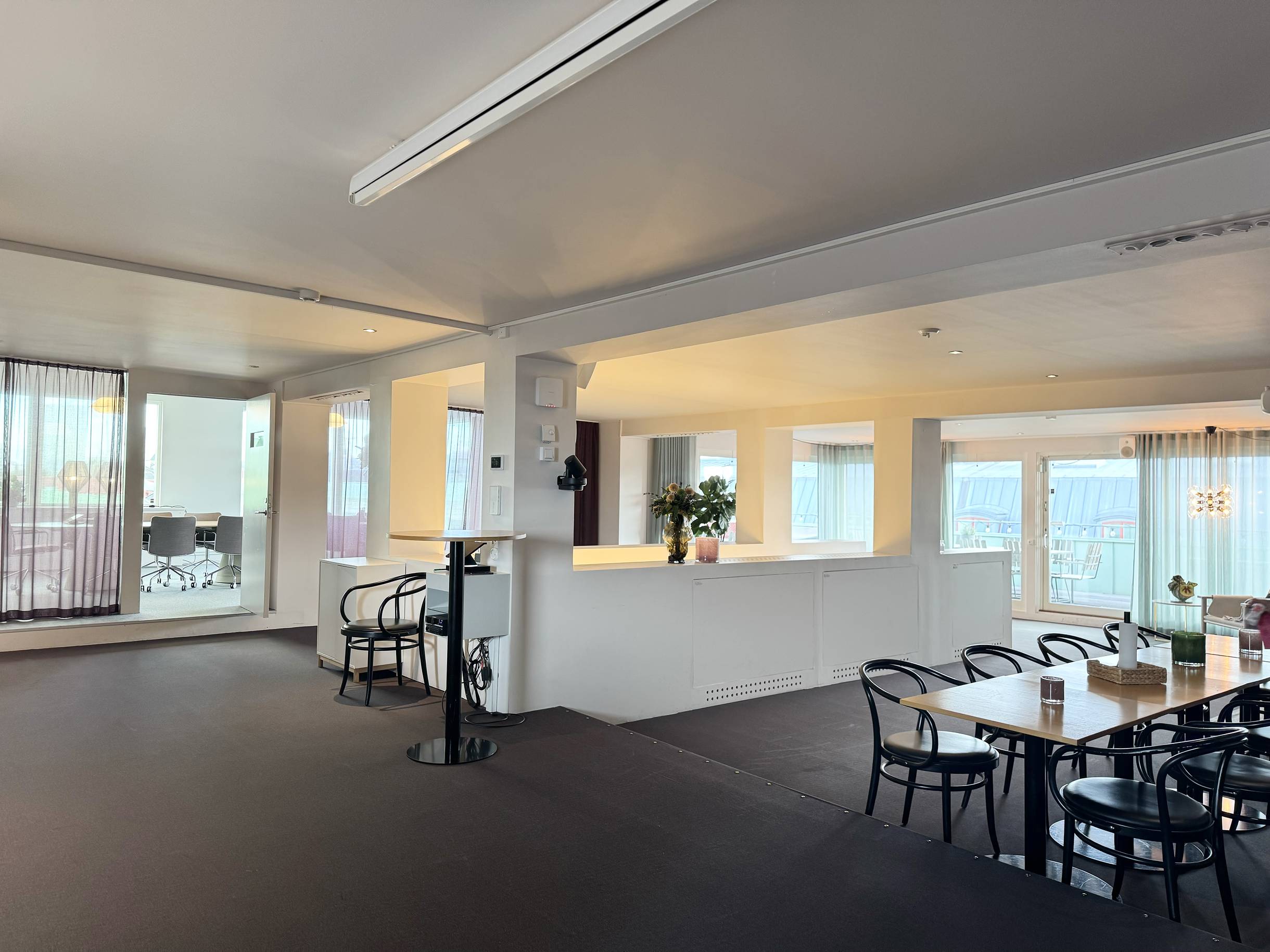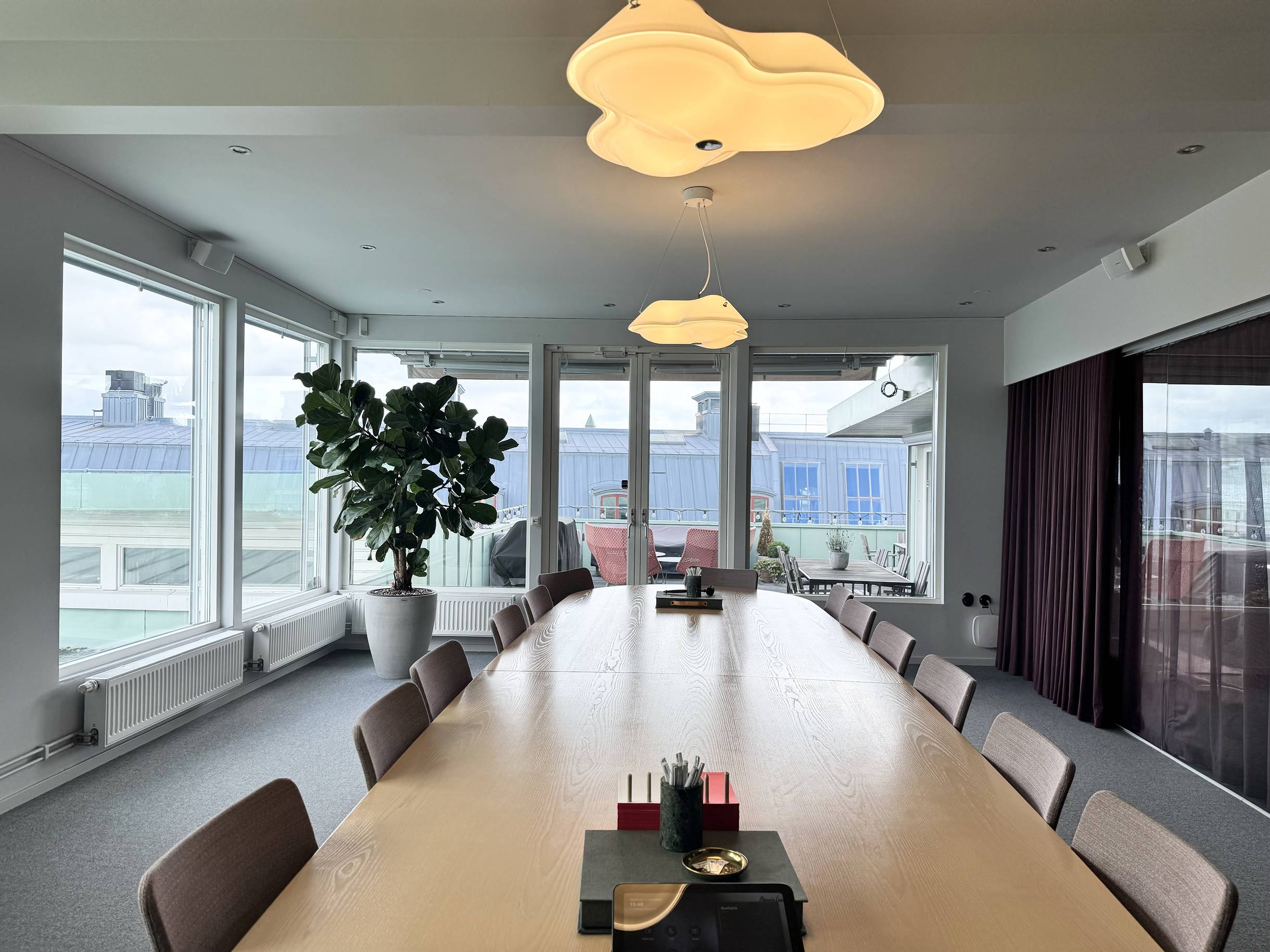På översta planet i lokalen ligger ett stort konferensrum och här finner man även köket som fungerar som en naturlig samlingsplats för teamet – perfekt för spontana möten, luncher eller företagsevent. Här finner man även den fantastiska terrassen med en härlig utsikt över takåsarna. Den öppna och sociala ytan här uppe gör det enkelt att arrangera allt från informella mingel till större sammankomster.