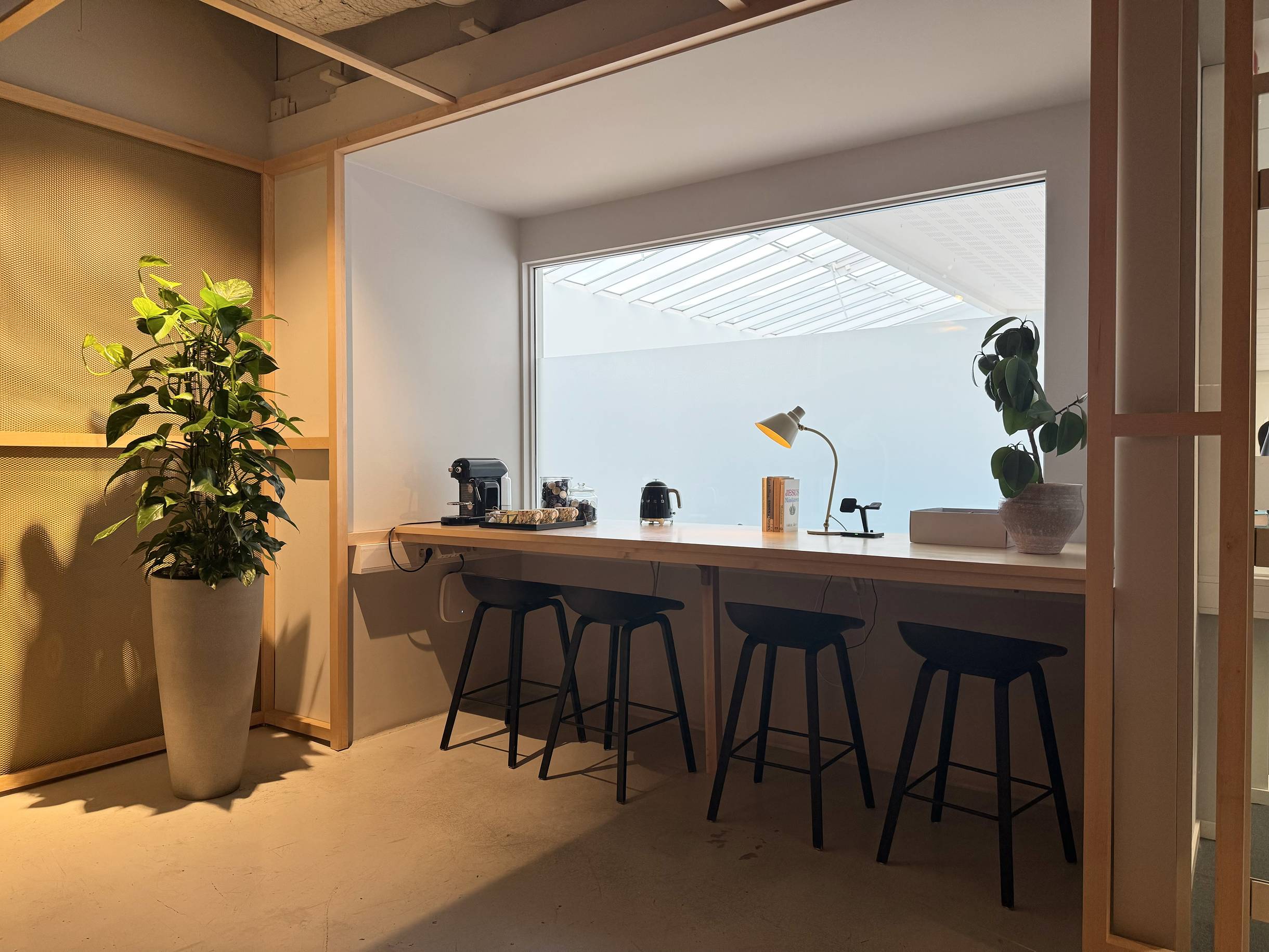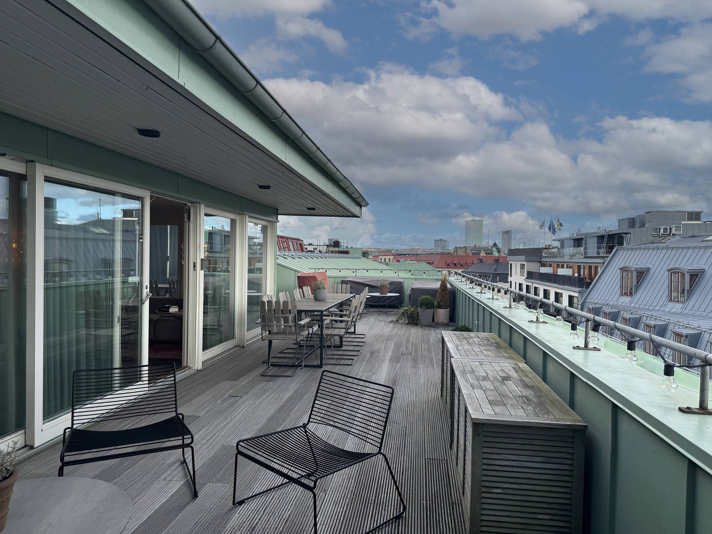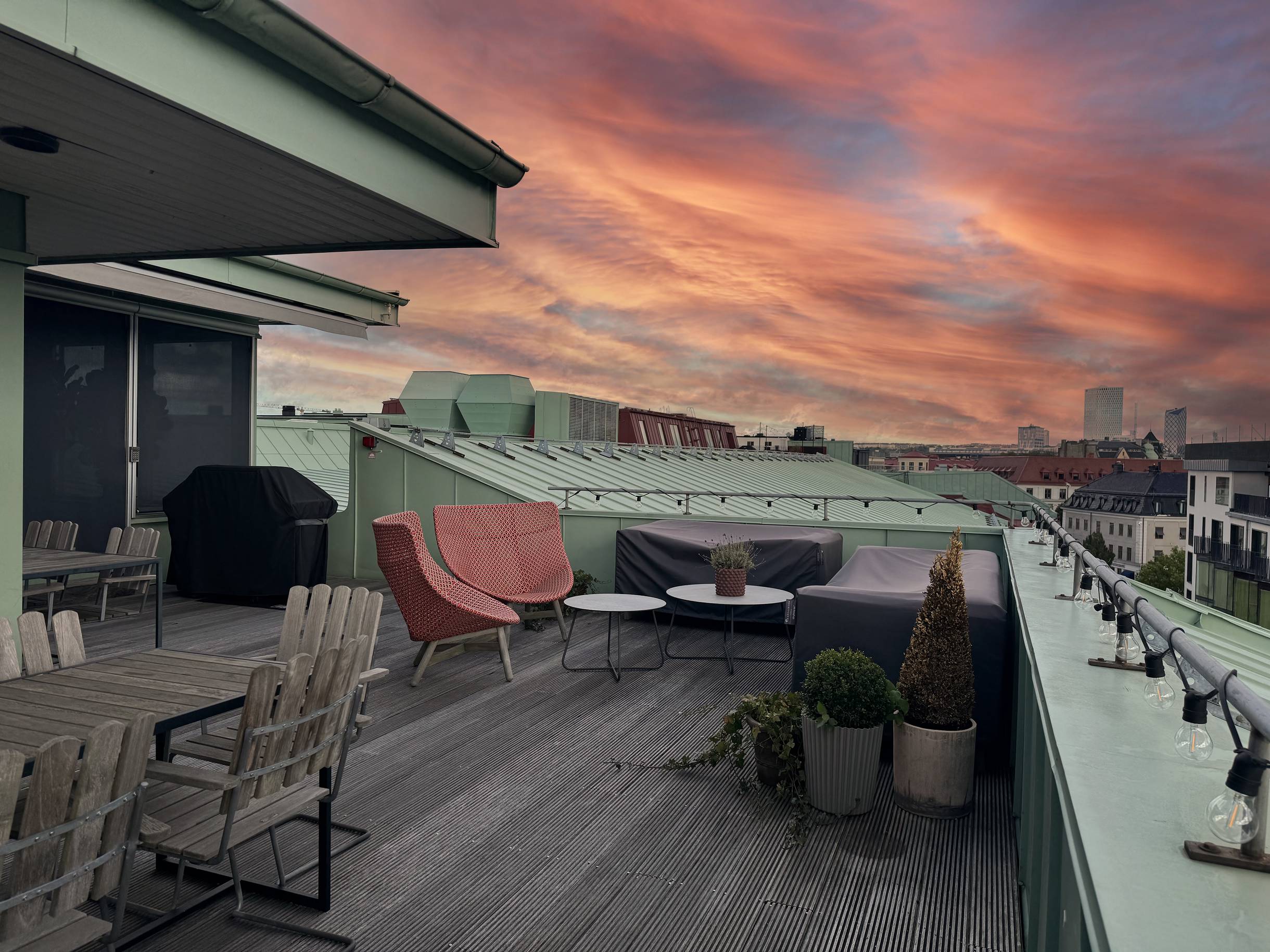 På översta planet i lokalen ligger ett stort konferensrum och här finner man även köket som fungerar som en naturlig samlingsplats för teamet – perfekt för spontana möten, luncher eller företagsevent. Här finner man även den fantastiska terrassen med en härlig utsikt över takåsarna. Den öppna och sociala ytan här uppe gör det enkelt att arrangera allt från informella mingel till större sammankomster.