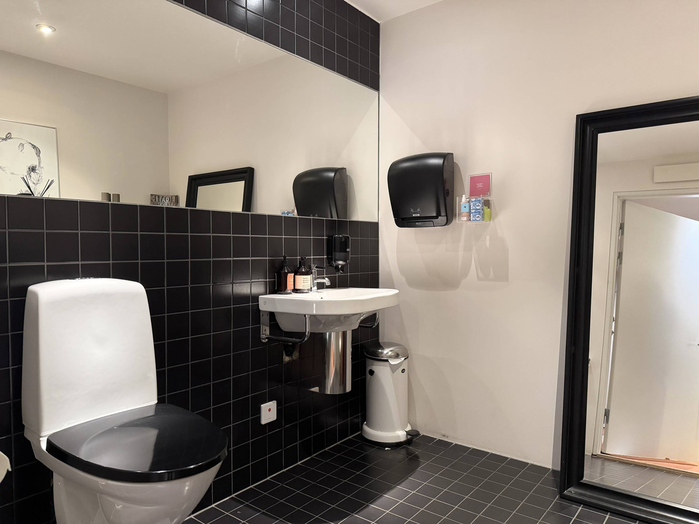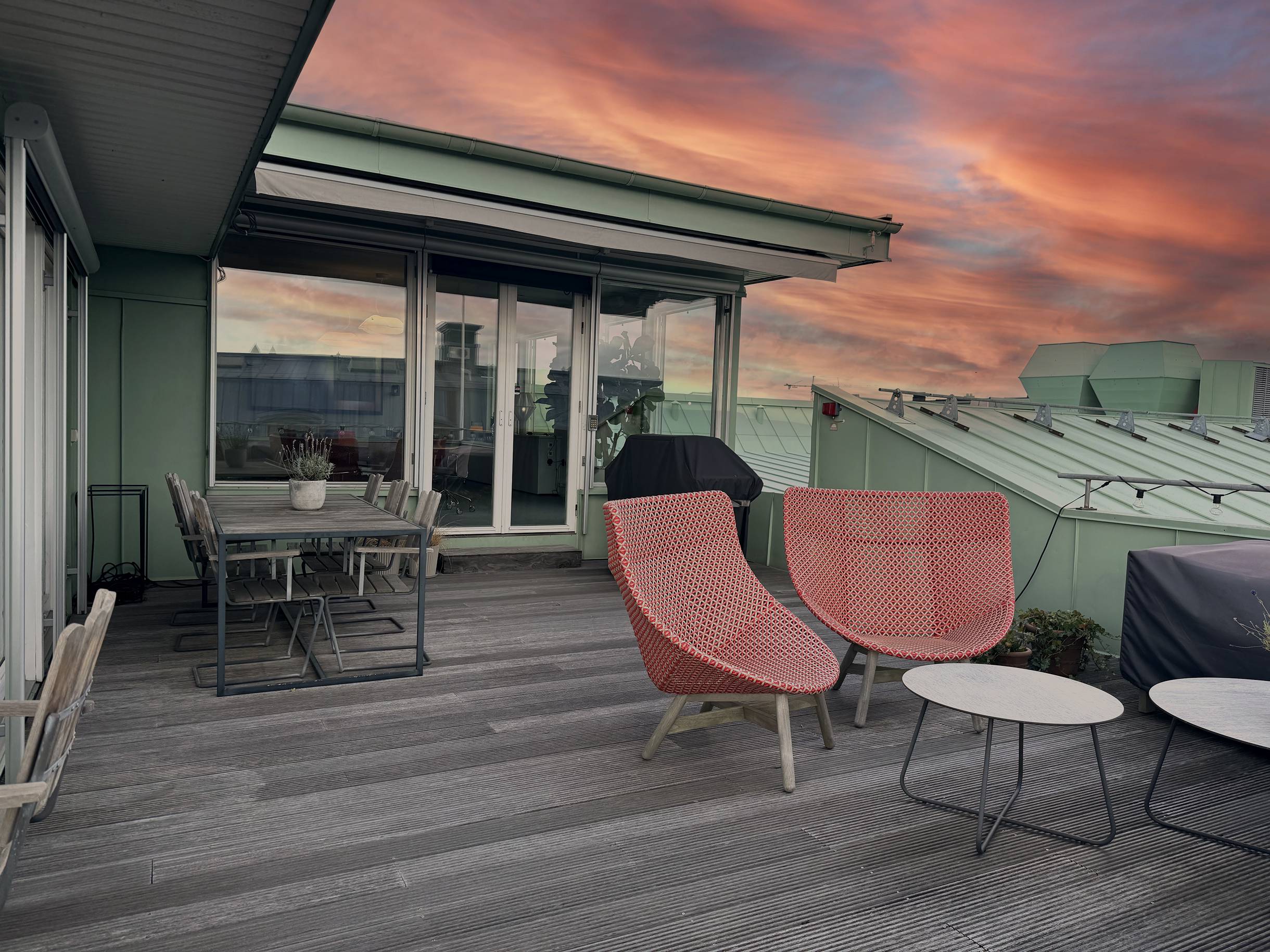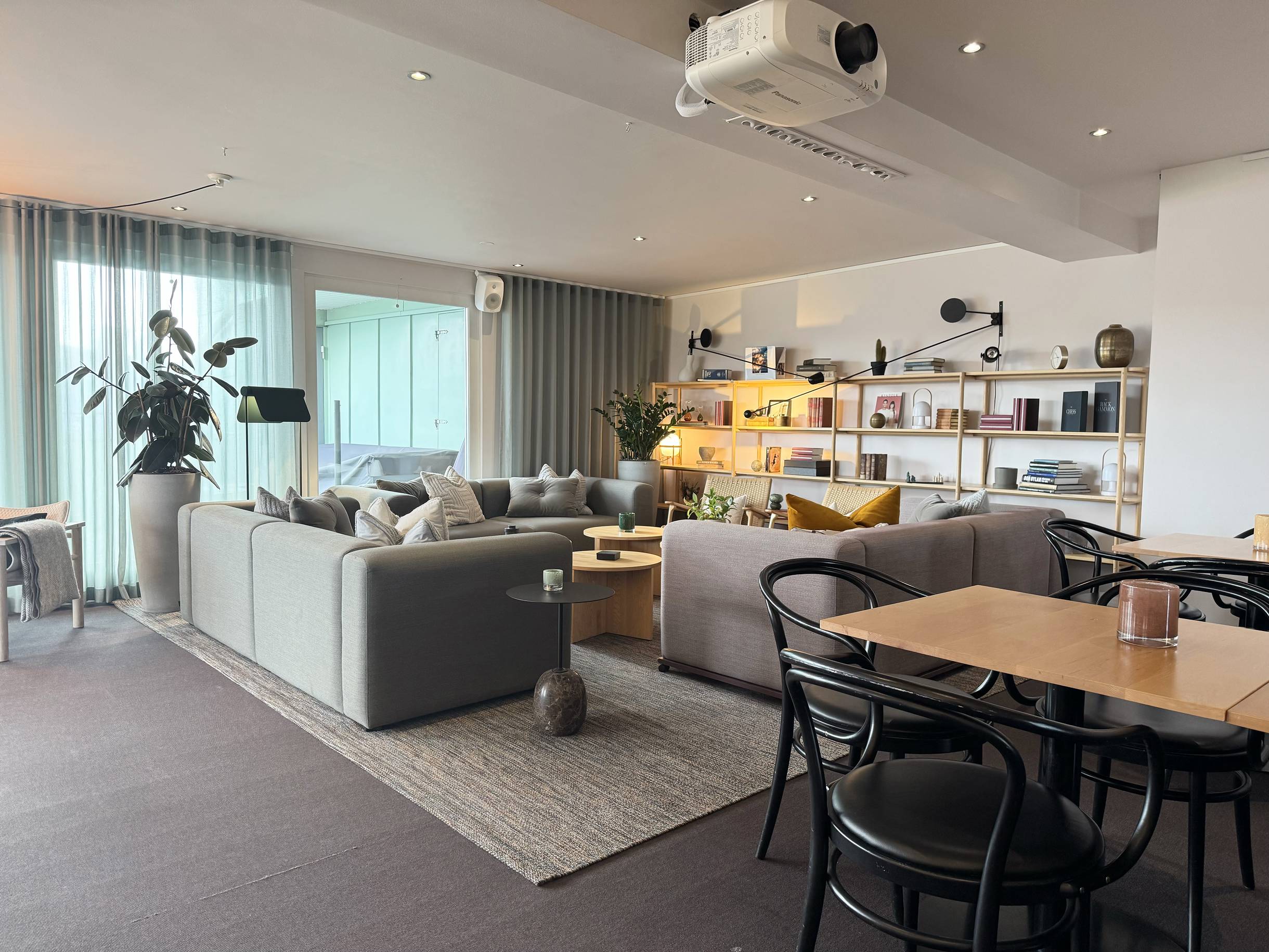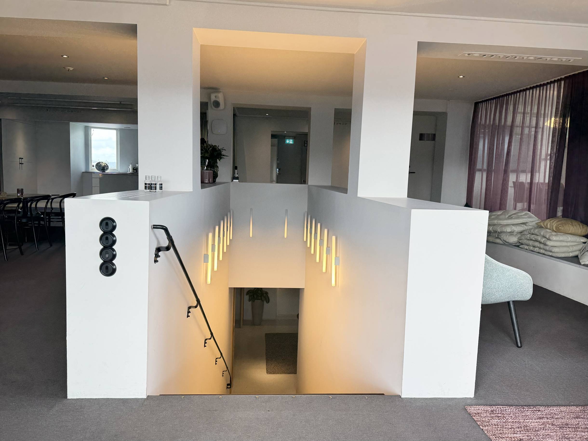 På översta planet i lokalen ligger ett stort konferensrum och här finner man även köket som fungerar som en naturlig samlingsplats för teamet – perfekt för spontana möten, luncher eller företagsevent. Här finner man även den fantastiska terrassen med en härlig utsikt över takåsarna. Den öppna och sociala ytan här uppe gör det enkelt att arrangera allt från informella mingel till större sammankomster.
