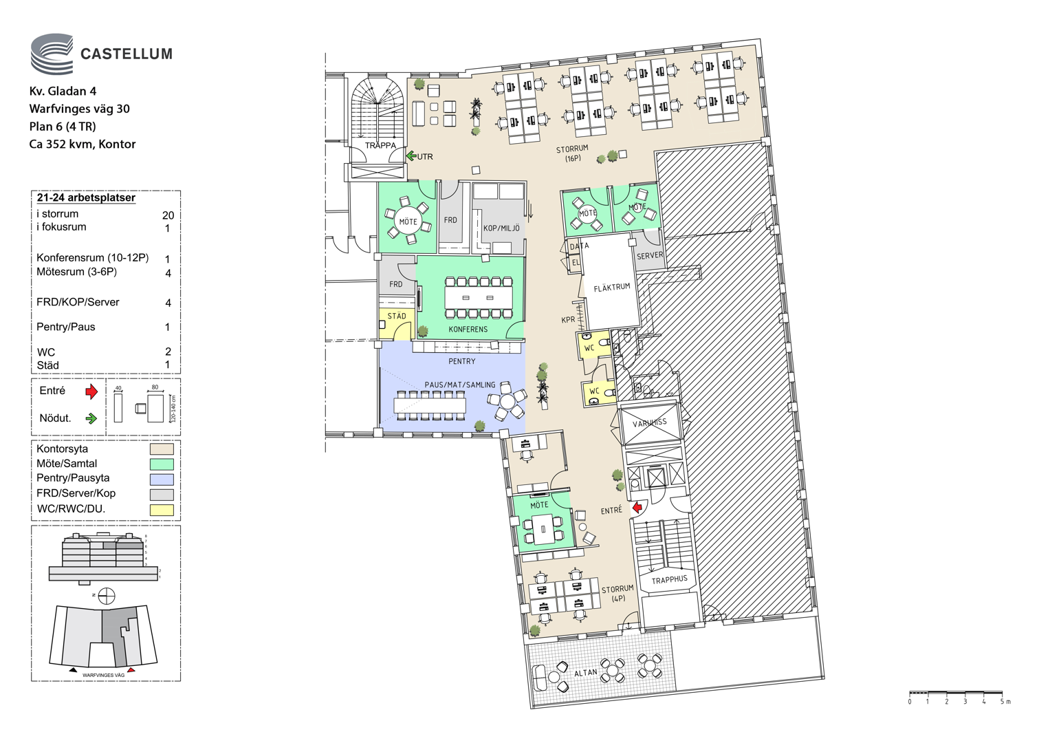Lokalen erbjuder öppna arbetsytor med flera mötesrum i olika storlekar samt ett större konferensrum. Ett öppet pentry- och pausutrymme ligger i mitten av lokalen. Praktiska ytor som förråd, kopieringsrum, serverrum och tillgång till varuhiss finns välplanerat i lokalen.