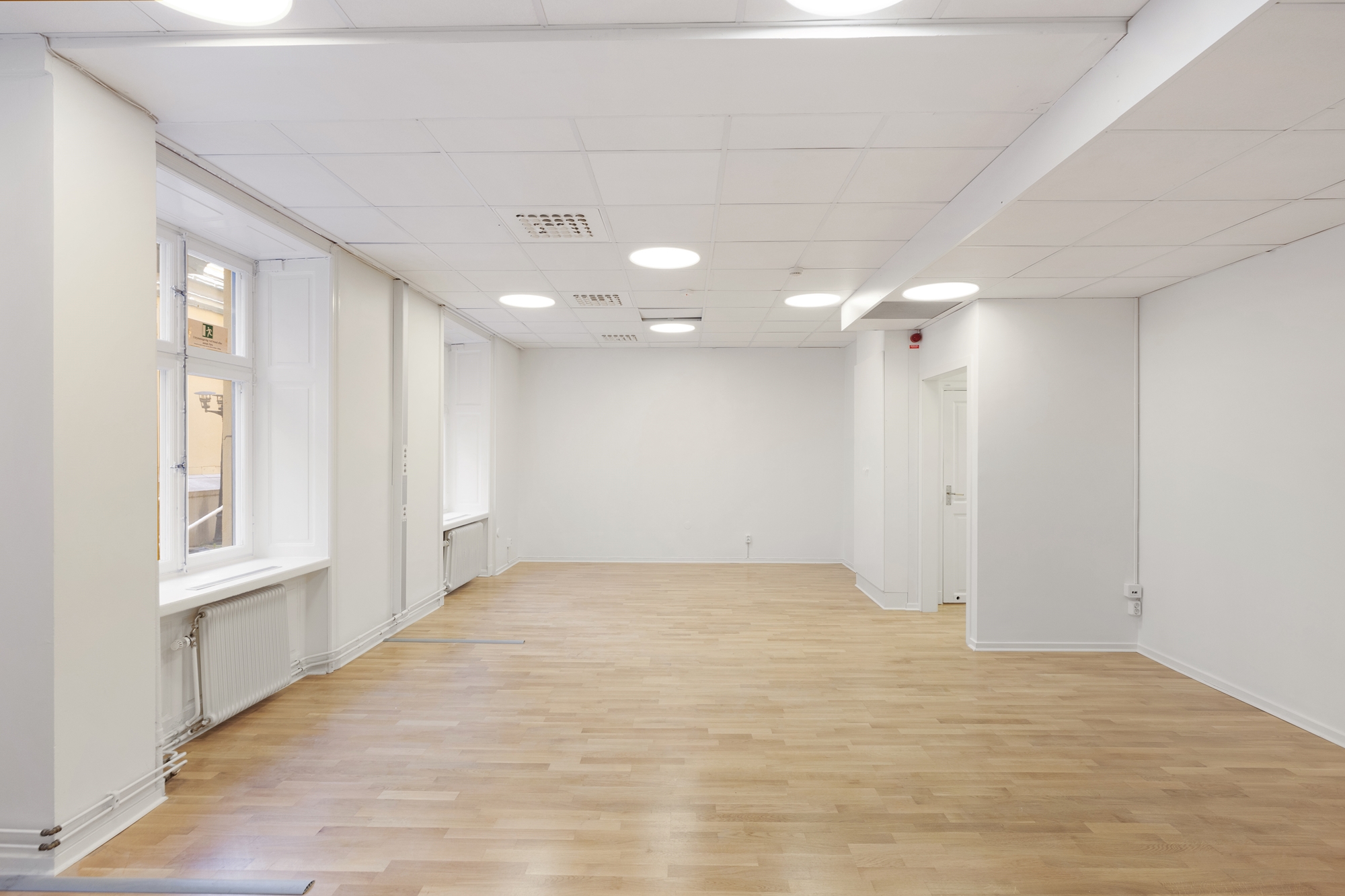 Genomgående fina ytskikt och trägolv i lokalen, samt heltäckningsmatta i konferensrummet.