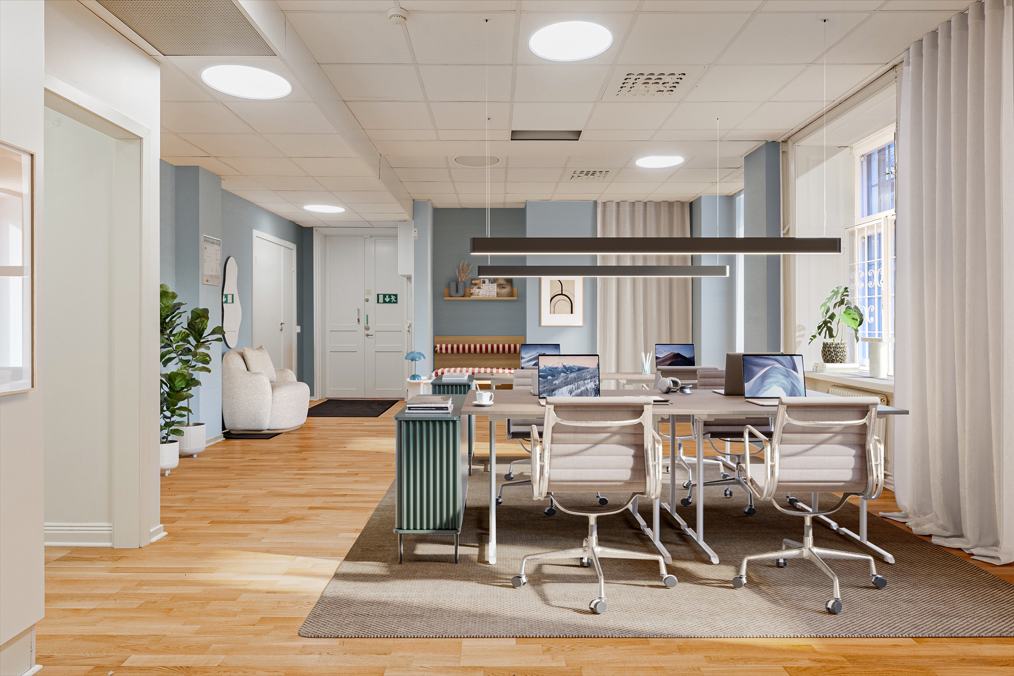 Här sitter du på bästa läge i en lokal med diverse kvalitéer; öppet kontorslandskap, trevligt mötesrum, god ventilation och närhet till all tänkbar citypuls.