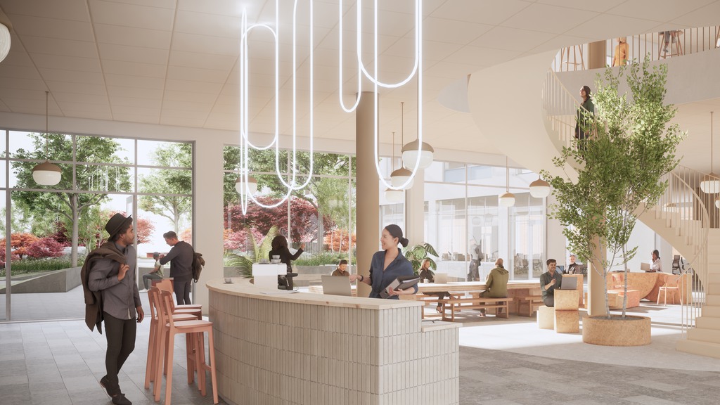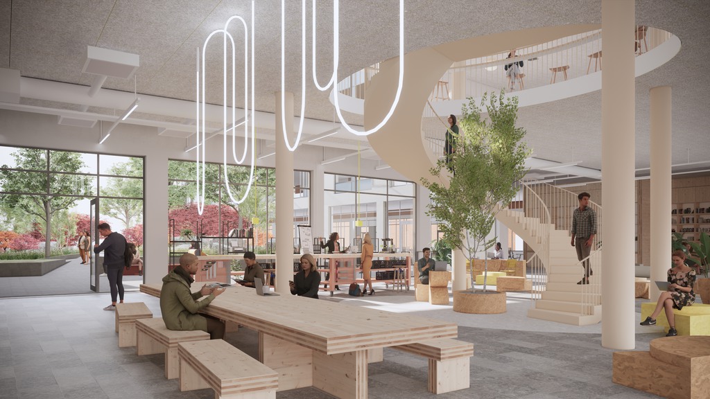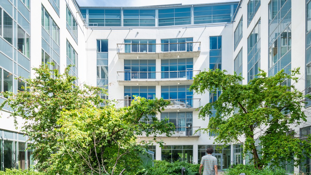 Den gröna innergården blir en lugn och naturlig samlingspunkt, perfekt för arbete utomhus, lunchpauser eller en kopp kaffe i solen. En rofylld miljö som skapar balans mot stadens liv precis utanför.