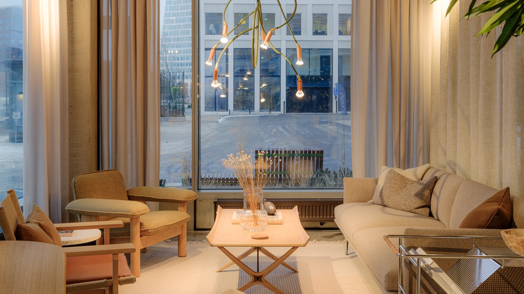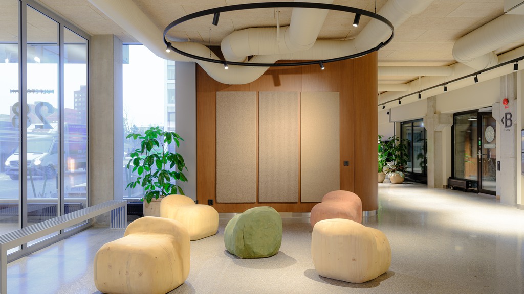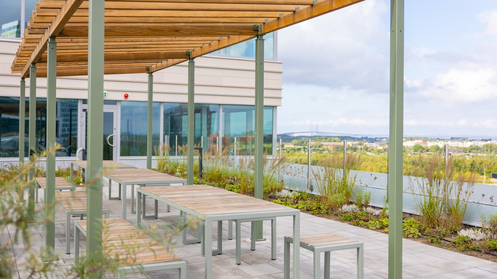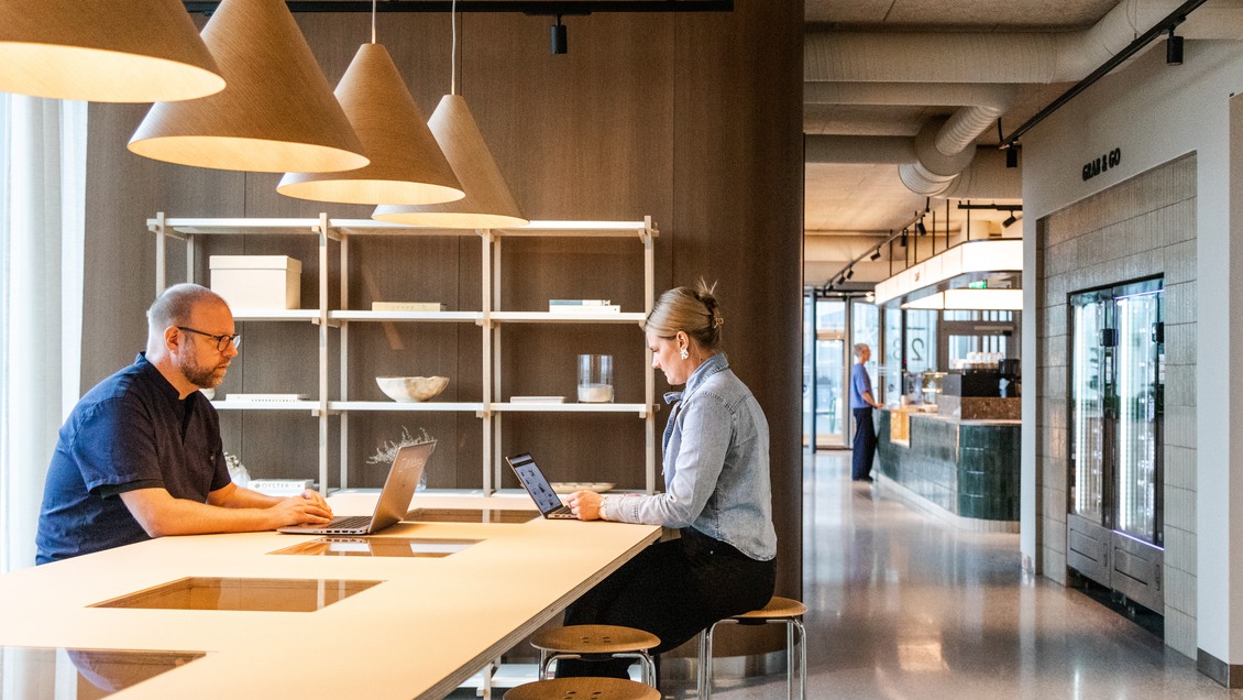 Här kombineras arbetsro med inspirerande gemensamma ytor. Ta en paus och njut av kaffet på någon av de gemensamma takterrasserna eller använd de välutrustade mötesrummen, loungerna och receptionen på bottenplan för att ta emot kunder och samarbetspartners på bästa sätt.
