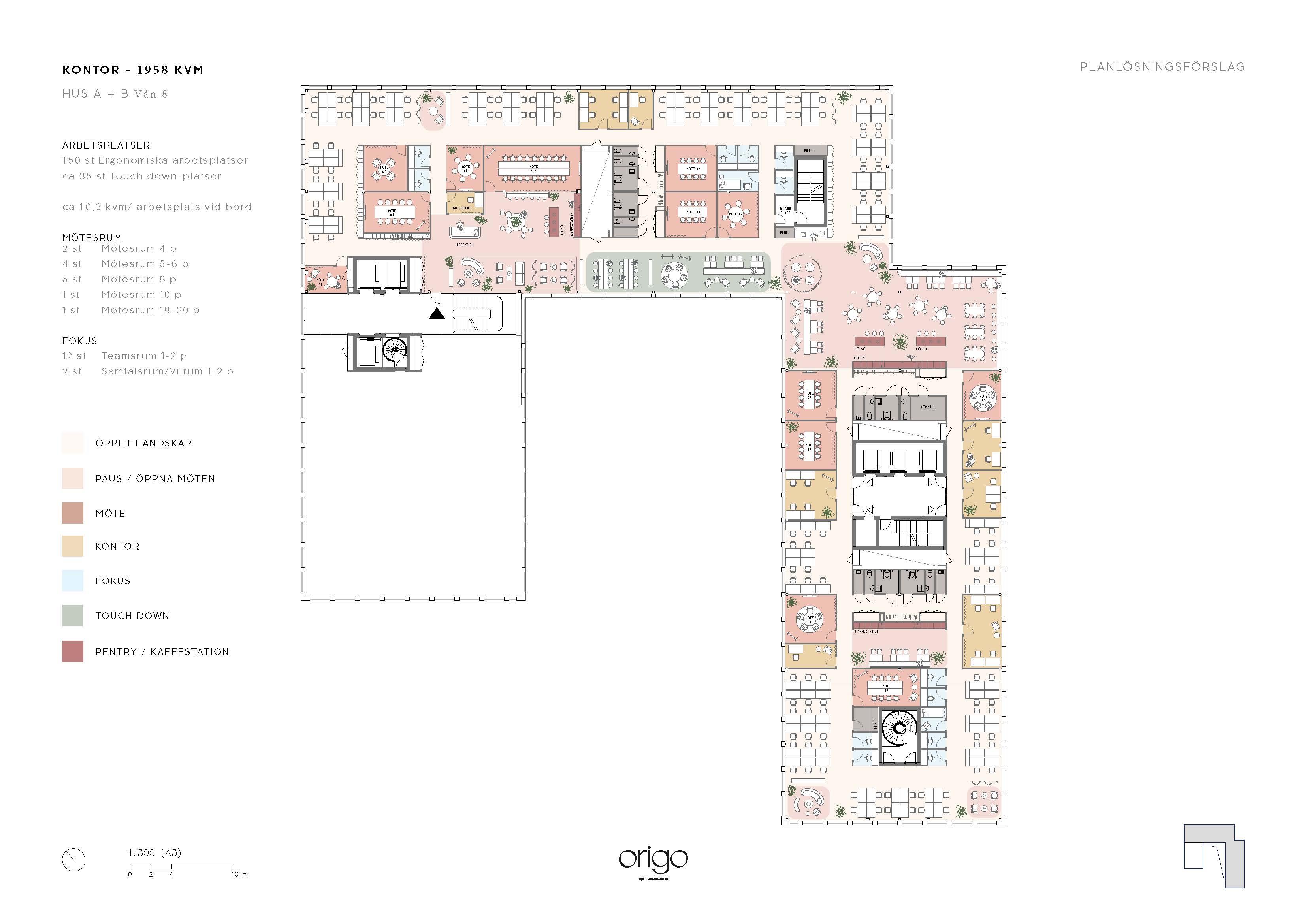 Bifogad planlösning är ett förslag på utformning. När vi vet mer om era behov och önskemål justerar vi lokalen utifrån dem. Utöver egna lokaler har ni tillgång till husets alla faciliteter så som gemensamma ytor för möten och sociala sammankomster, konferensytor, reception, café, bar, restaurang, takterrasser, gym, duschar och omklädningsrum.