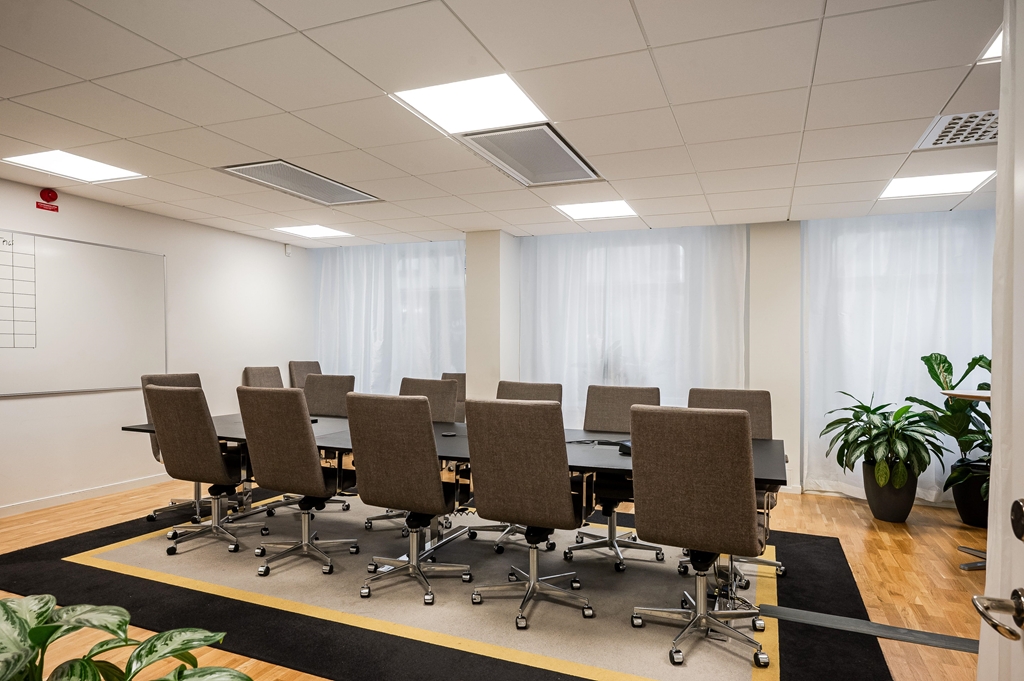 Kombinerad planlösning med kontorslandskap, konferensrum, mötesrum, kontorsrum.