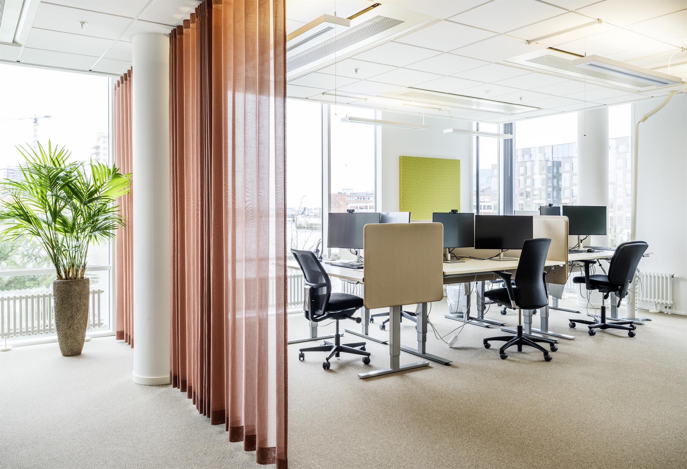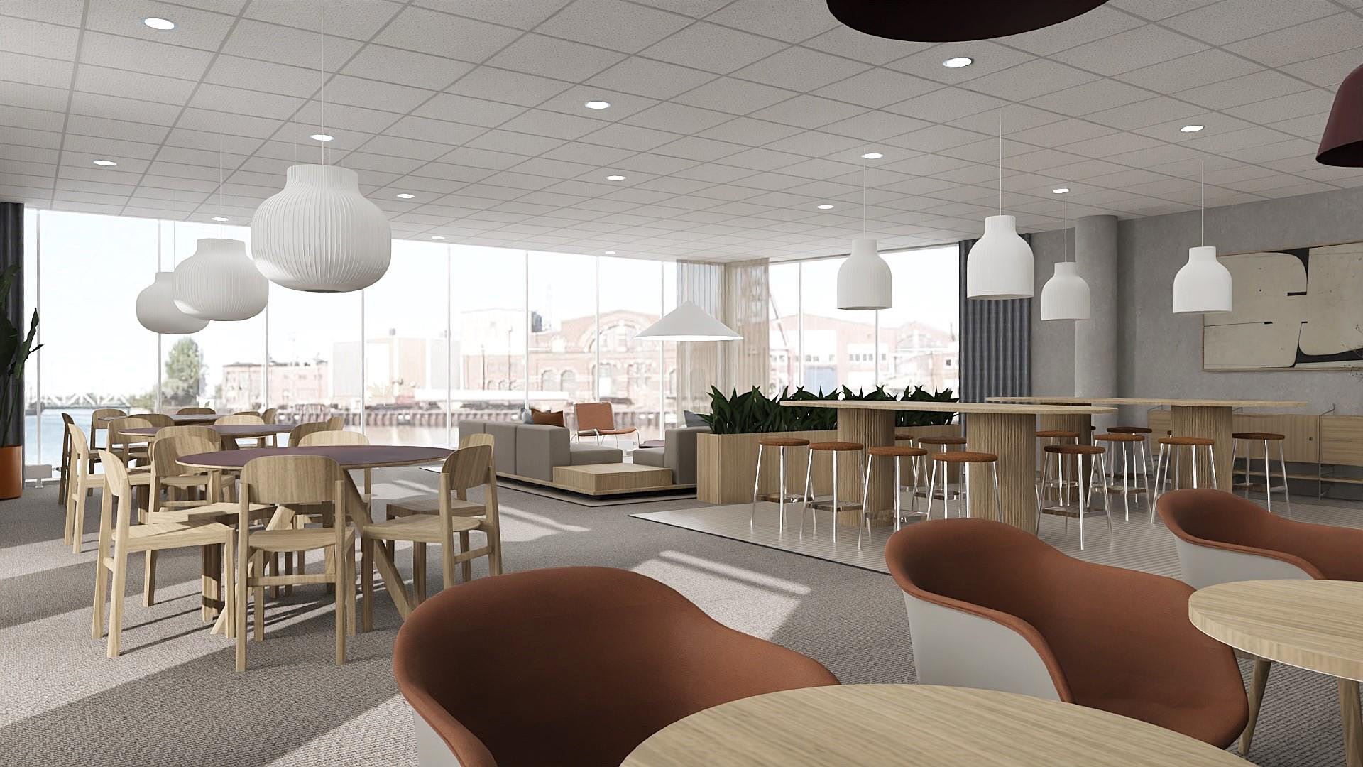 Kontorsfastighet vid vattnet på Universitetsholmen i Malmö. Styrmansgatan 2 Styrmansgatan 2 Styrmansgatan 2 Ljust öppet kontorslandskap med arbetsplatser och stora fönster i hörnrum. Öppet kontorslandskap med arbetsplatser och ljusinsläpp. Pentry och social yta med barstolar och plats för pauser. Styrmansgatan 2 Styrmansgatan 2