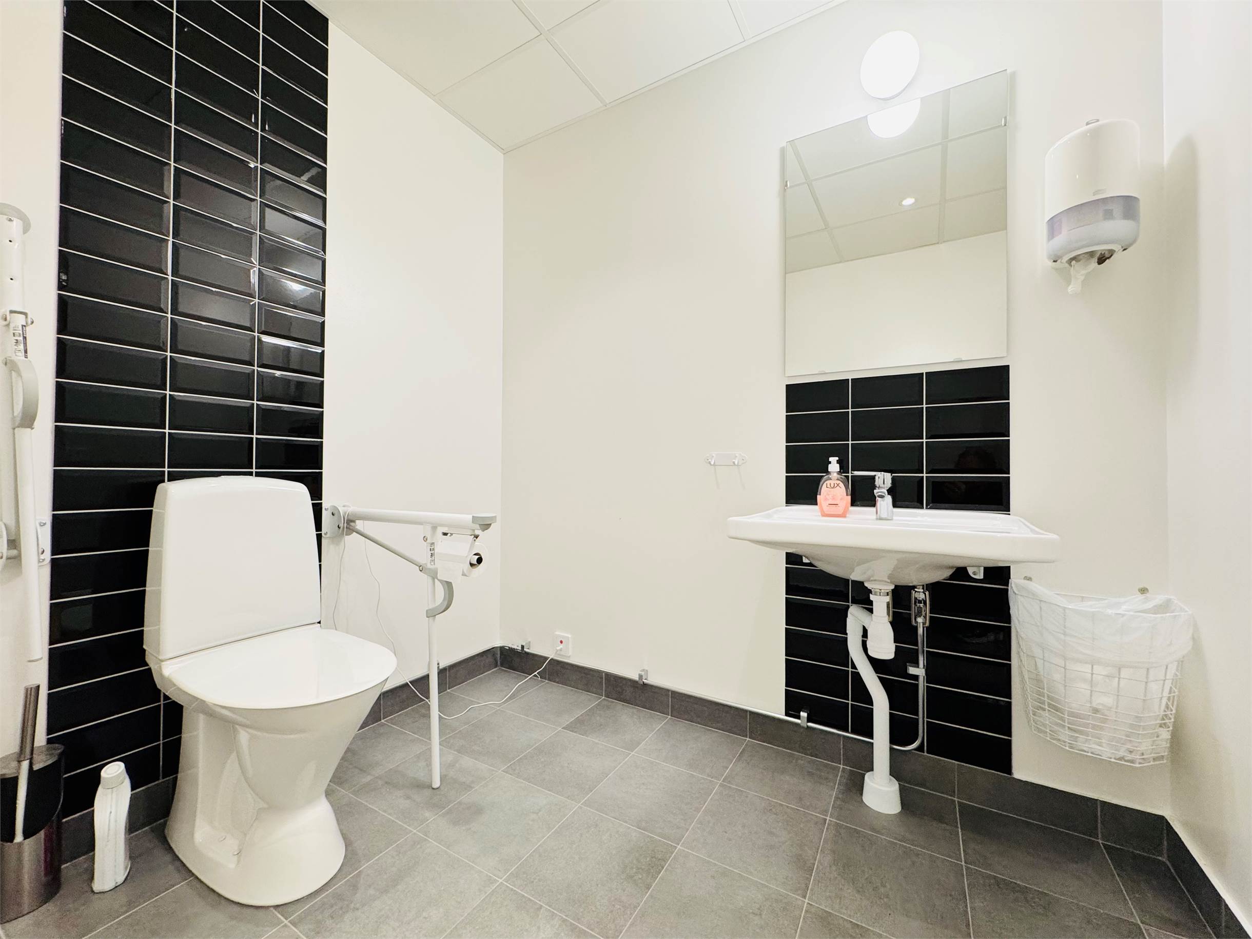 Lokalen håller genomgående hög standard med två stilfulla wc, varav en med dusch. Köket är påkostat och utrustat med modern maskinell utrustning. I köket finns utrymme för en matplats med utsikt mot gården.