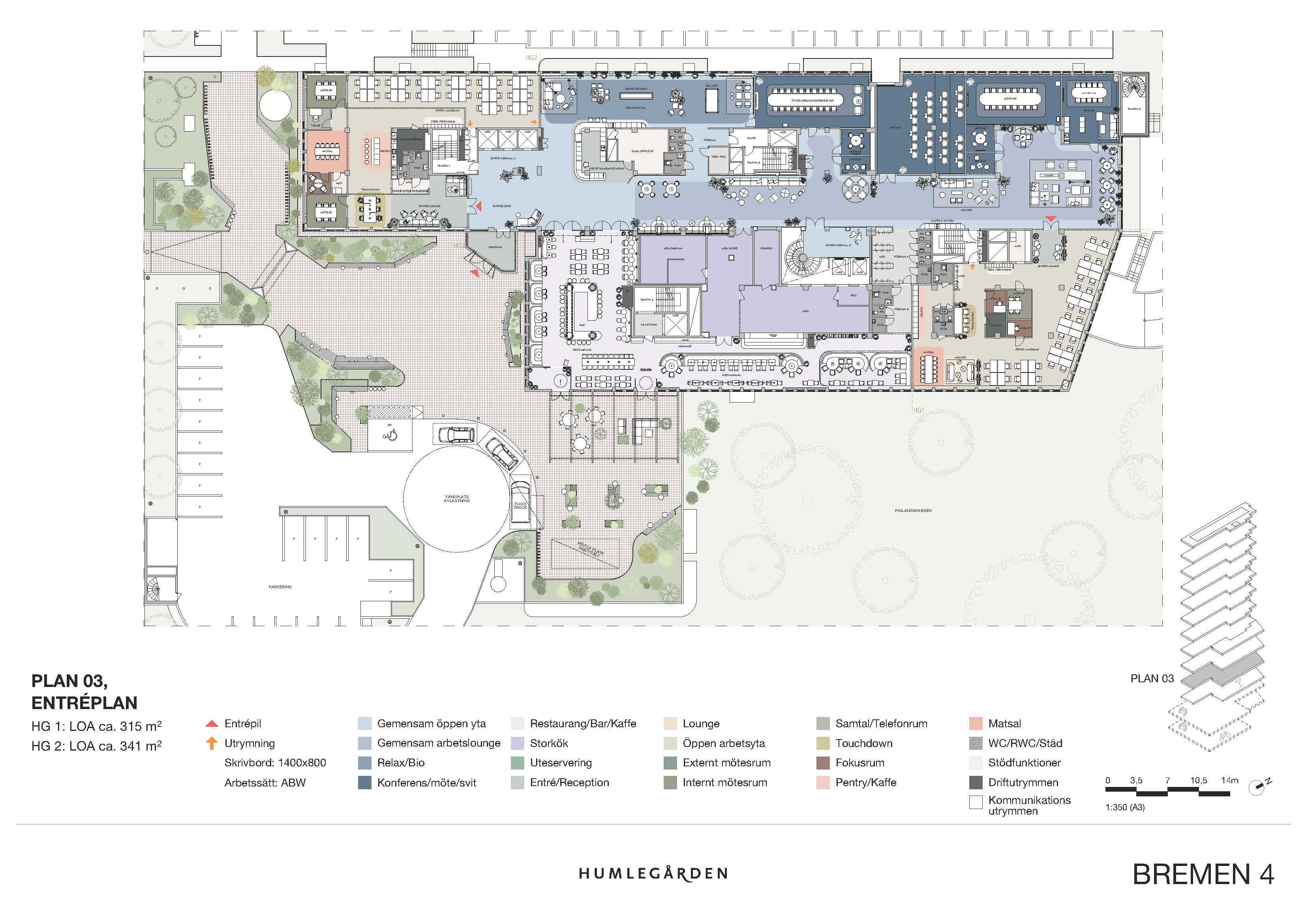 Parkeringsplatser finns i garaget som sträcker sig över två plan.