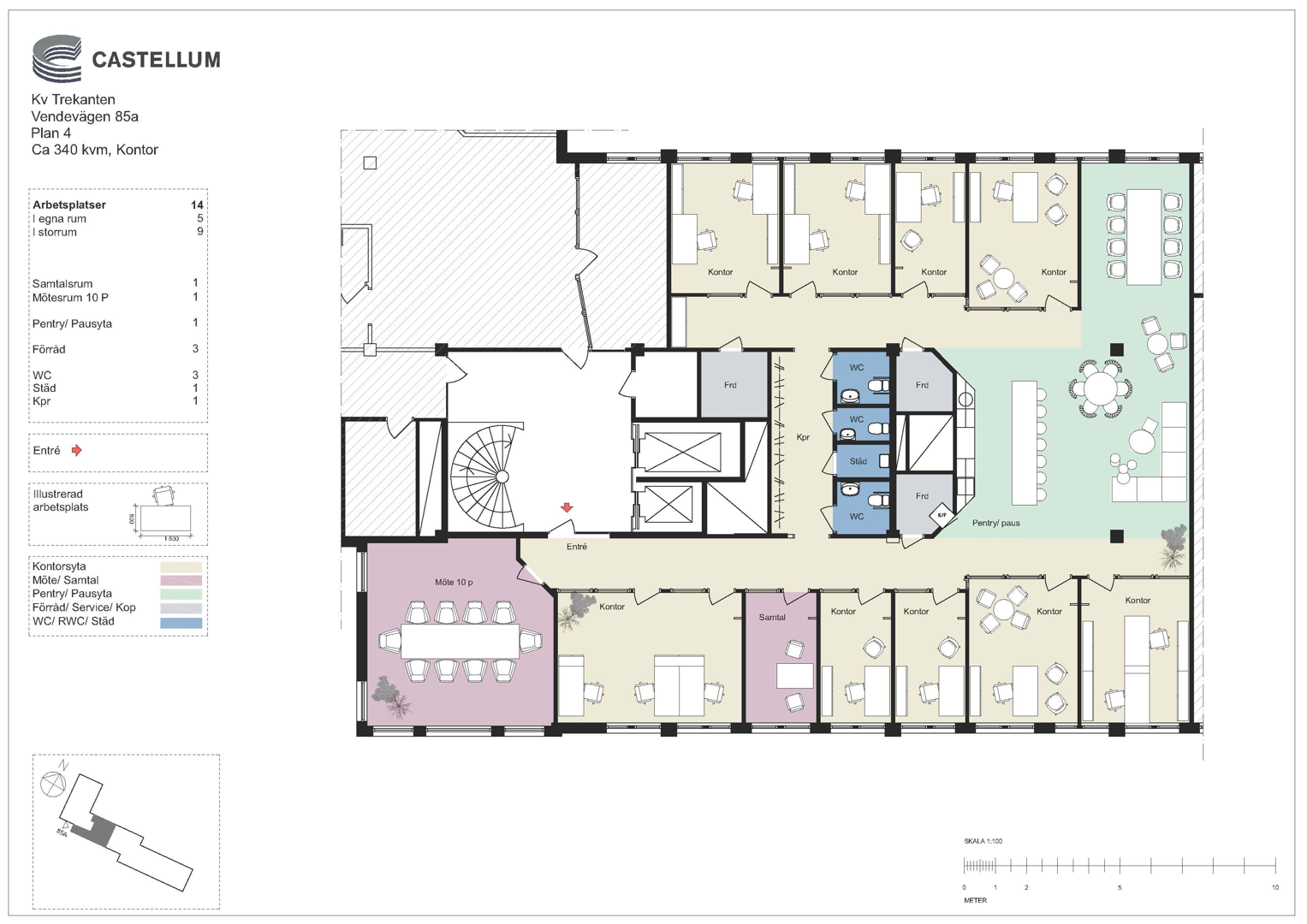 Planlösningen består av mötesrum för upp till 10 personer, pentry/pausyta, och ett antal enskilda kontorsrum samt öppna kontorsytor. Här finns totalt 14 arbetsplatser i egna rum och 5 arbetsplatser i en storrumslösning.
