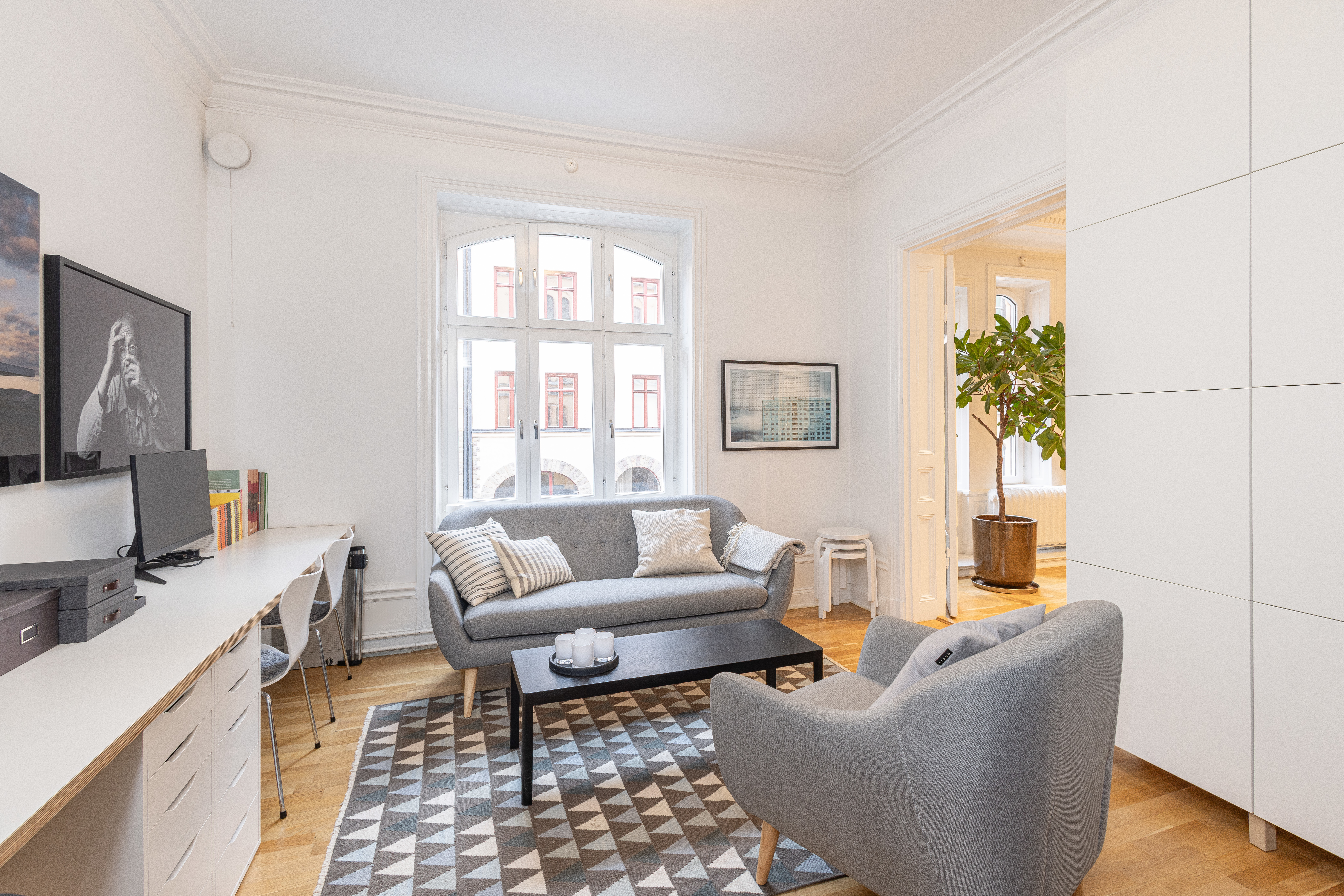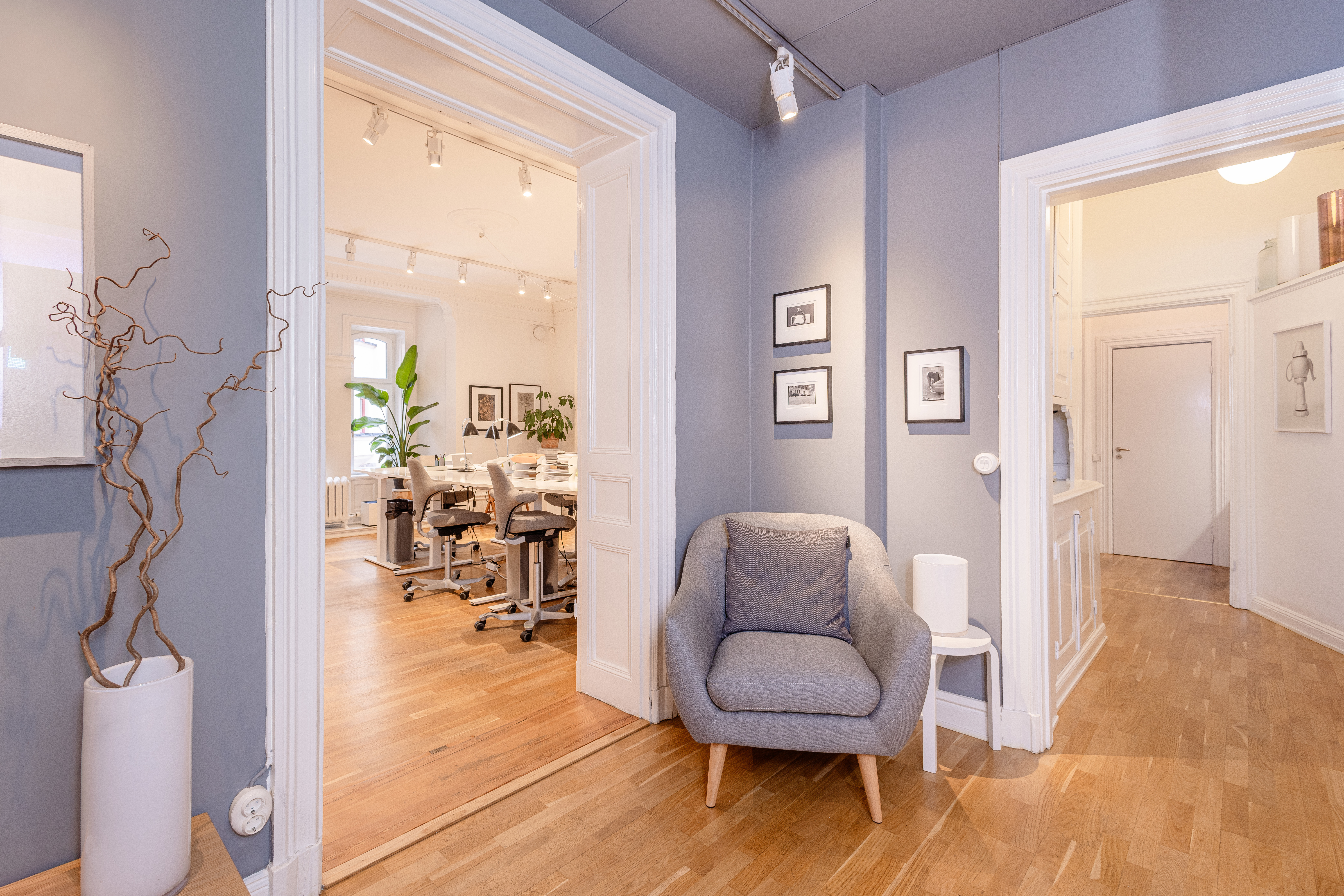 Detta kontor måste upplevas på plats med sina många charmiga detaljer som en fantastisk takrymd, stuckaturer, höga spegeldörrar, vackra parkettgolv, serveringsgångar m m. Lokalen har de senaste åren genomgått en genomgående uppfräschning. Ytan består av tre vackra rum i fil mot gatan, mindre pentry, wc och dusch. Eventuellt kan en separat källarlokal om 80 kvm hyras genom hyresvärden.