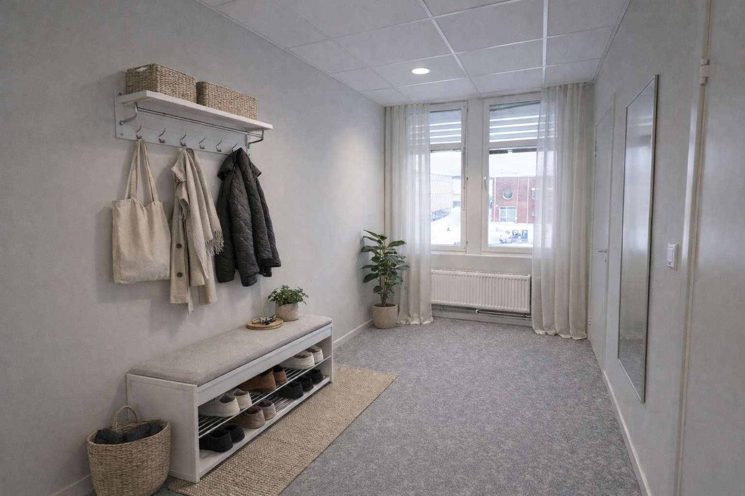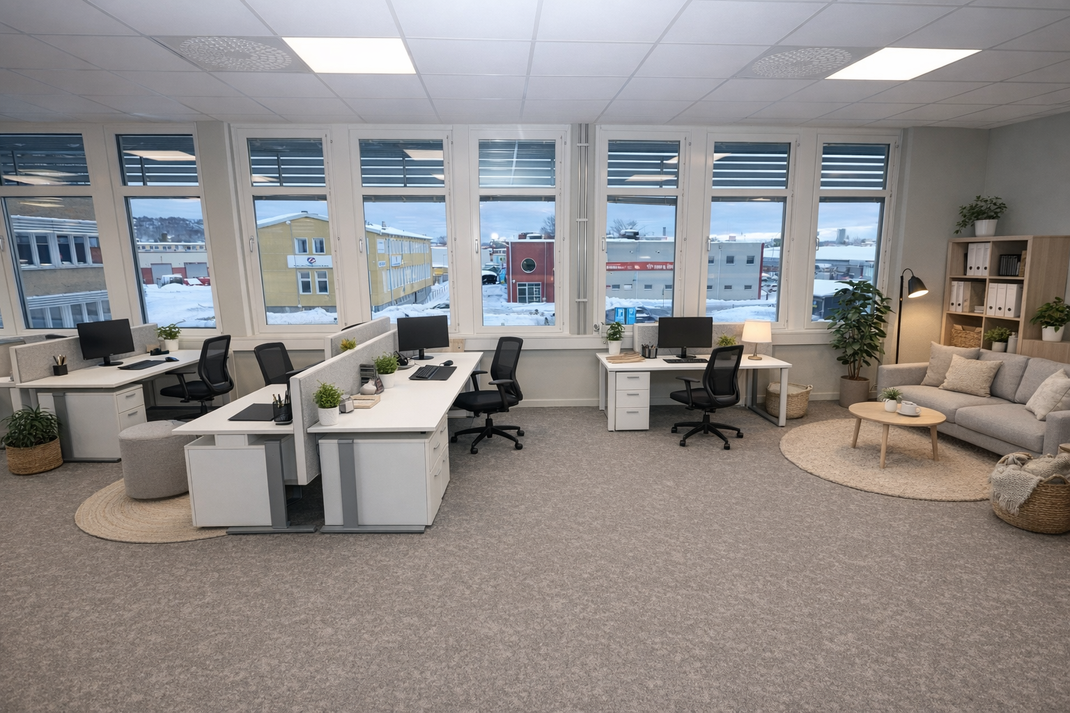 Ytskikten bidrar till en trivsam arbetsmiljö med ljuddämpande textilmattor samt akustikundertak. Belysningen består av dimbara led-plattor.