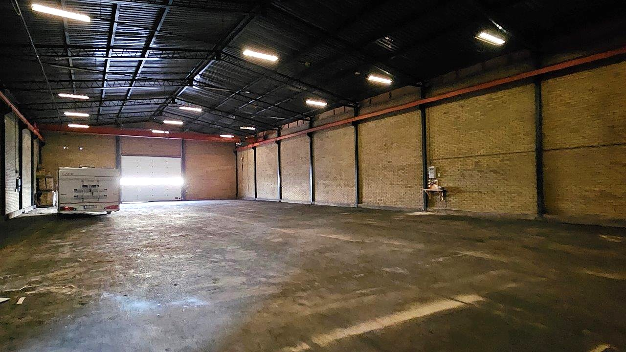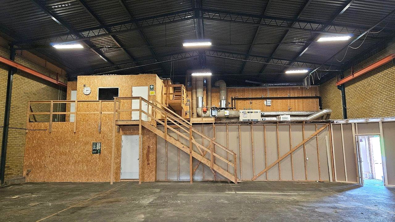 Stor öppen kallställd lager/verkstadsyta. Längst in i lokalen finns en enklare byggnation för personalytor i form av pentry, toalett och varmförråd.