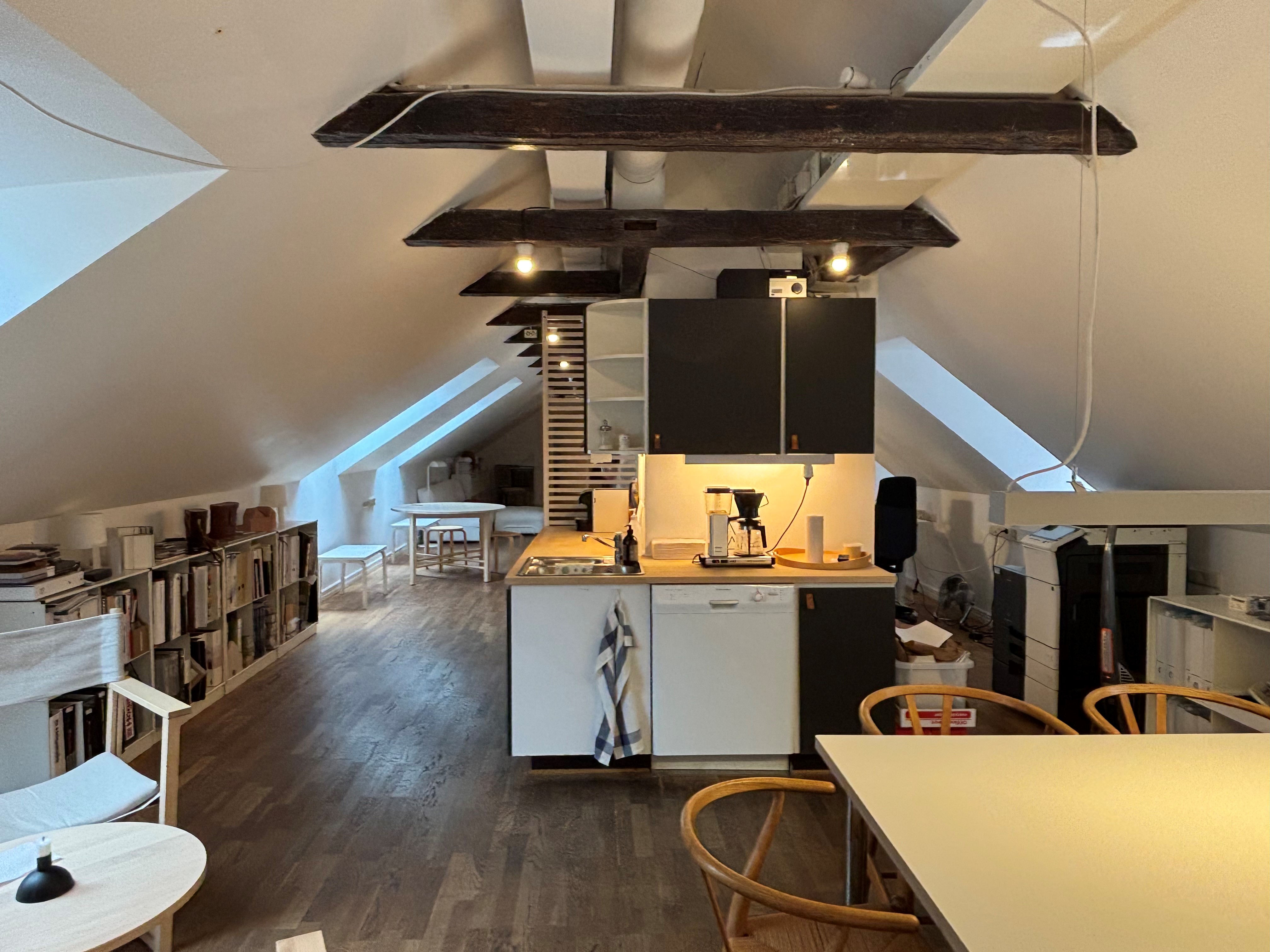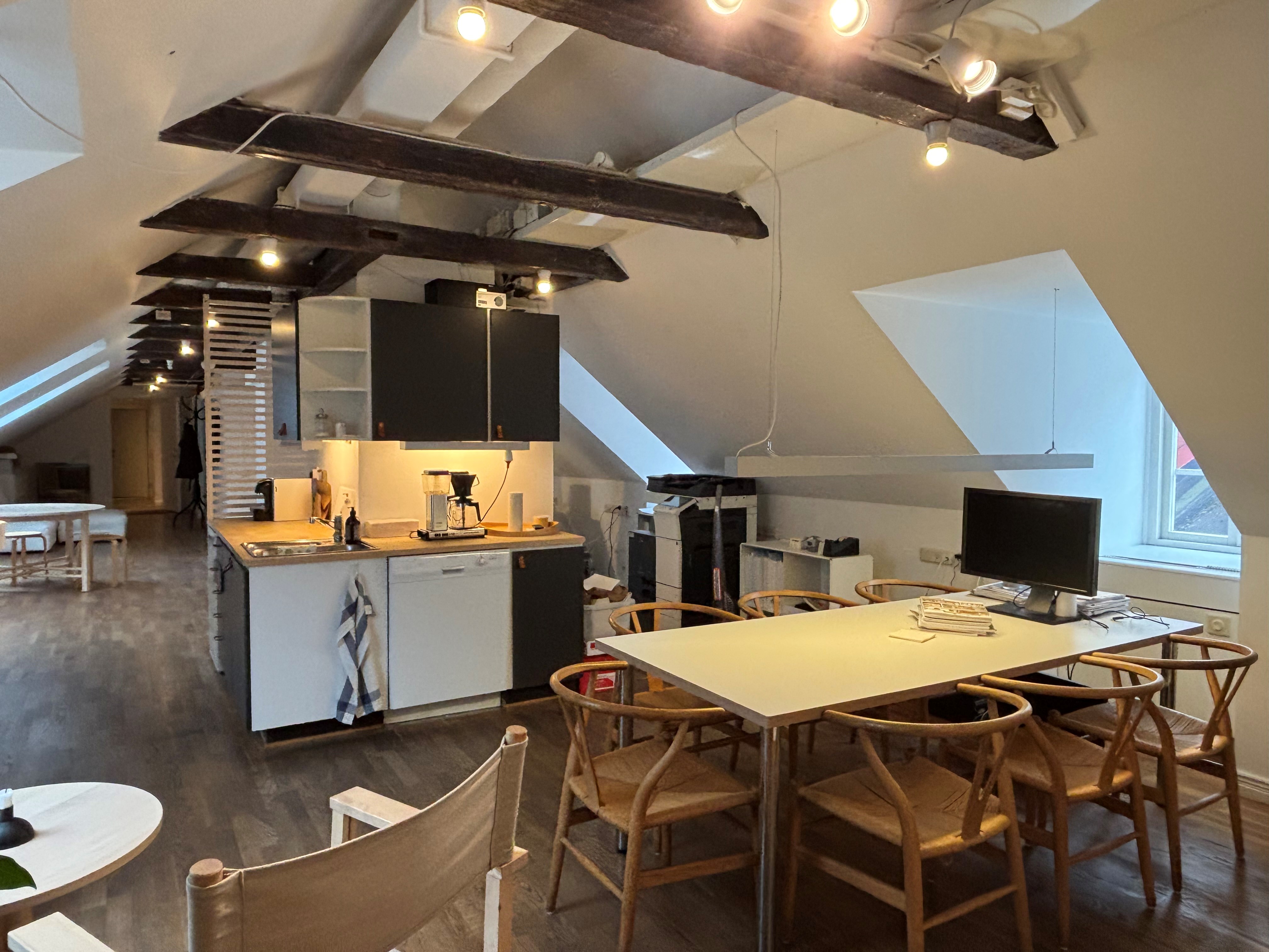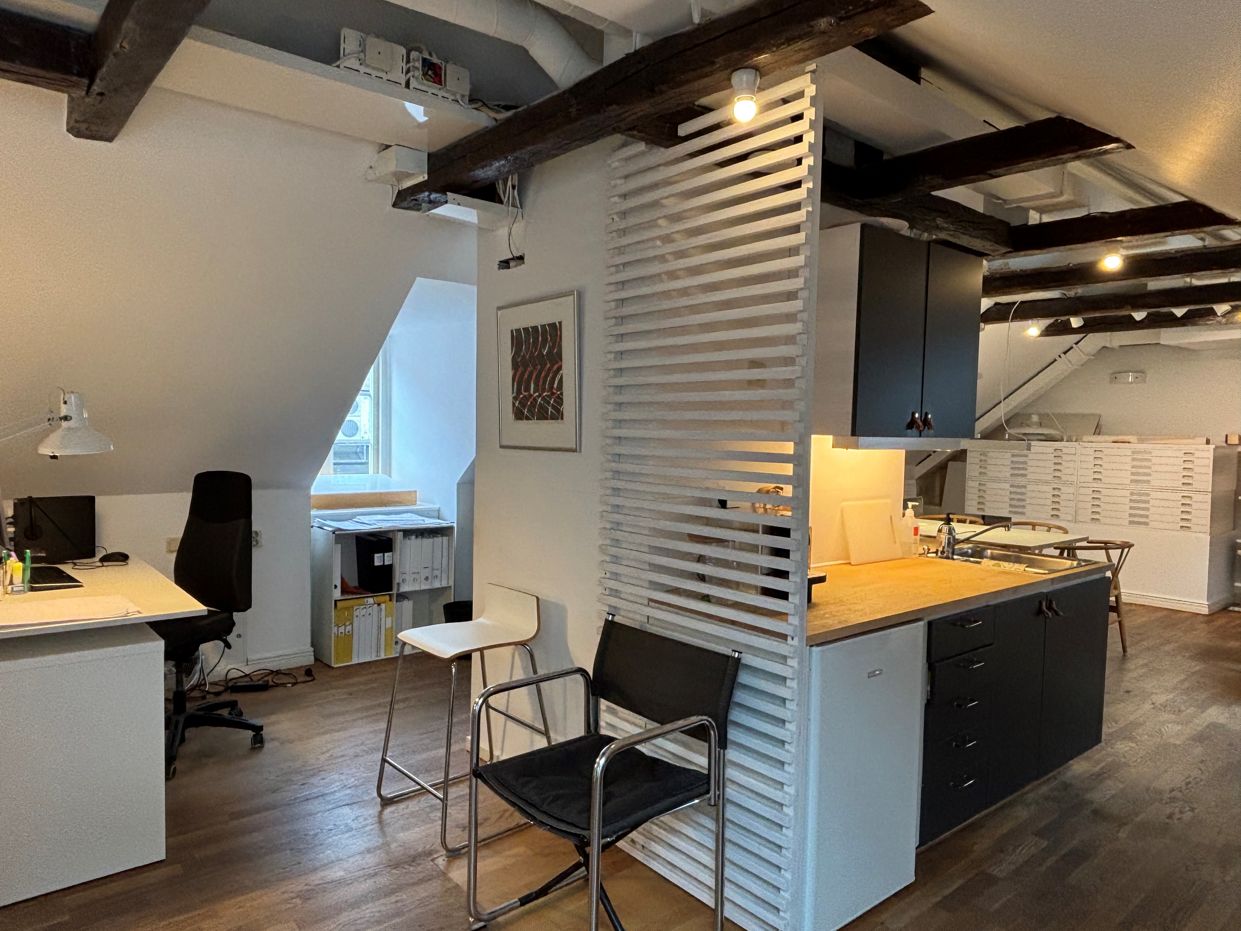 Charmig kontorslokal med takbjälkar i äldre fastighet precis intill Stortorget. Här erbjuds en lokal med öppen planlösning högst upp i huset. Lokalen har ett större kontors/mötesrum och fräscht kök. Två toaletter finns att tillgå.