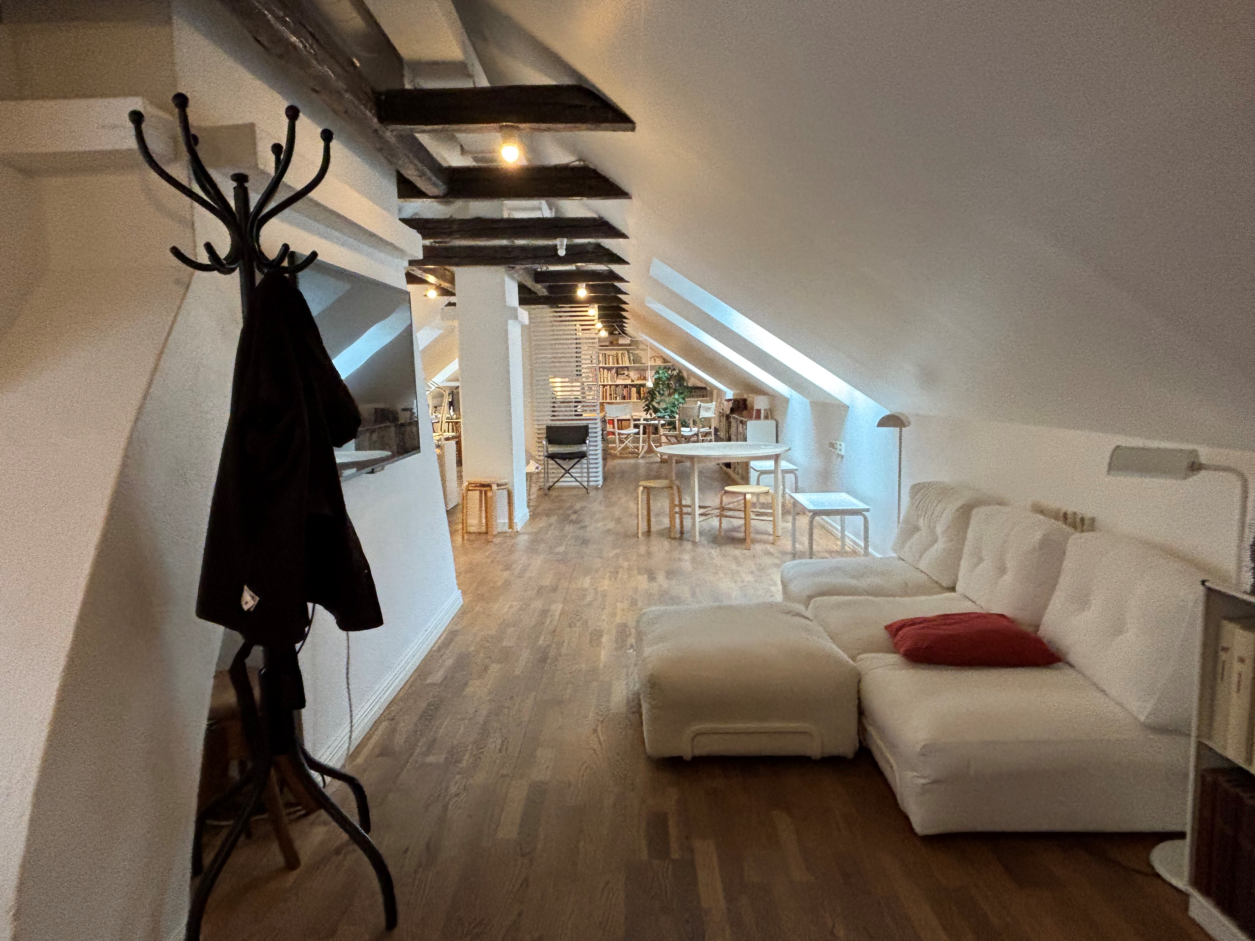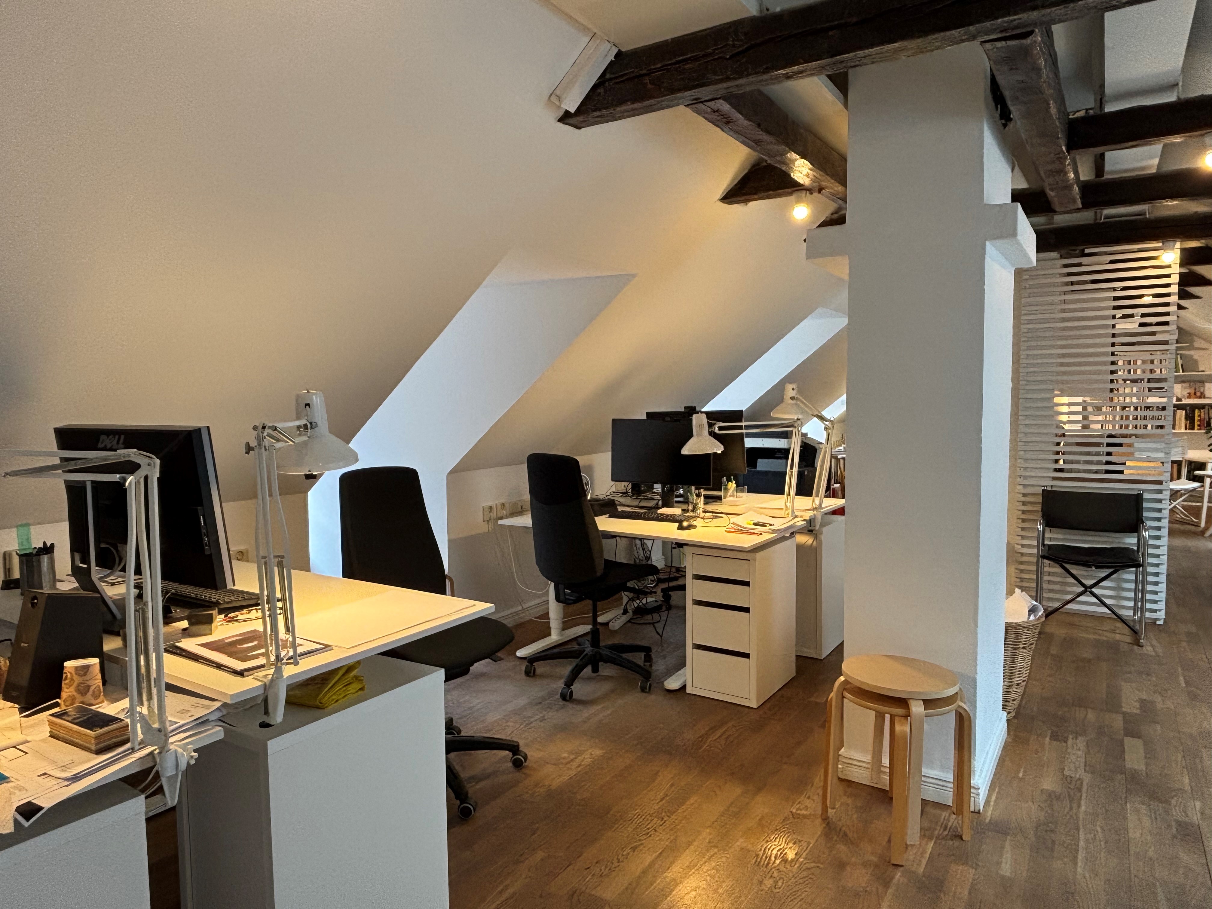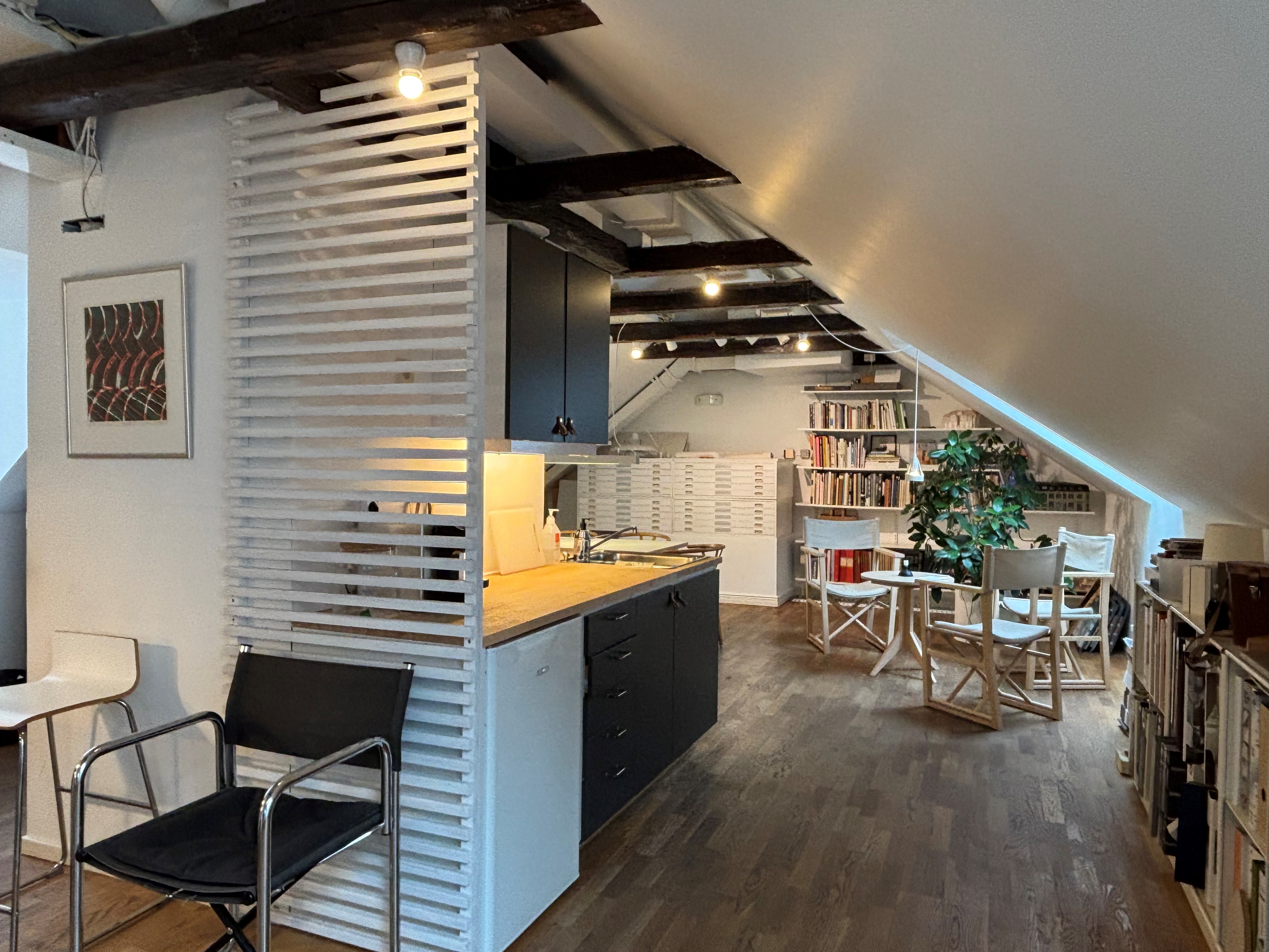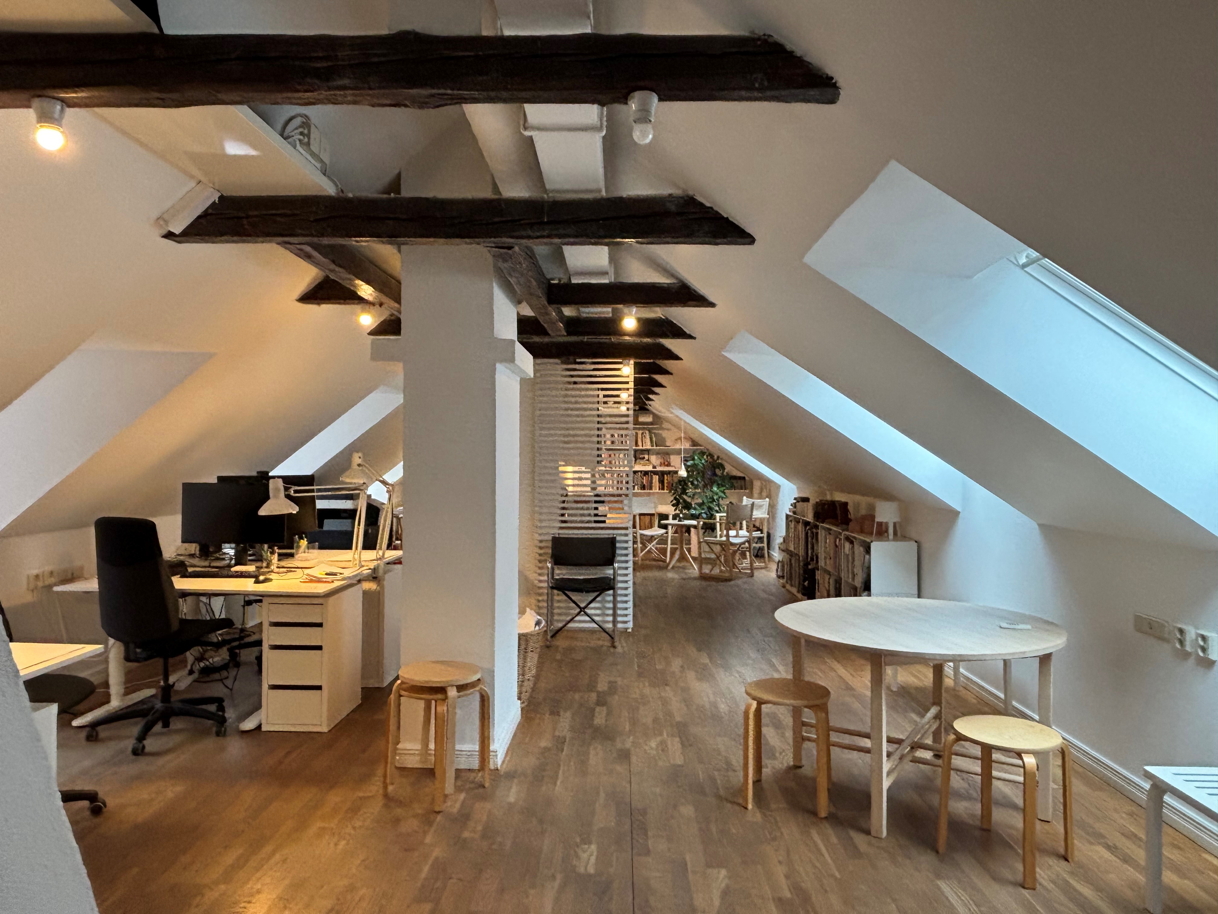 Charmig kontorslokal med takbjälkar i äldre fastighet precis intill Stortorget. Här erbjuds en lokal med öppen planlösning högst upp i huset. Lokalen har ett större kontors/mötesrum och fräscht kök. Två toaletter finns att tillgå.