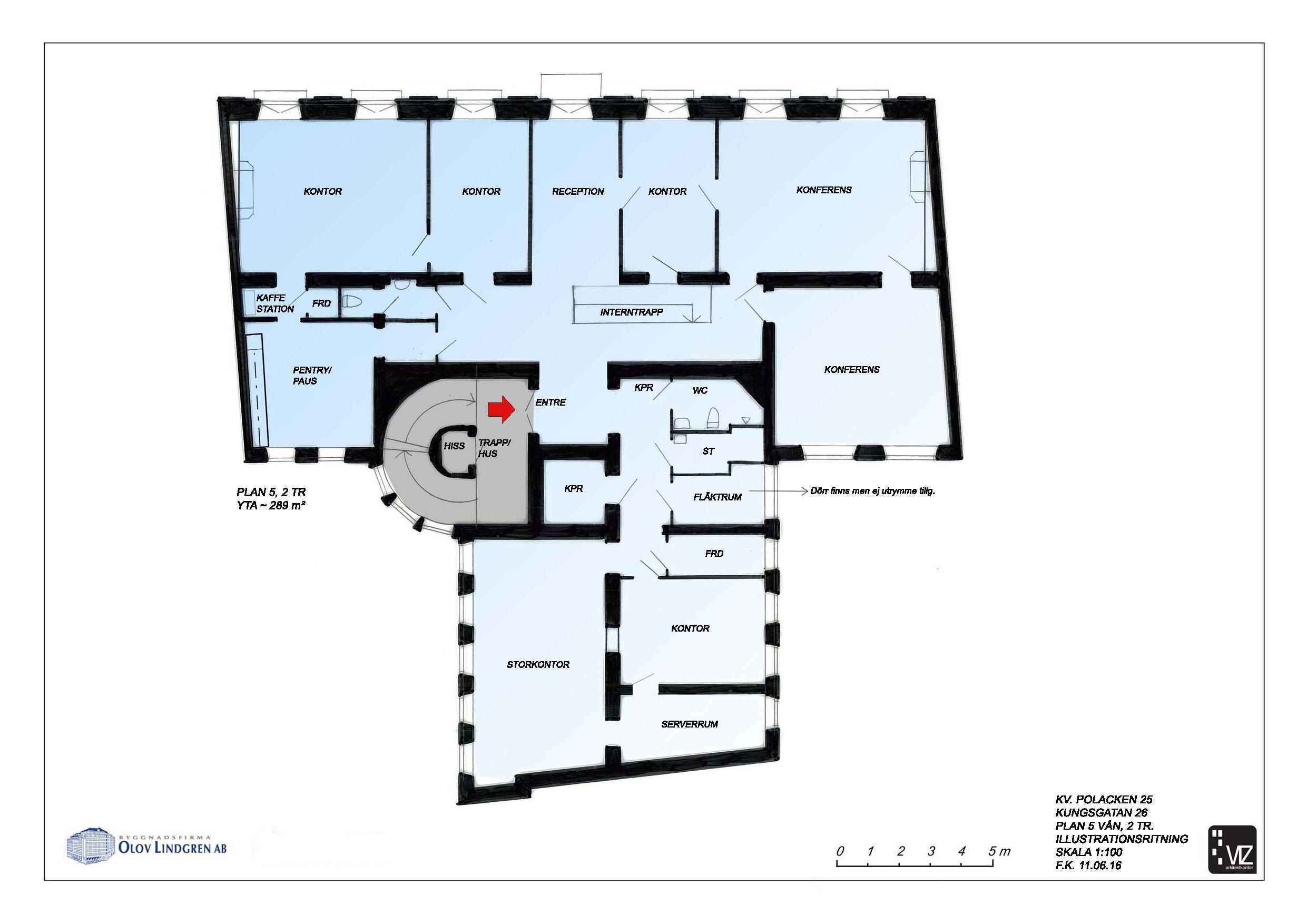 I lokalen finns en interntrappa mellan de två våningsplan som kontoret fördelar sig på. På lokalens första våning finner du en reception, pentry, två konferensrum samt ett flertal kontorsrum i olika storlekar.