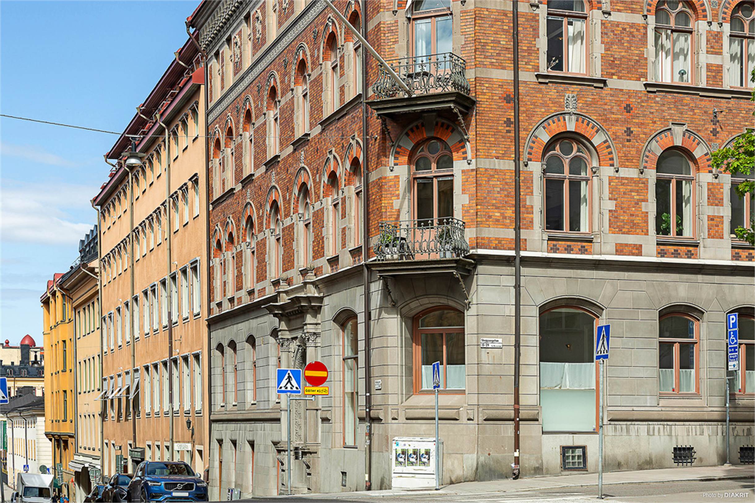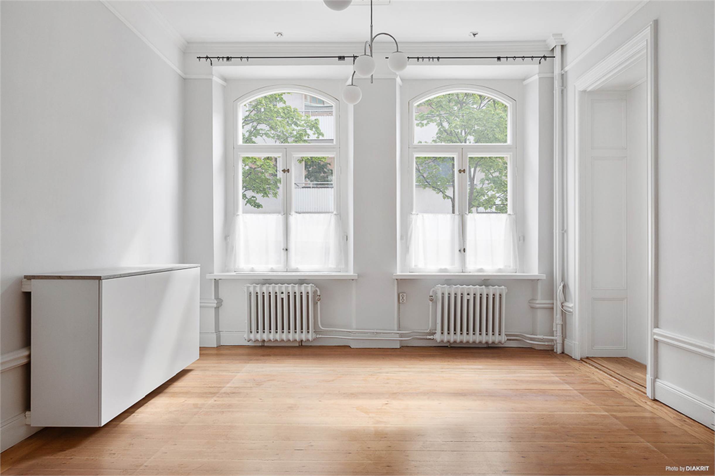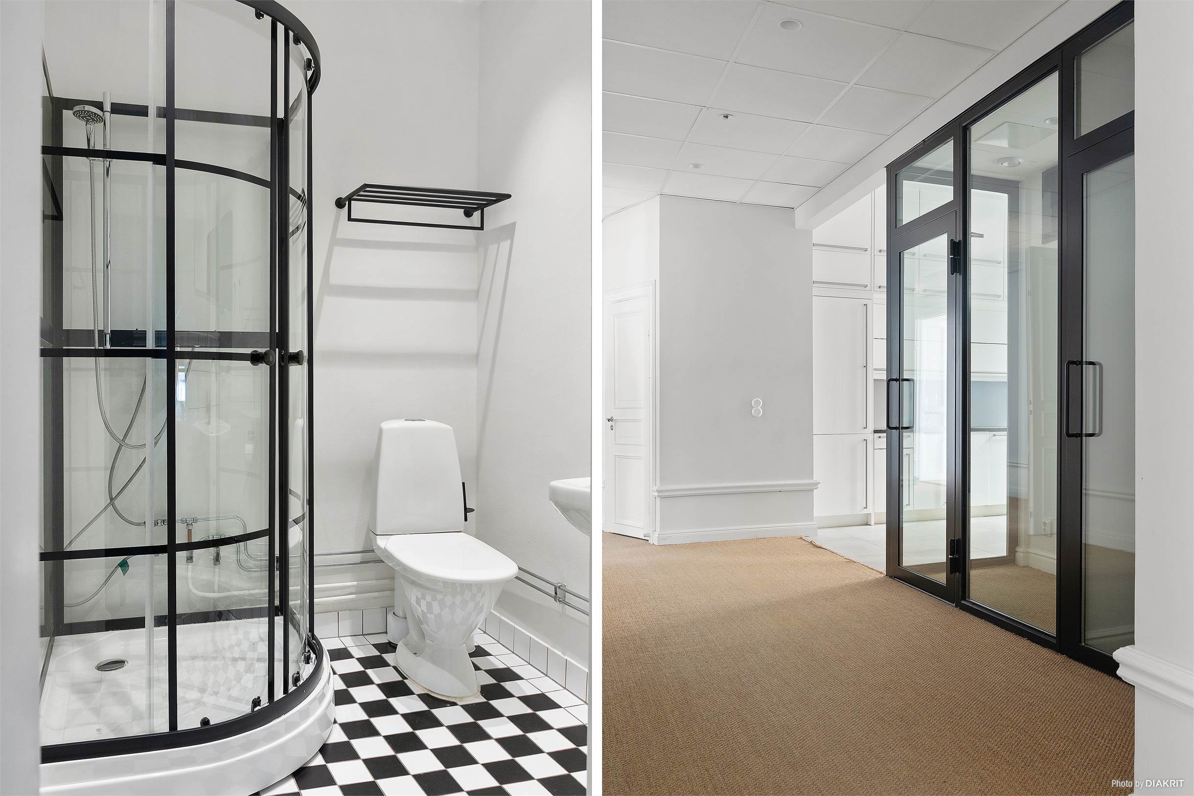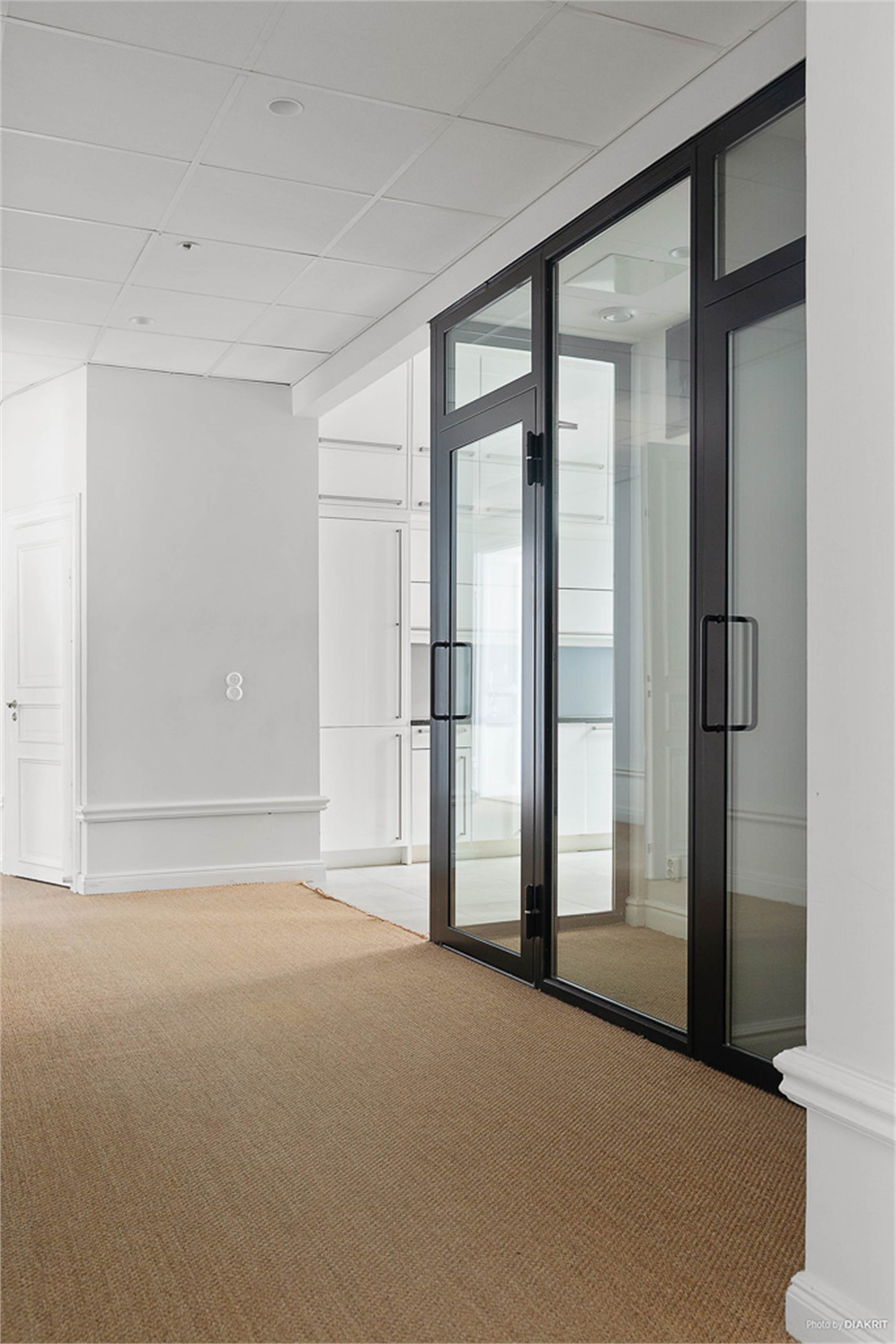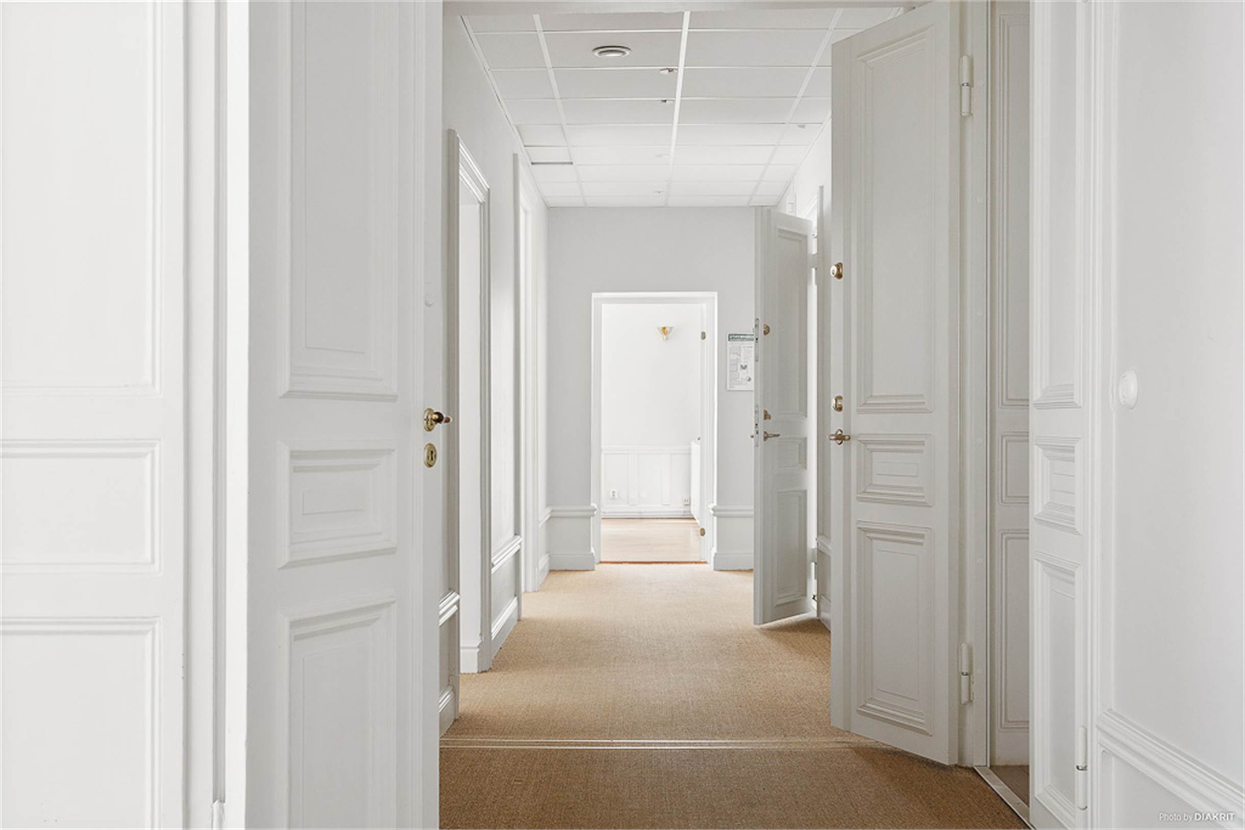 Fin hall med två ingångar och gott om plats. Direkt till höger när man kommer in via den första ingången finns ett stort hörnrum med fantastiskt ljusinsläpp. Rakt fram i hallen finns flera rymliga rum med fina fönster. En bit ner i lokalen på den vänstra sidan finns ett påkostat kök med utsikt mot gården. Innanför köket finns ett rum med avskilt läge och fönster mot gården samt möjlig utgång till trapphus. I denna del av lokalen finns ytterligare två rum samt två tysta rum. Här finns även två wc, varav den ena med dusch.