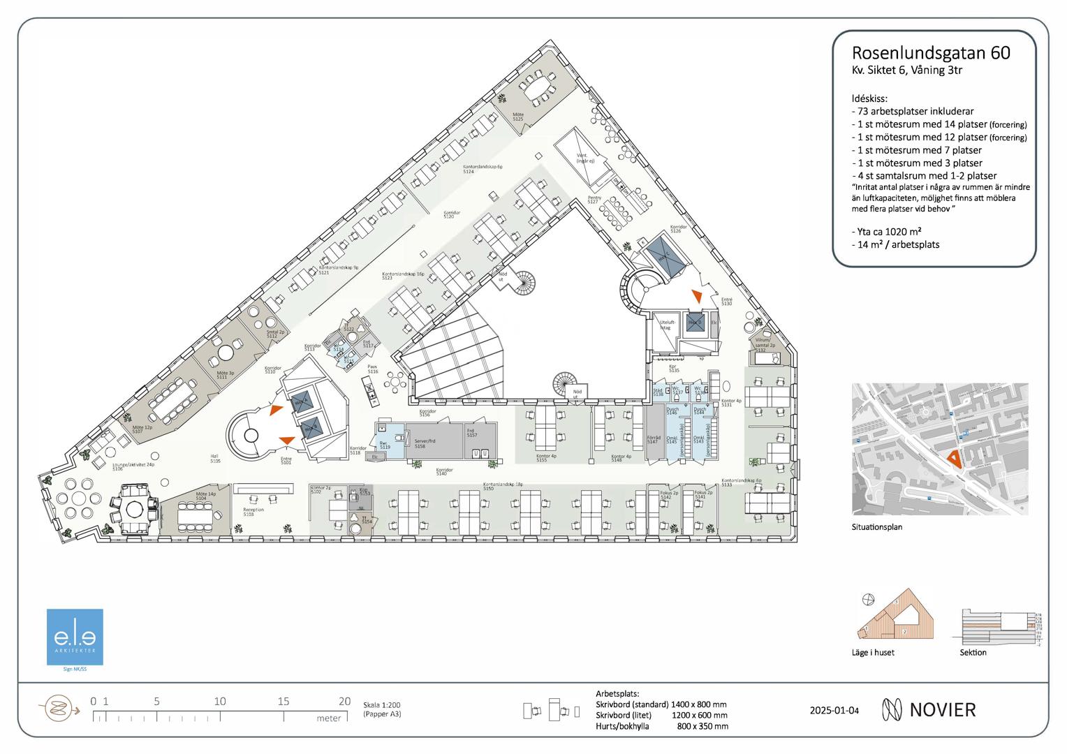 Lokalen rymmer kontorslandskap, flera mötesrum i olika storlekar, lounge, pentry och omklädningsrum. En effektiv planlösning som stödjer både samarbete och fokus.