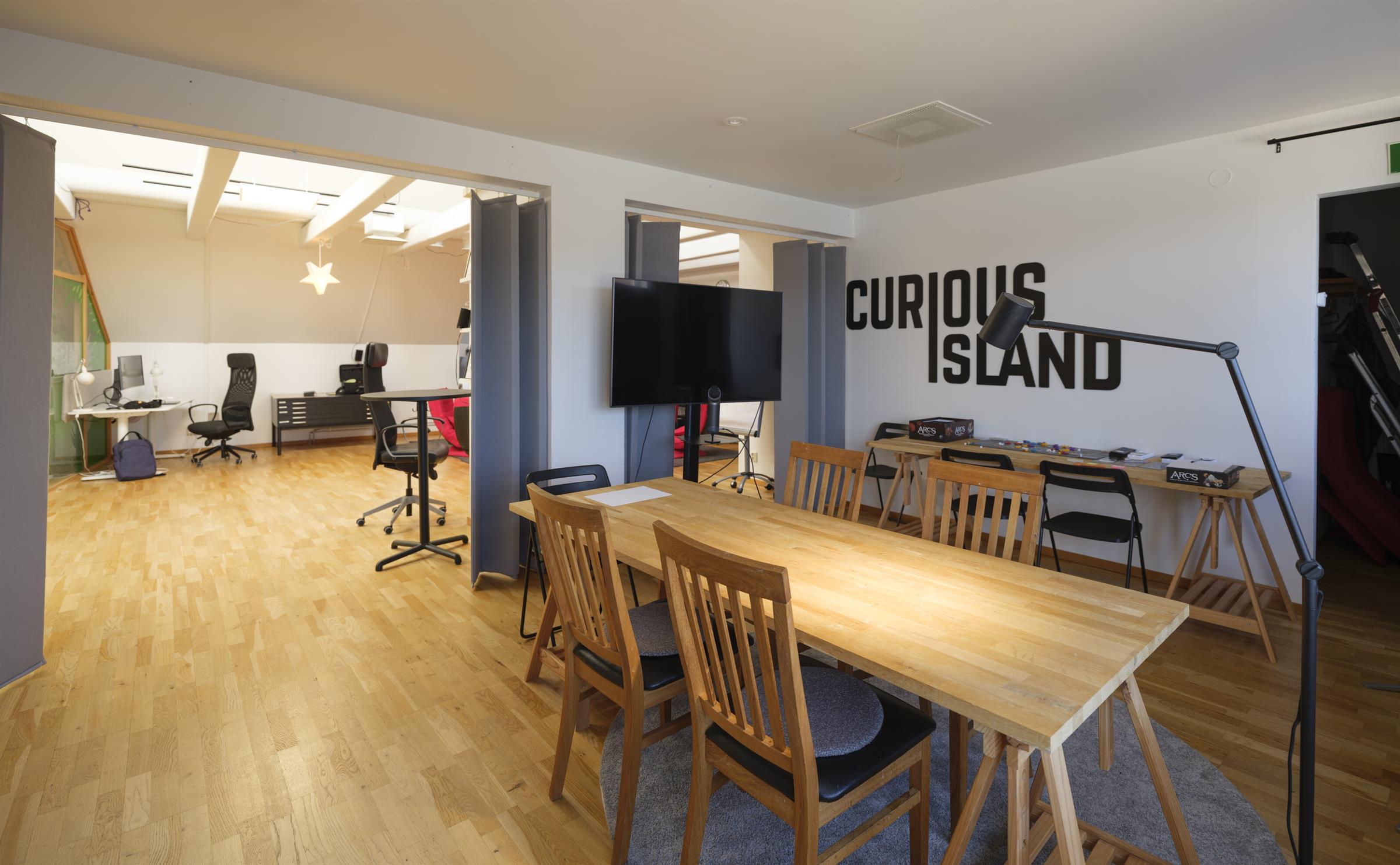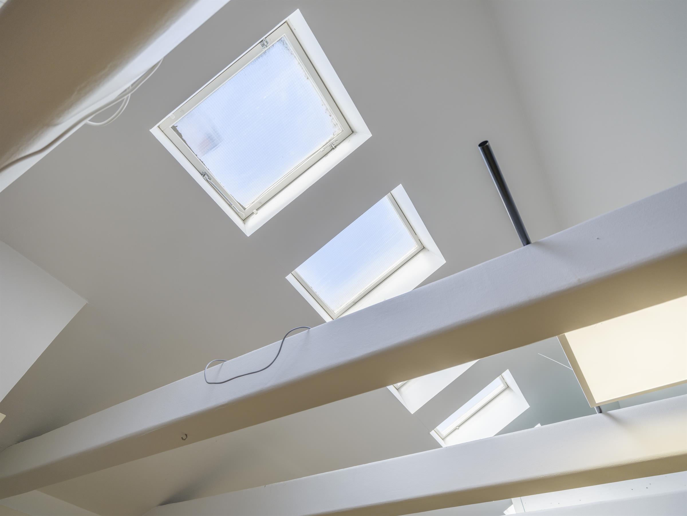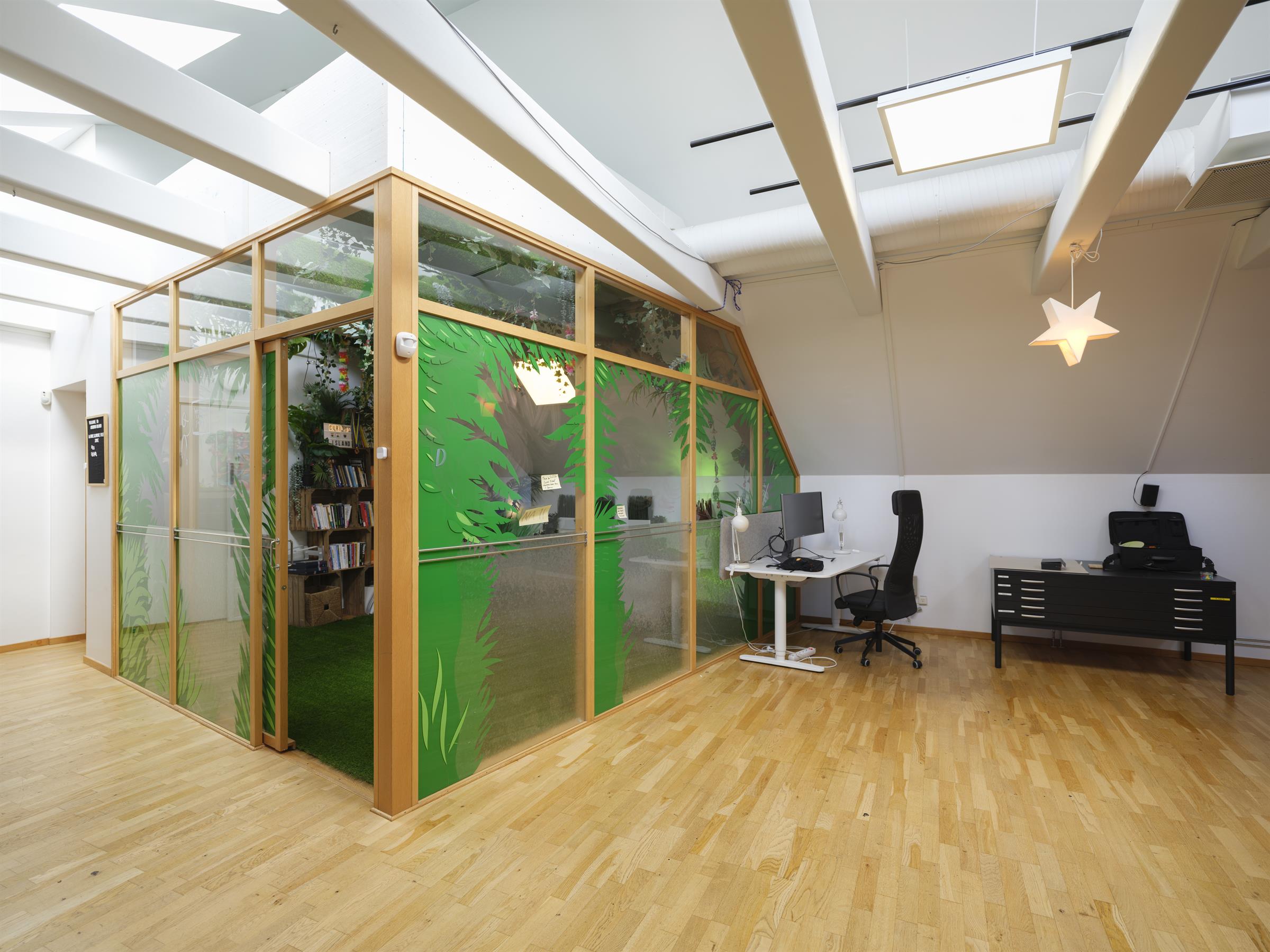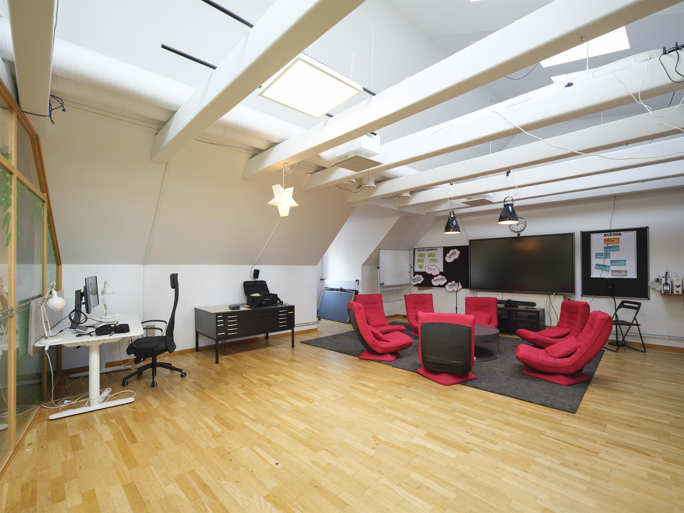Balkong med utsikt över gågatan. Ljus öppen kontorsyta med takfönster. Vindsvåning med synliga takbjälkar och hög takhöjd. Ljus öppen kontorsyta med takfönster. Arbetsyta med plats för både möten och gemensamma ytor. Ljus arbetsyta med mötesplats. Öppen arbetsyta med charmig karaktär. Pentry med fönster och förvaring. Takfönster som släpper in gott om dagsljus i lokalen.