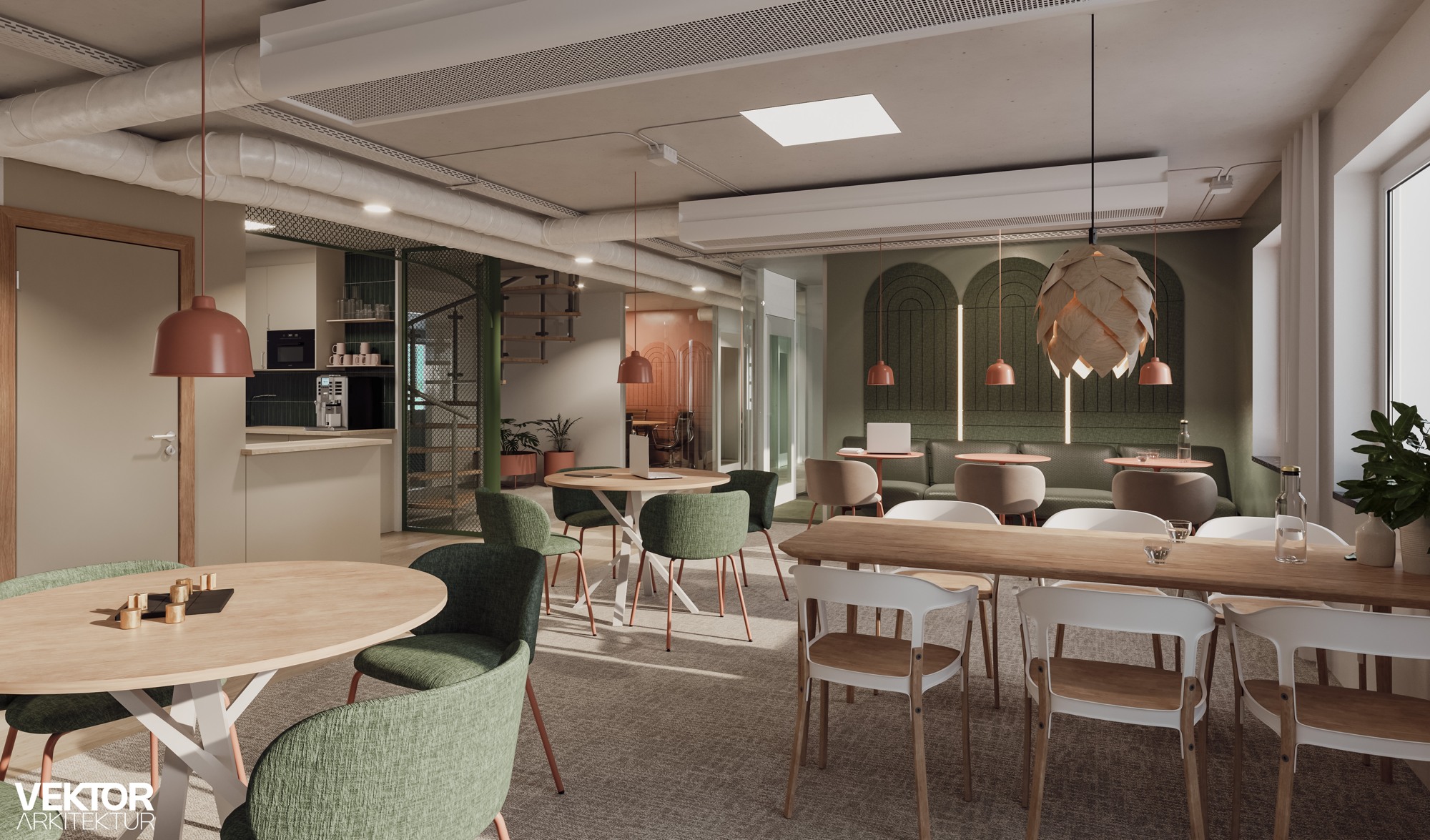 Kontoret sträcker sig över två plan, på våning 4 och högst upp i huset på våning 5, och binds ihop med en spiraltrappa mitt i lokalen.