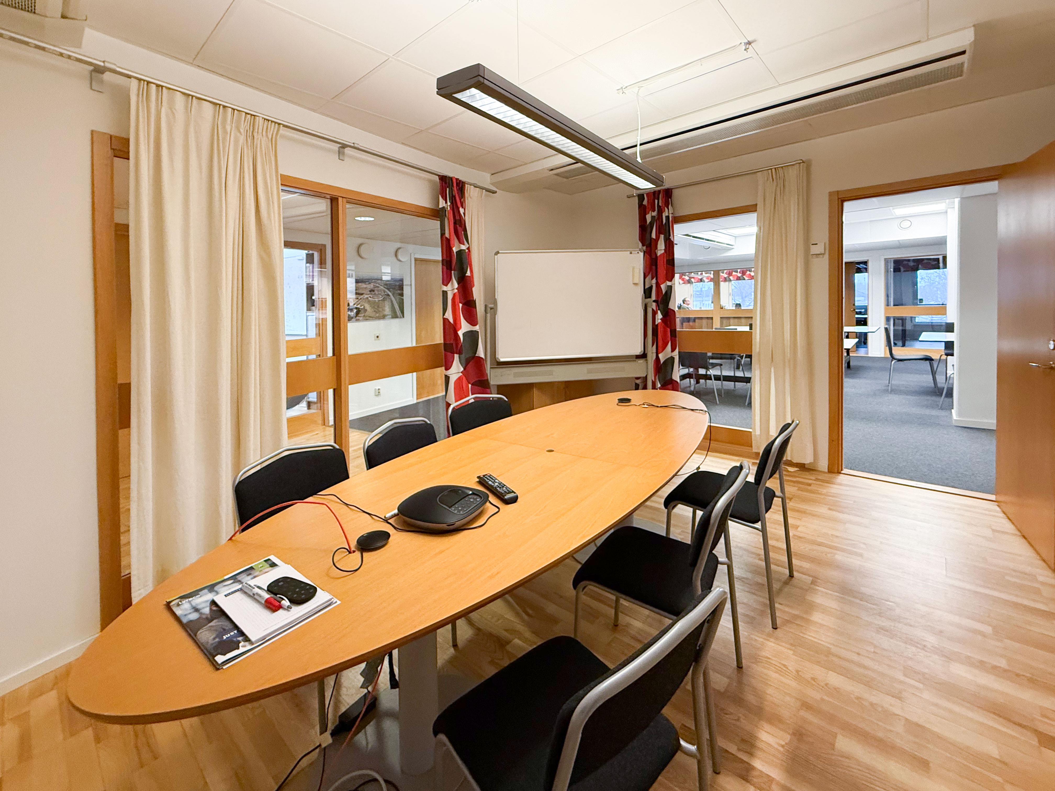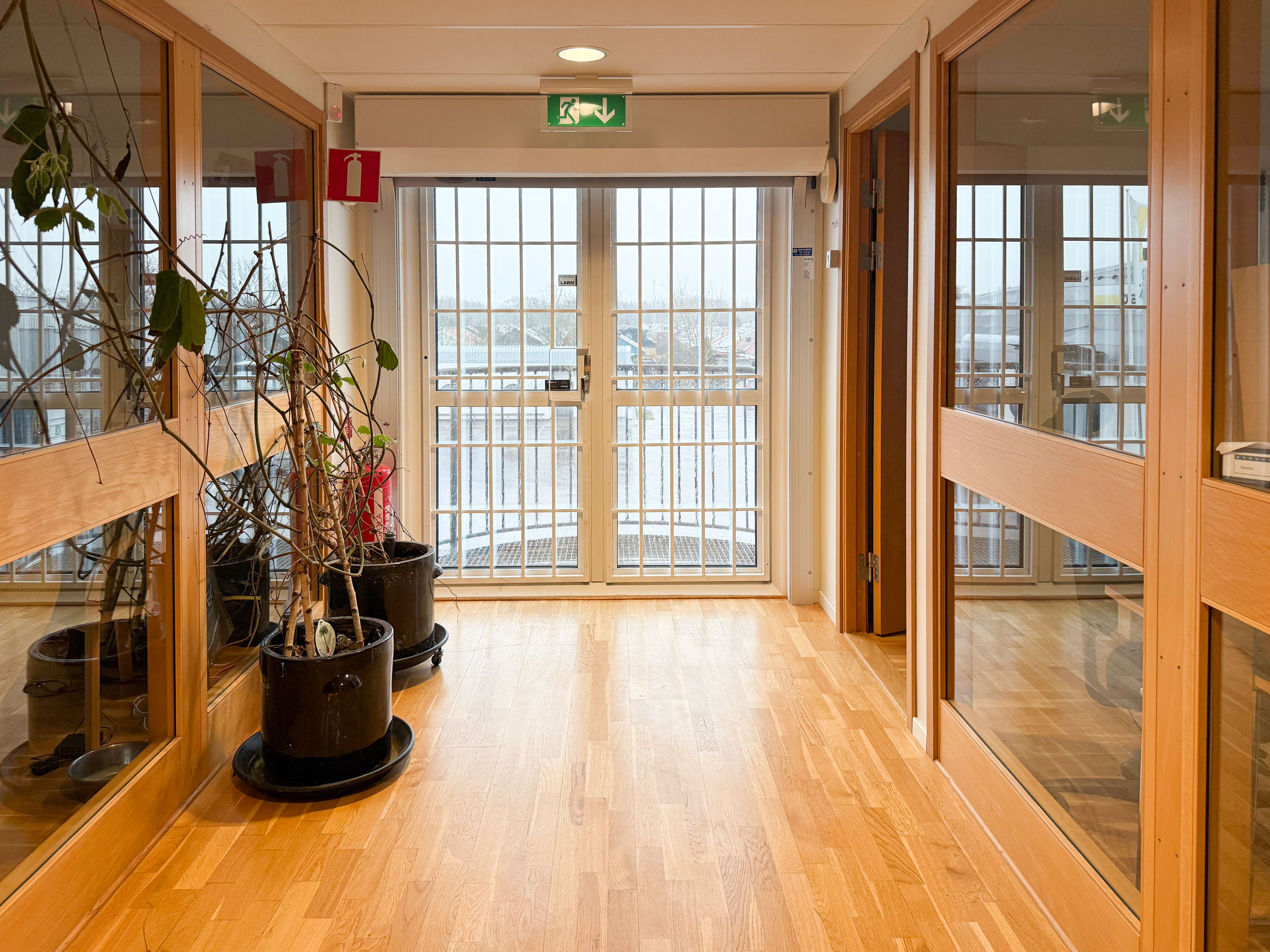 Planlösningen är effektiv och tydligt strukturerad med två sammanhängande flyglar som binds ihop av en central passage. Entré sker via trapphus och hiss centralt i lokalen, där även receptionen är placerad. Runt den inre kärnan finns mötesrum, konferensrum och ett separat utbildningsrum, medan ett stort antal enskilda kontorsrum är placerade längs fasaderna med gott ljusinsläpp. Pausrum och pentryytor samt WC-grupper är samlade centralt tillsammans med interna stödfunktioner och förråd.