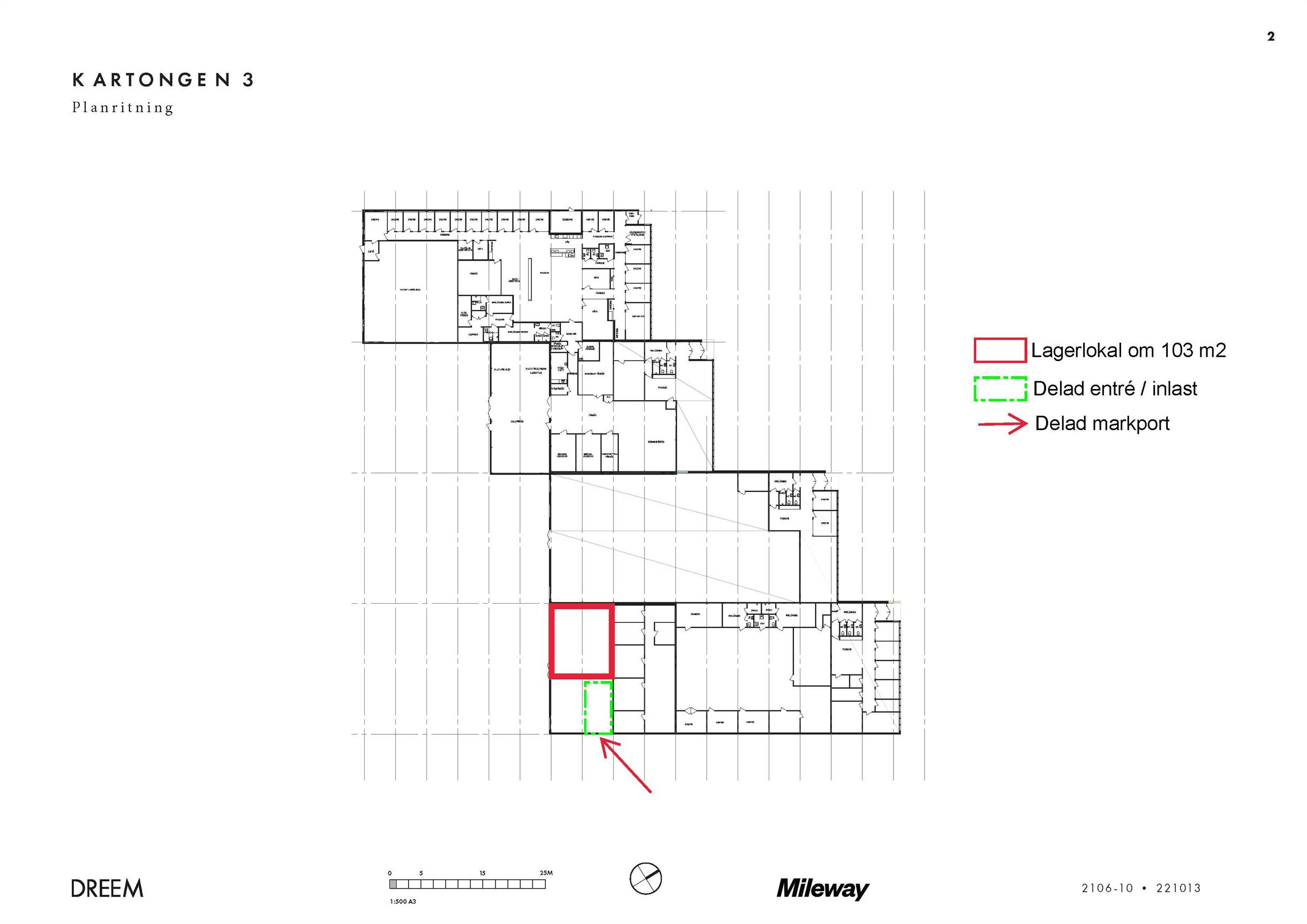 Ledig lagerlokal om 103 kvadratmeter med delad markport (separat låst port in till lokalen). Det finns fri parkering i anslutning till byggnaden. Energieffektiv LED-belysning.