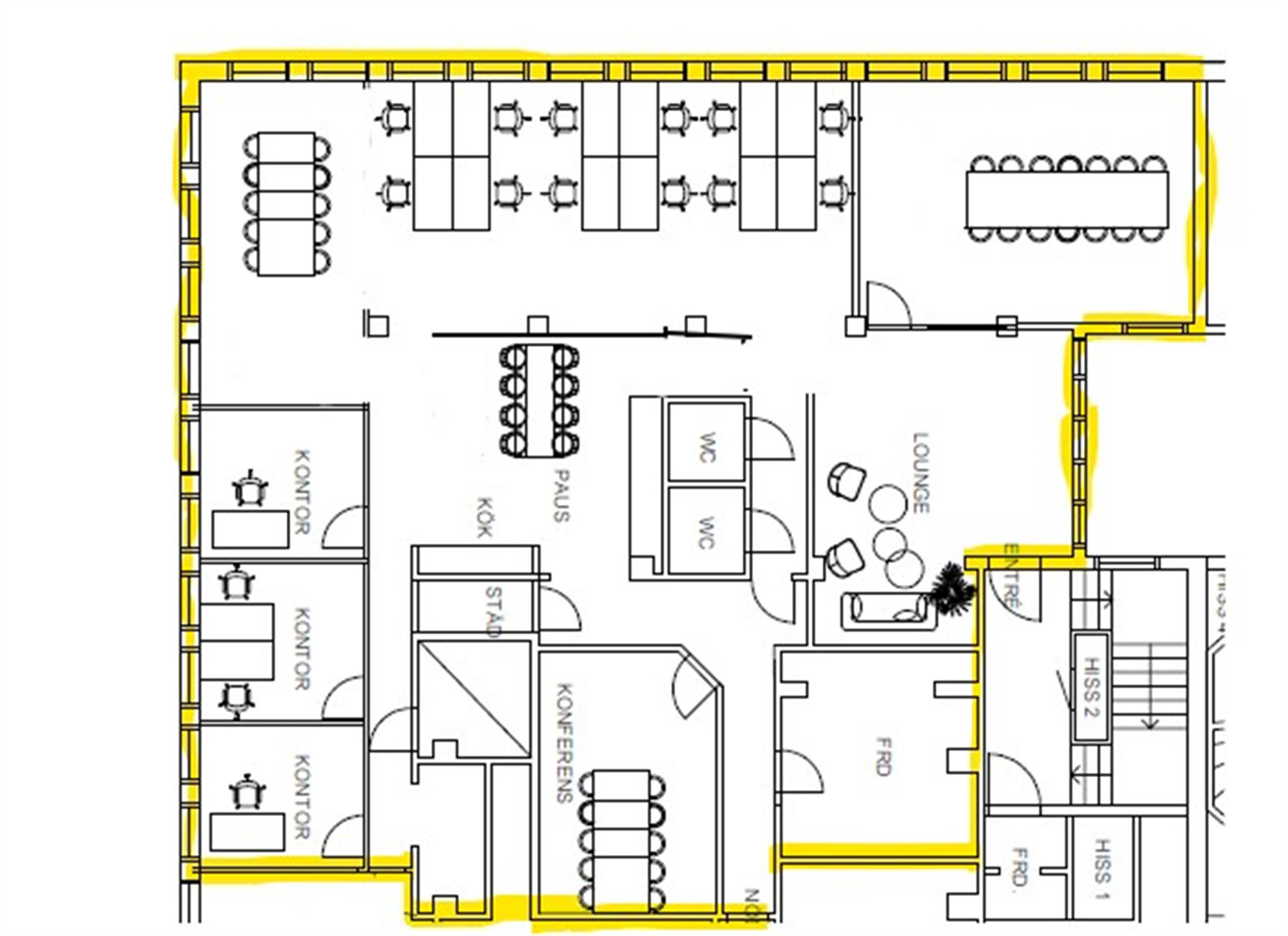 Fint härligt kök centralt placerat i lokalen. Öppna kontorsytor samt flera kontor och projektrum. Möjlighet att installera ett par teamspoddar. Stort konferensrum. De separata kontoren kan omvandlas till mötesrum. Flexibelt kontor med fantastisk utsikt över vattnet!