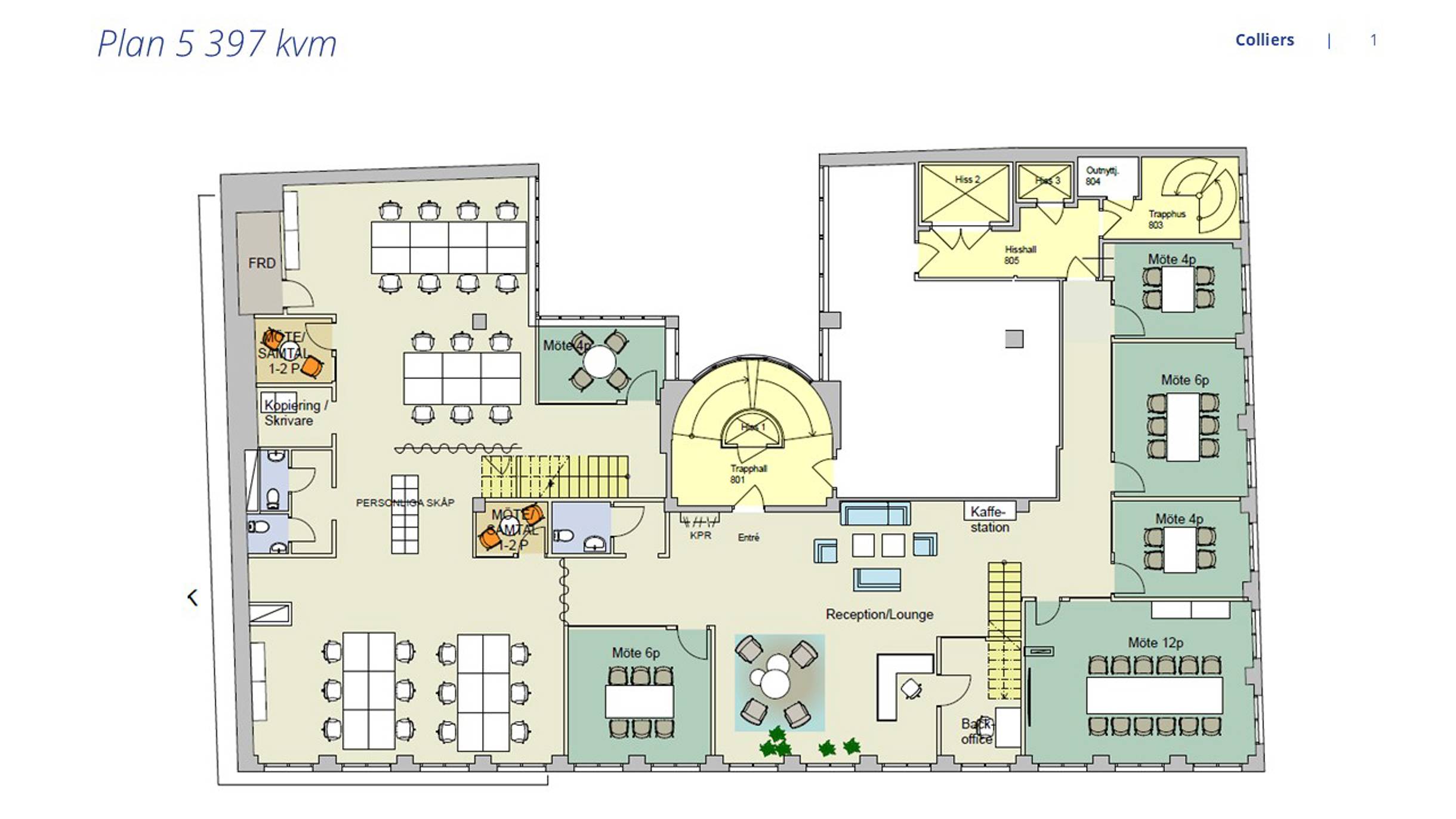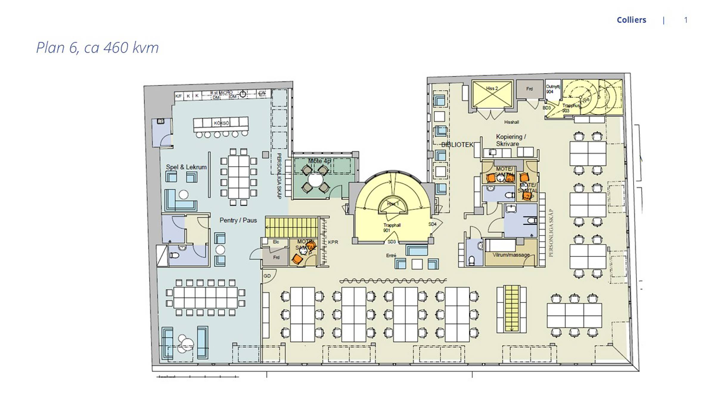 Lokalen ligger på plan 5 och 6 och är fördelad på 397 respektive 460 kvm med en interntrappa. Planlösningen är öppen och lokalen har stora fönster som vetter ut mot Sveavägen och Observatorielunden. Lokalen har hög standard med ett stort modernt pentry på plan 6 och flertalet mötesrum. Här finns alltså möjlighet att hyra bara ett våningpslan eller båda  med en total  yta om 857 kvm.