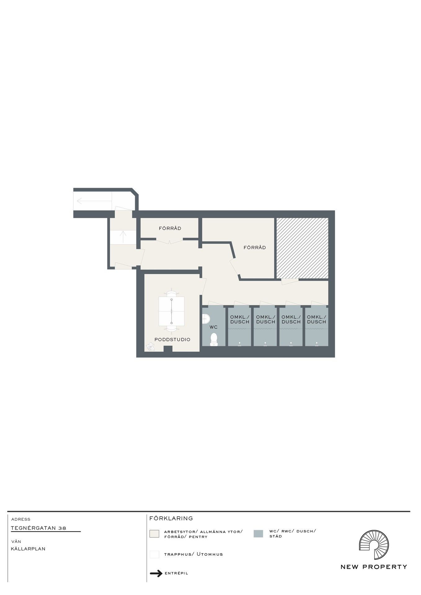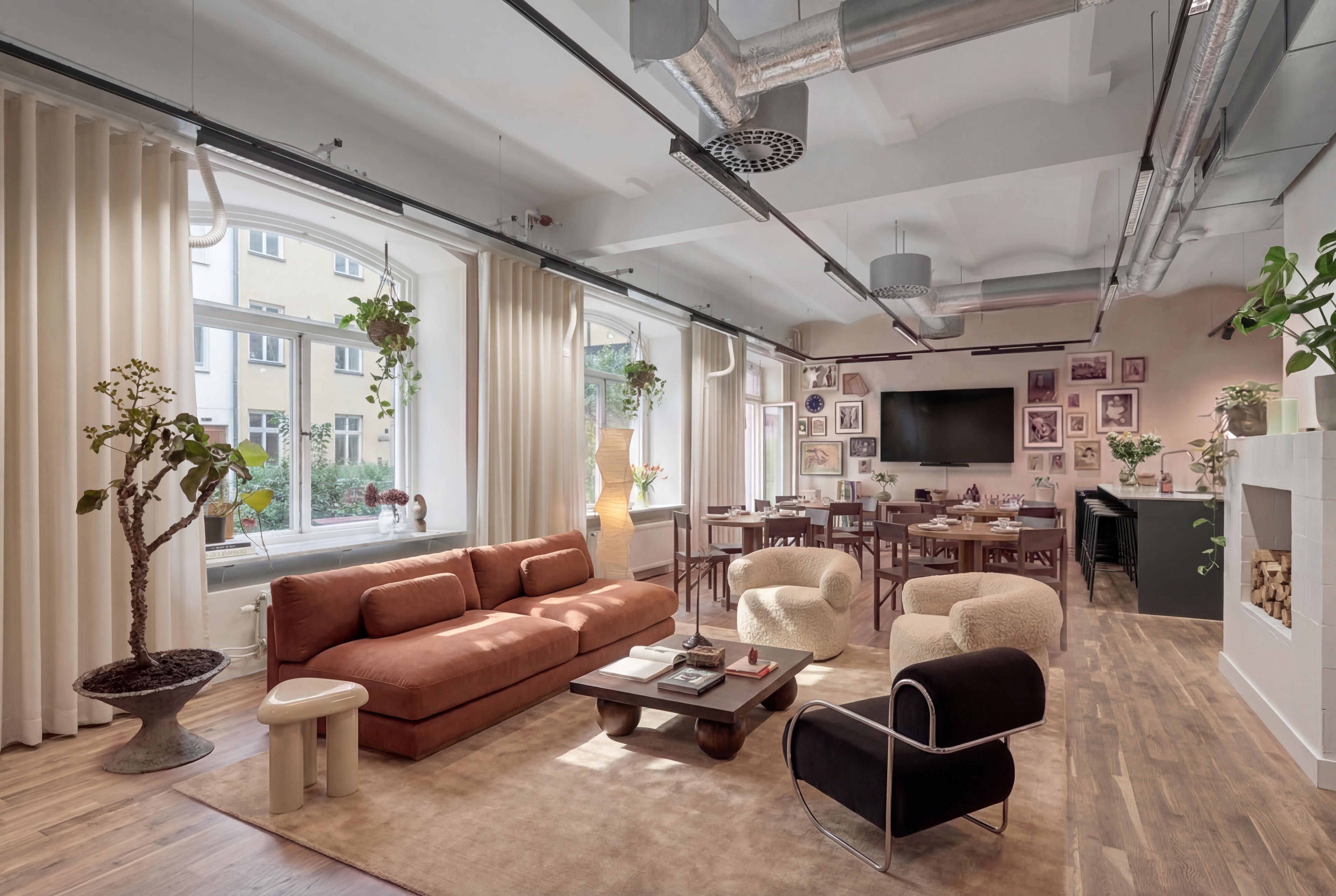 Extra bekvämligheter: Duschar, omklädningsrum och en poddstudio i källarplan.