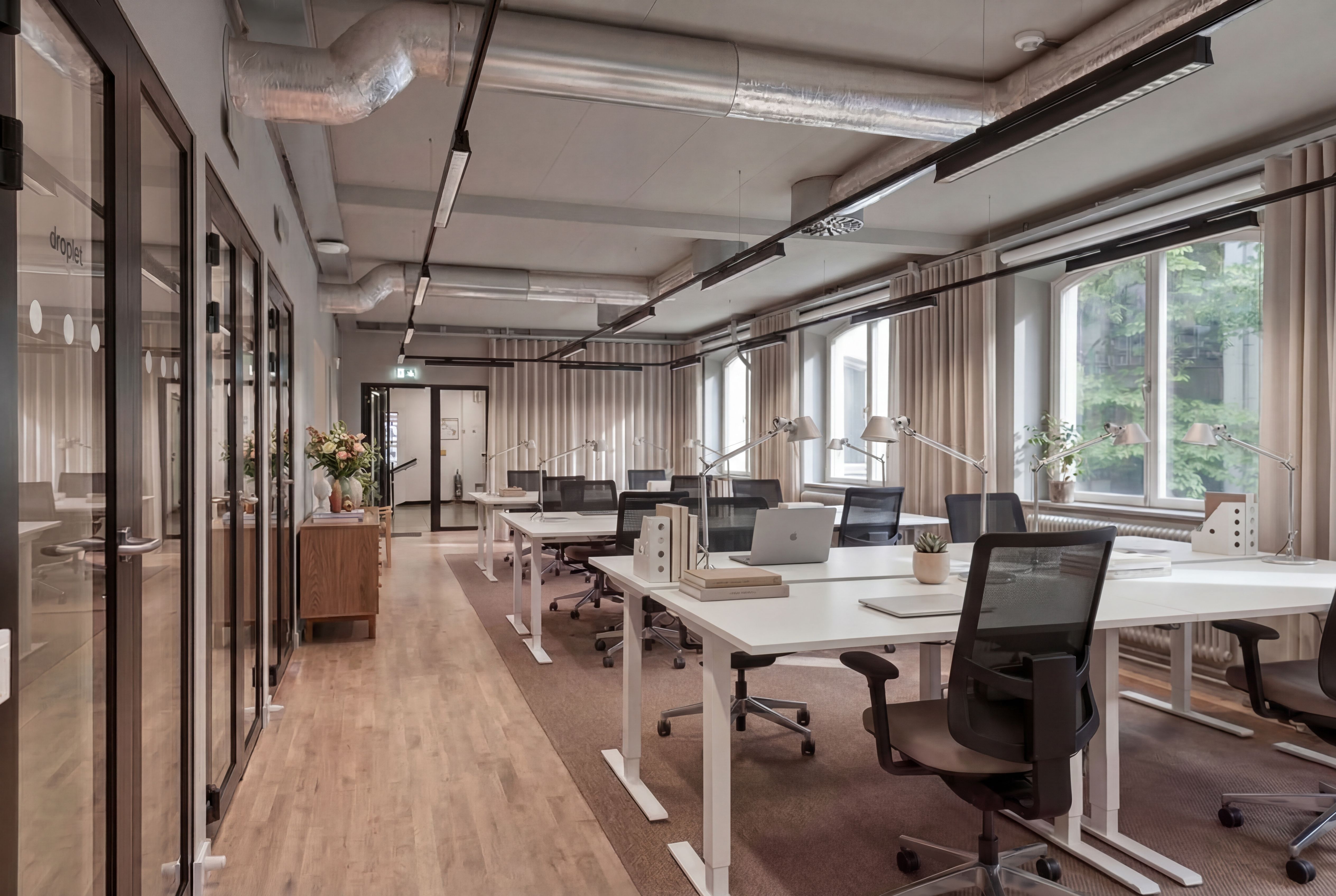 Våning 1, 2 & 3: Effektiva kontorsplan med hög standard, öppna arbetsytor och smart placerade mötes- och samtalsrum. De stora fönstren mot gården ger ett fantastiskt ljusinsläpp.
