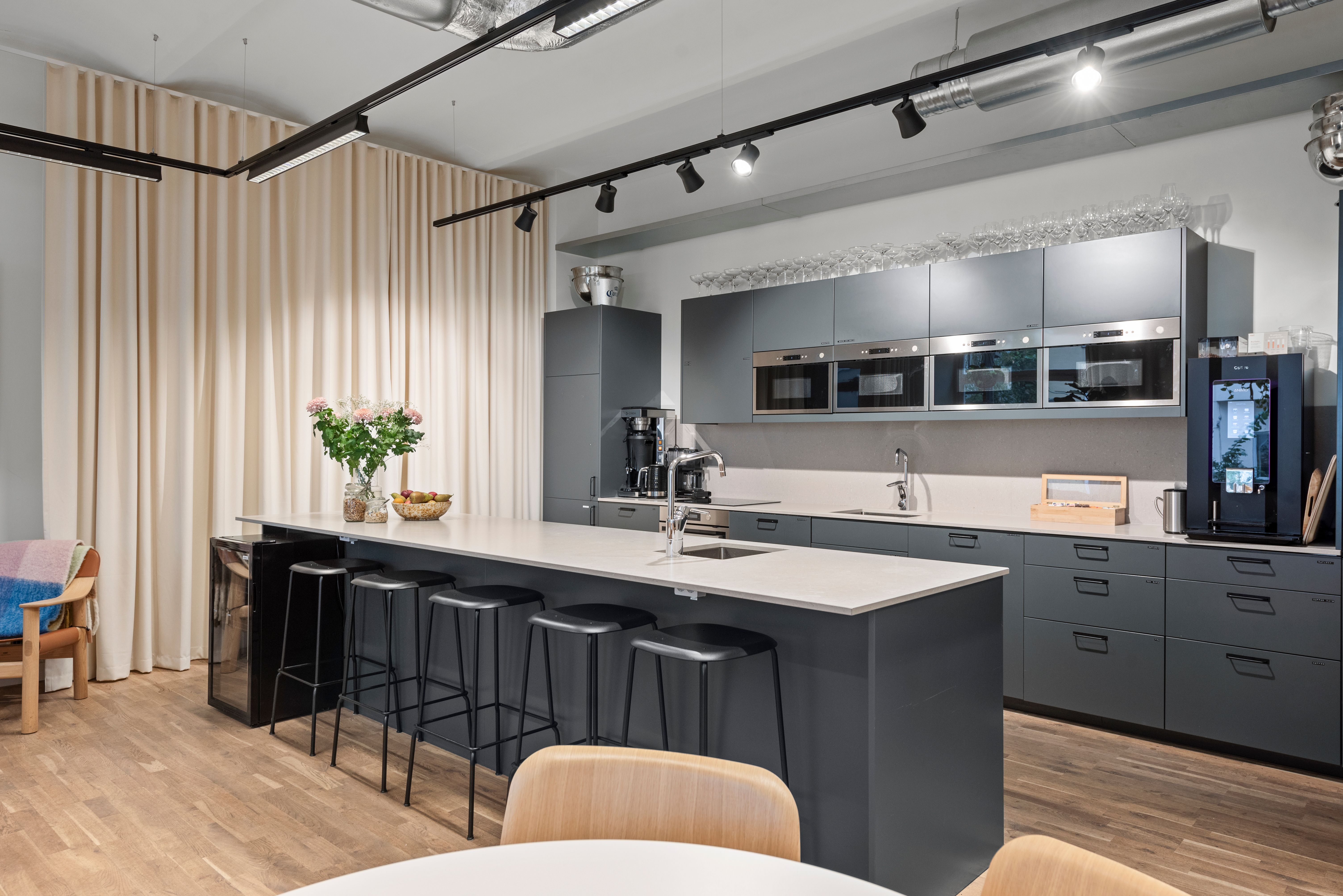 Bottenvåning: Husets sociala hjärta med ett generöst pentry med direktutgång till stor terrass och trädgård. Stora ytor för gemensamma luncher, presentationer för hela personalstyrkan och events.