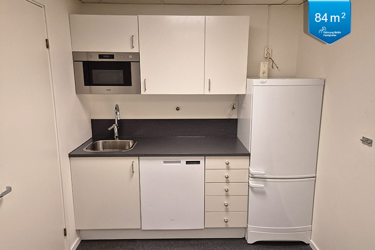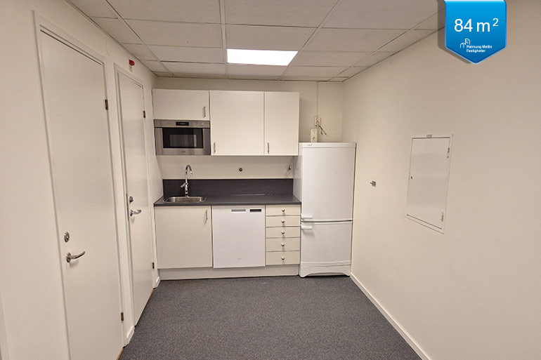 Komplett och väldisponerad kontorslokal på 84 kvm en trappa upp i byggnaden som även har hiss. Lokalen har egen ingång, två WC, separat dusch, förråd samt pentry och två väl tilltagna kontorsrum som ger flexibilitet när det gäller antalet arbetsplatser.