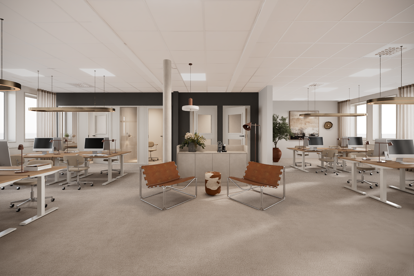 Här får ni ett öppet landskap med plats för cirka 18 arbetsplatser, där ni enkelt kan skapa både fasta och flexibla lösningar. Lokalen badar i ljus från två håll och får en fräsch uppdatering under Q1 2025, då det bland annat byggs nytt pentry, ny RWC med dusch och flexibla mötesrum för både små möten och större samlingar.