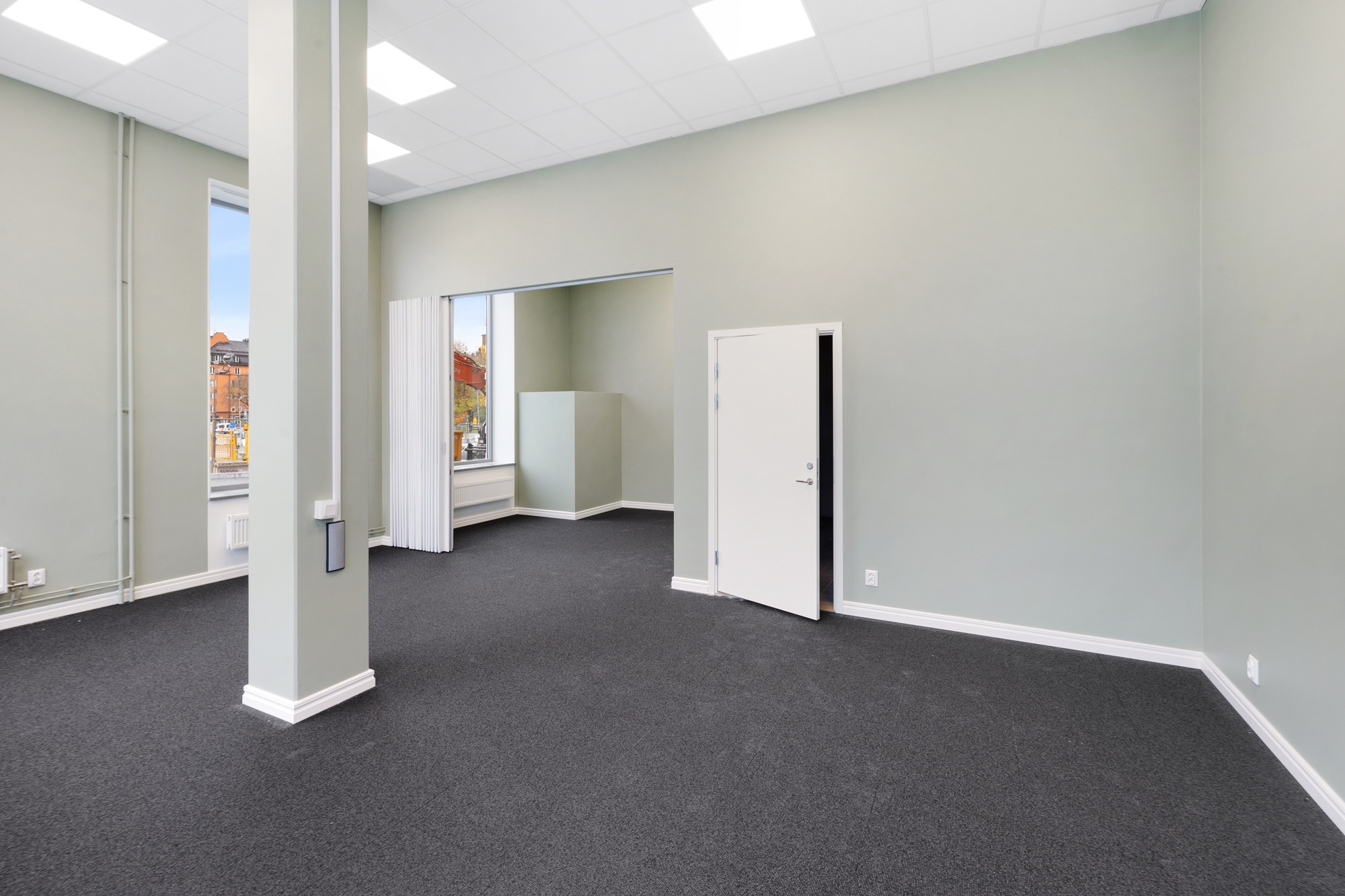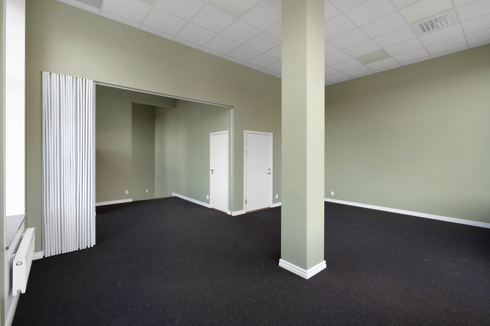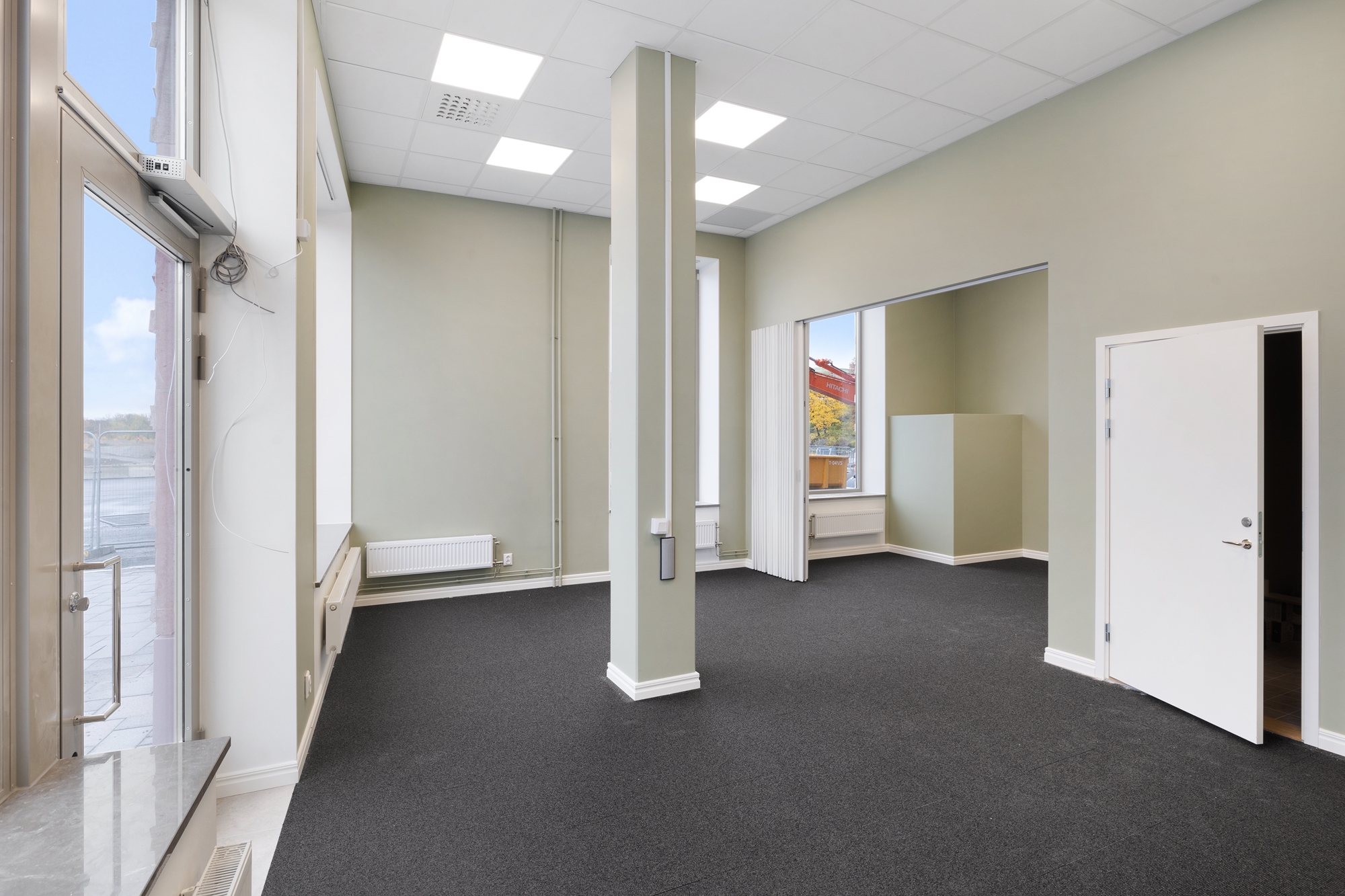 Lokalen har högt i tak, stora skyltfönster och bra ljusinsläpp samt 2 entréer.