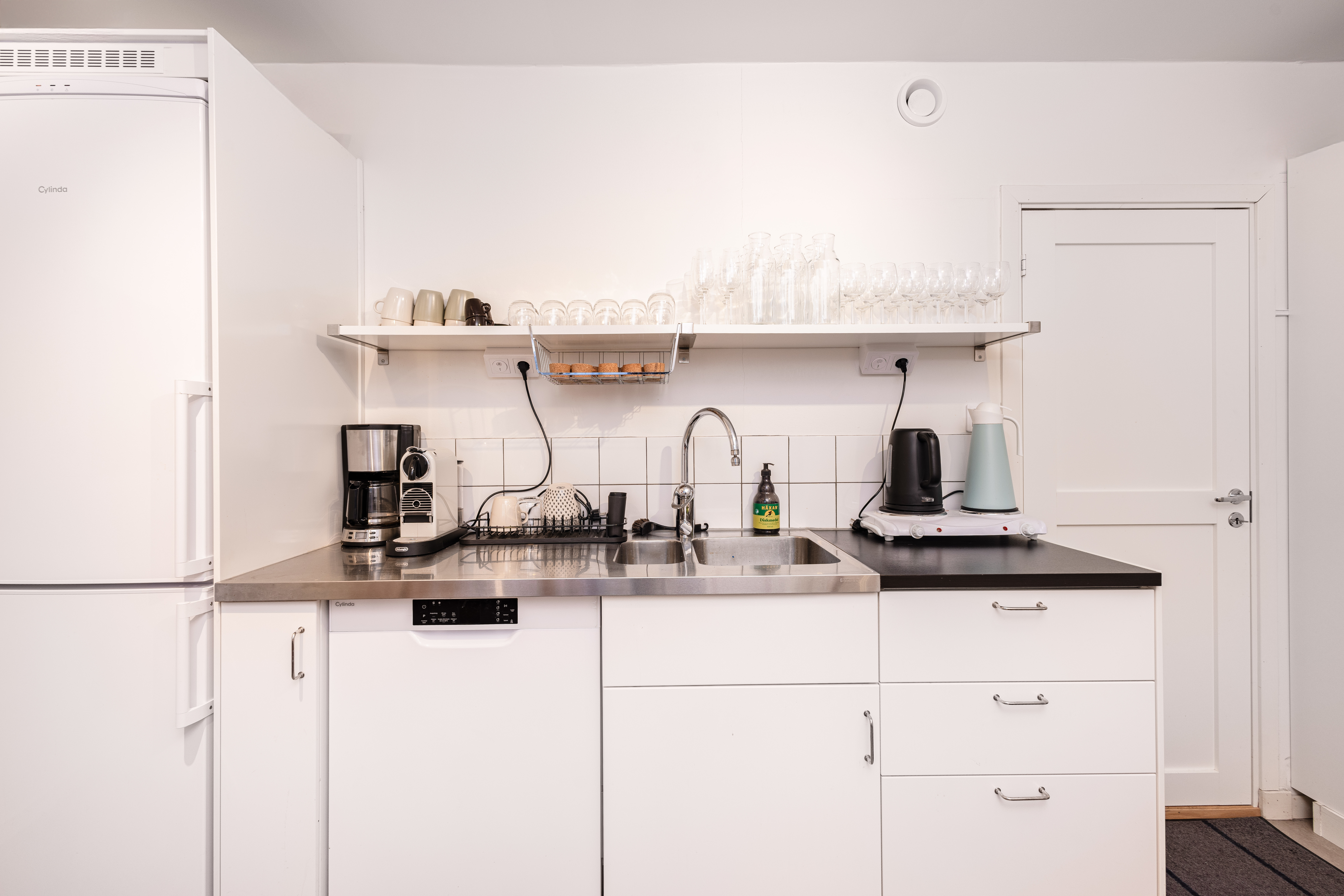 Här består lokalen utav en stor öppen yta med ett fantastiskt ljusinsläpp från flertalet massiva skyltfönstren. Vidare in finns ett separat rum, med egen ingång från gatan, samt ett fräscht och välutrustat pentry och badrum med W/C och dusch. Köket har även gott om plats för matbord med sittplatser.