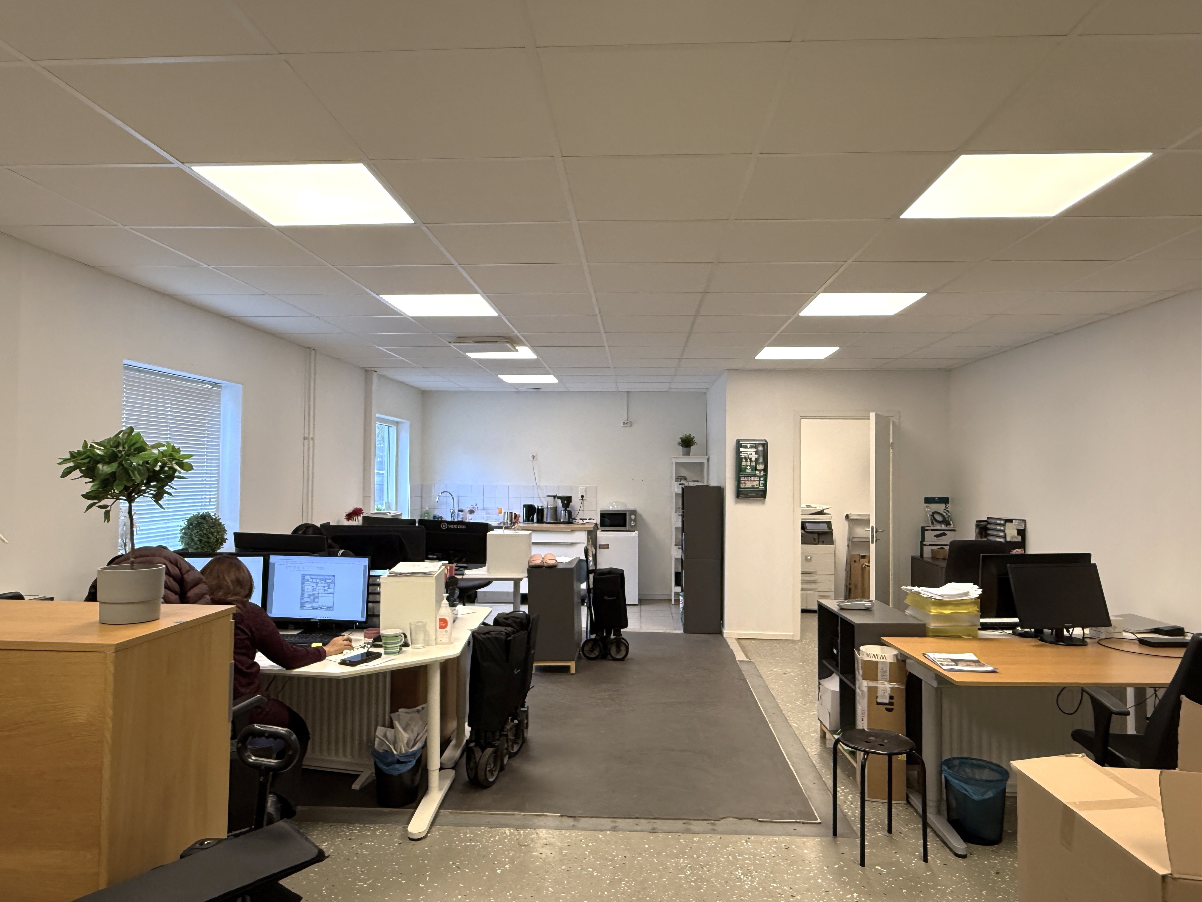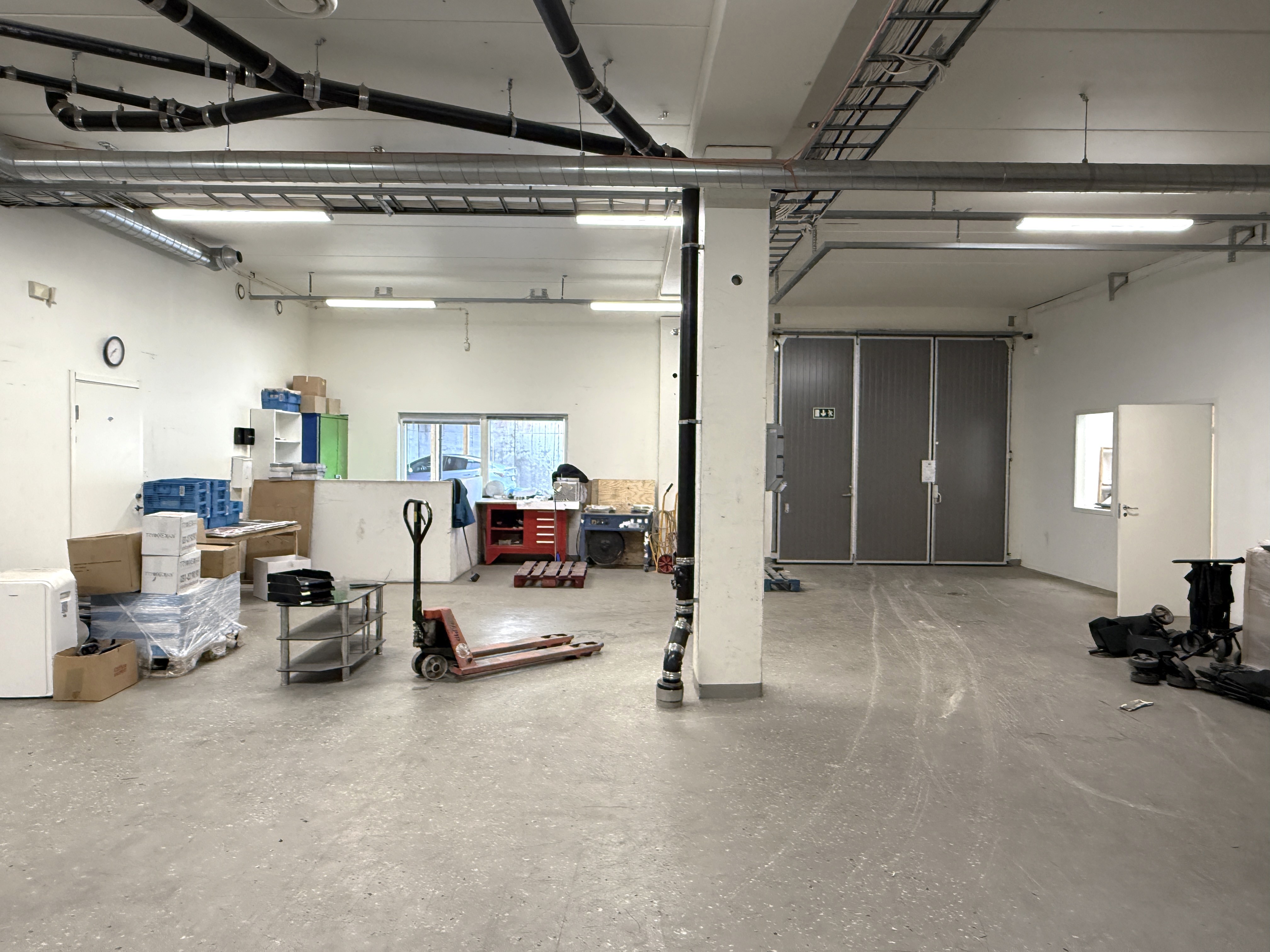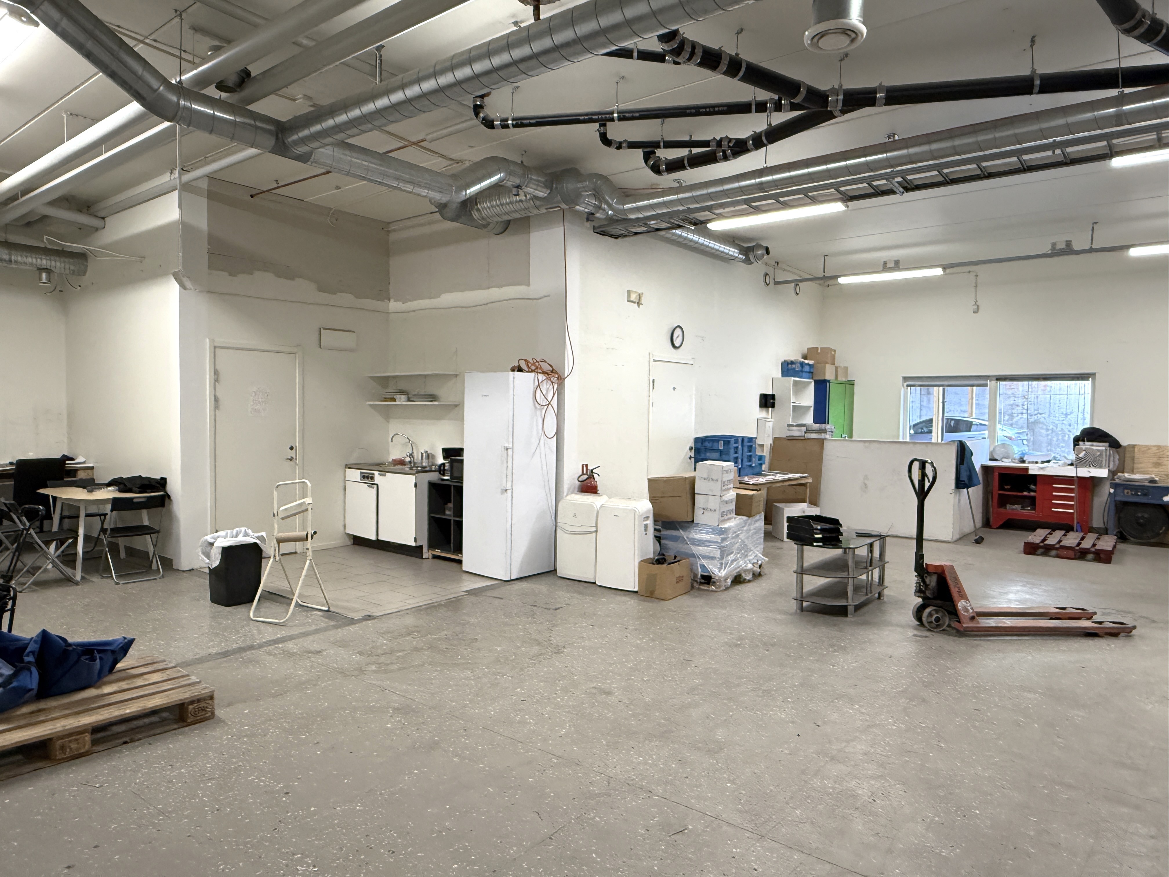 Stor öppen kontorsyta + konferensrum och förråd