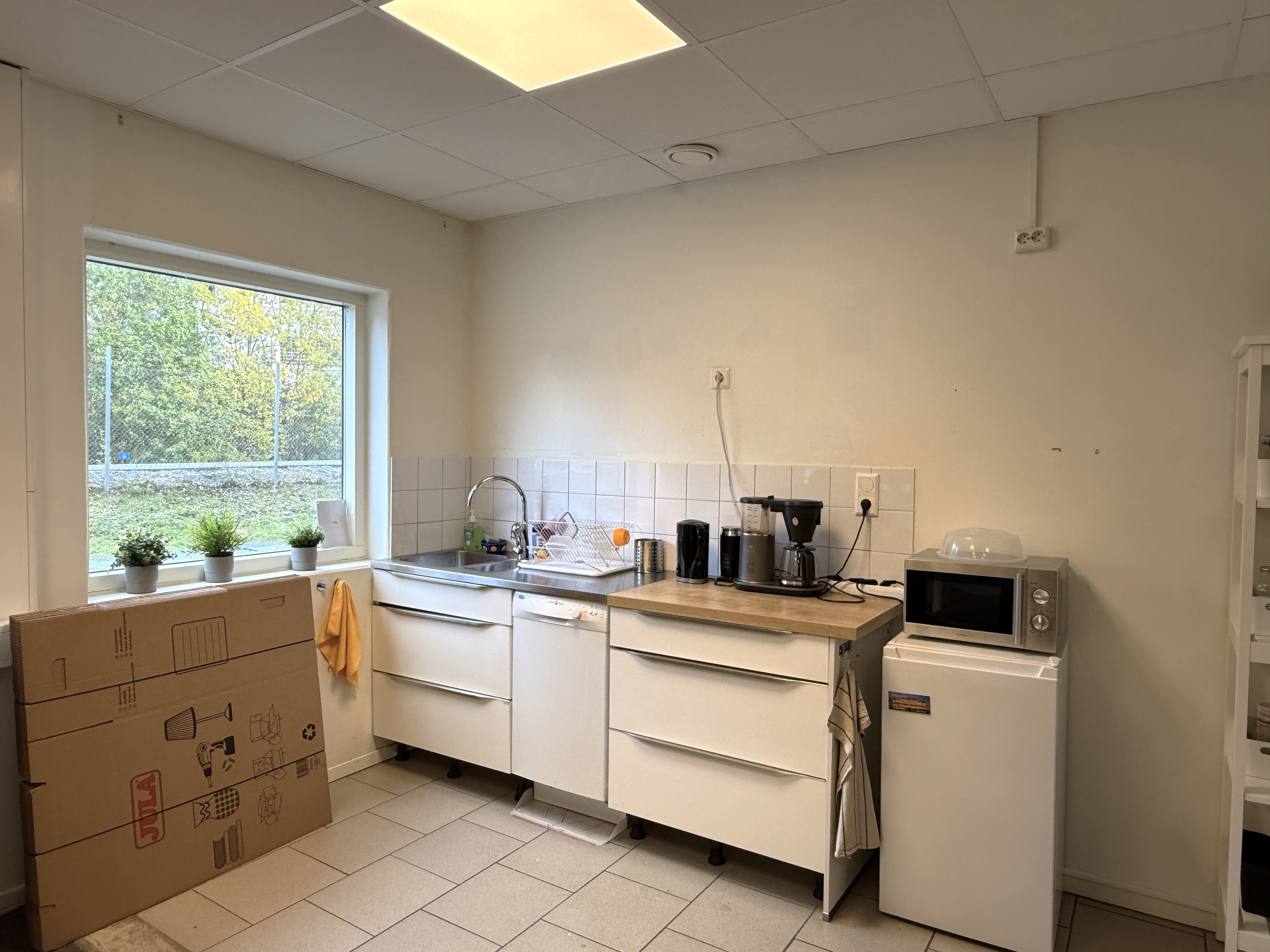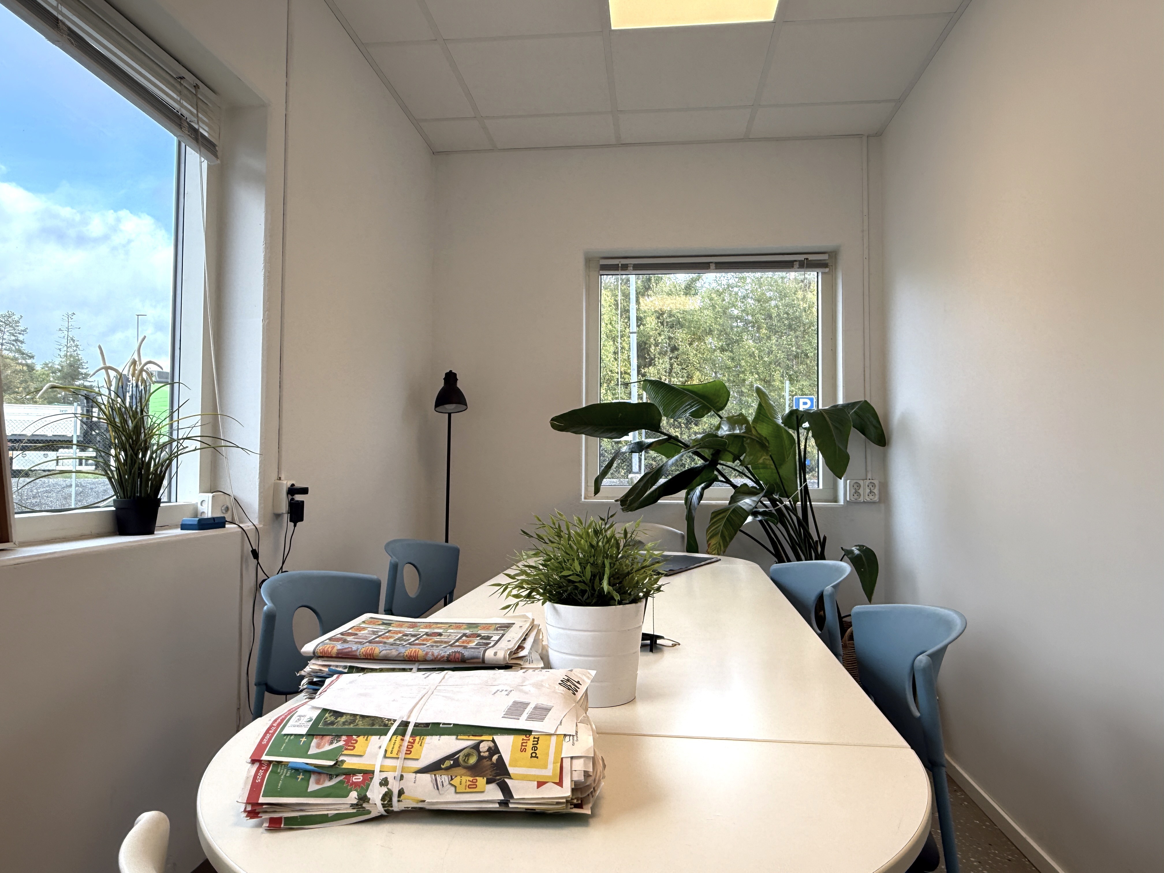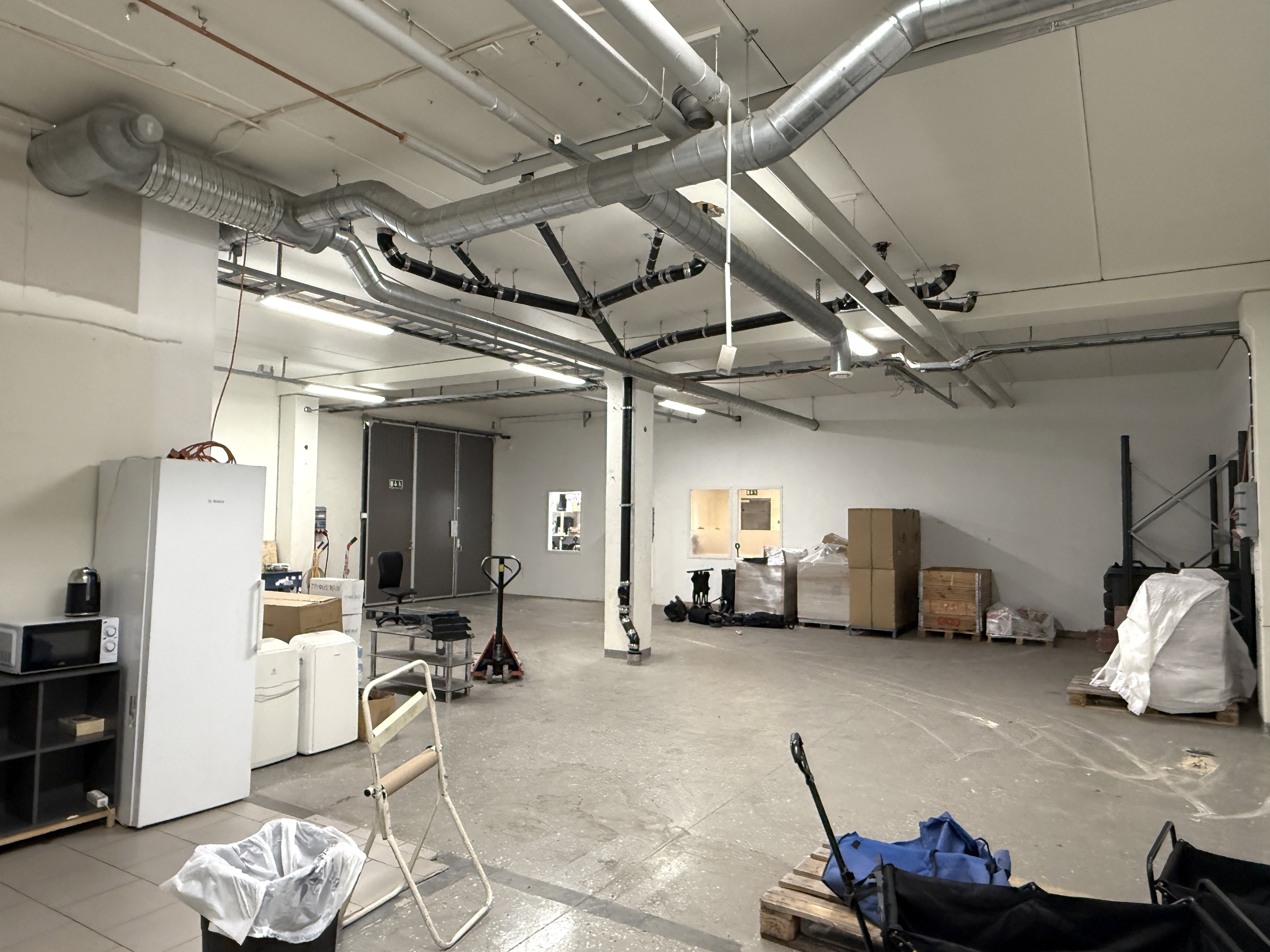 Stor öppen kontorsyta + konferensrum och förråd