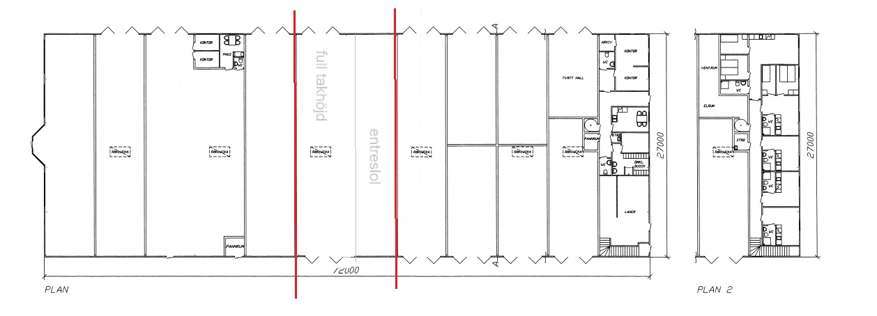 Ytan fördelas på cirka 480 kvm i markplan samt 160 kvm entresol. På entresolen finns kontor, pentry samt WC med dusch, vilket skapar goda förutsättningar för både produktion och administration i samma lokal. Här finns även extra förvaringsytor.