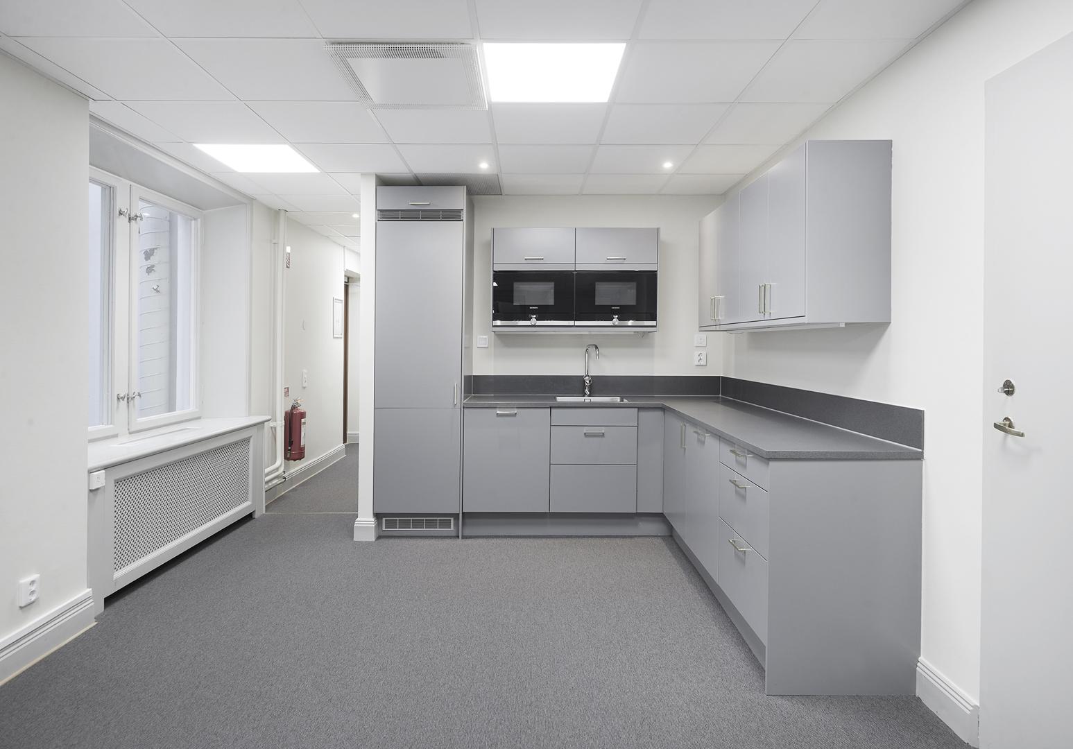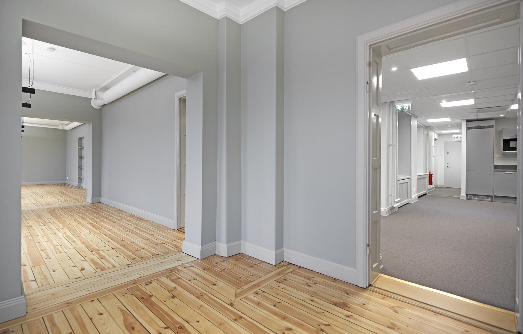 Lokalen har en öppen pentry/pausarea i anslutning till entrén. Tre stora och ljusa rum ligger i fil och kan disponeras som kontor och möte.