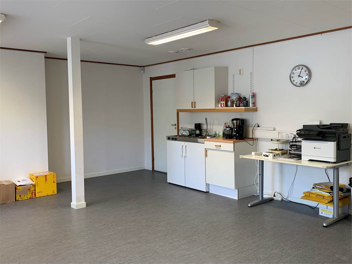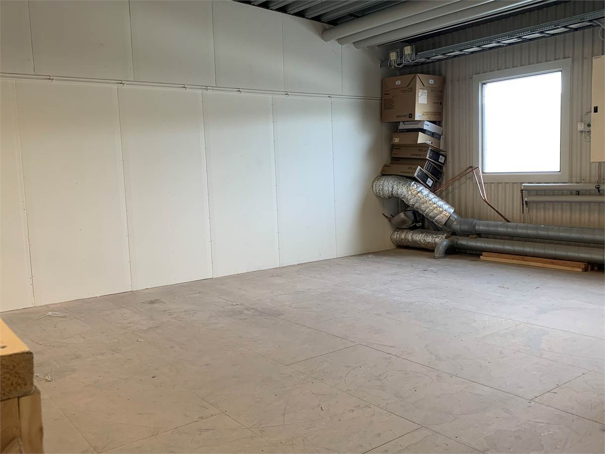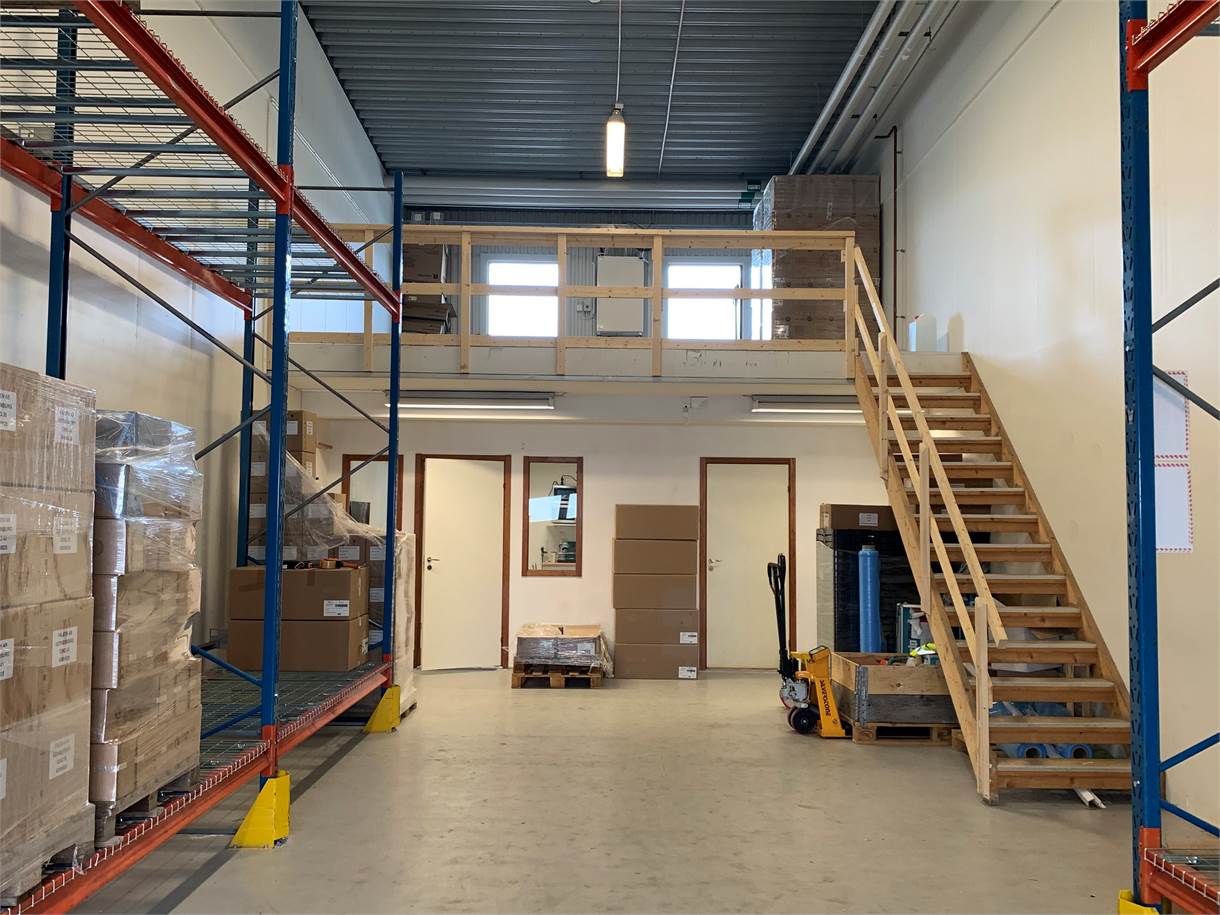 Kontorsdelen består till största del av öppen planlösning och inkluderar två pentryn, två WC samt dusch. Ovanför pentry och WC i lagerdelen finns ett loft om cirka 34 kvm som kan nyttjas som extra yta.