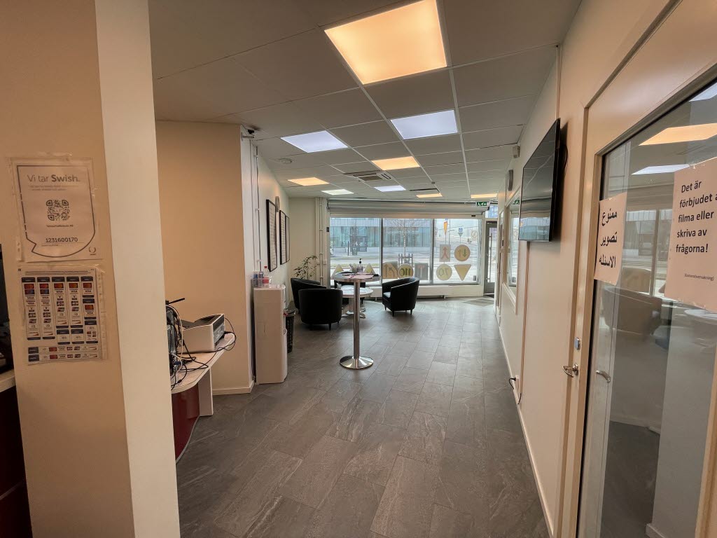 Här välkomnas du av en generös hall med plats för väntrum eller loungehörna som leder till de två stora kontorsrummen och pentryt med både matplats, personal-WC, förvaring och personalingång.
