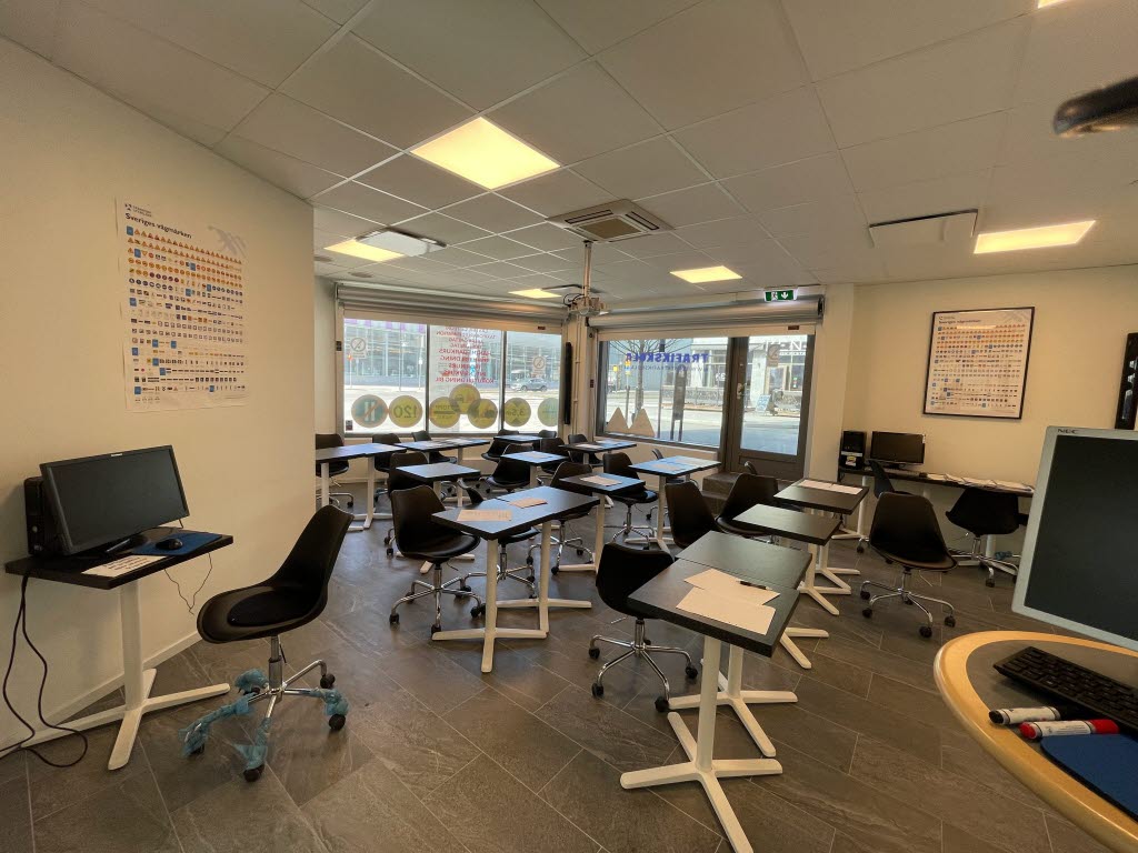 Lokalen har ett härligt ljusinsläpp med stora fönster och tre entréer.