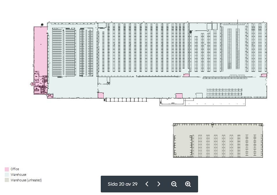 Förutom den uppvärmda lagerlokalen i huvudbyggnaden finns ytterligare 2 400 kvm ouppvärmt lagerutrymme i den separata lagerbyggnaden. Totalt finns 98 parkeringsplatser, och gott om utrymme för lastbilar att manövrera enkelt.