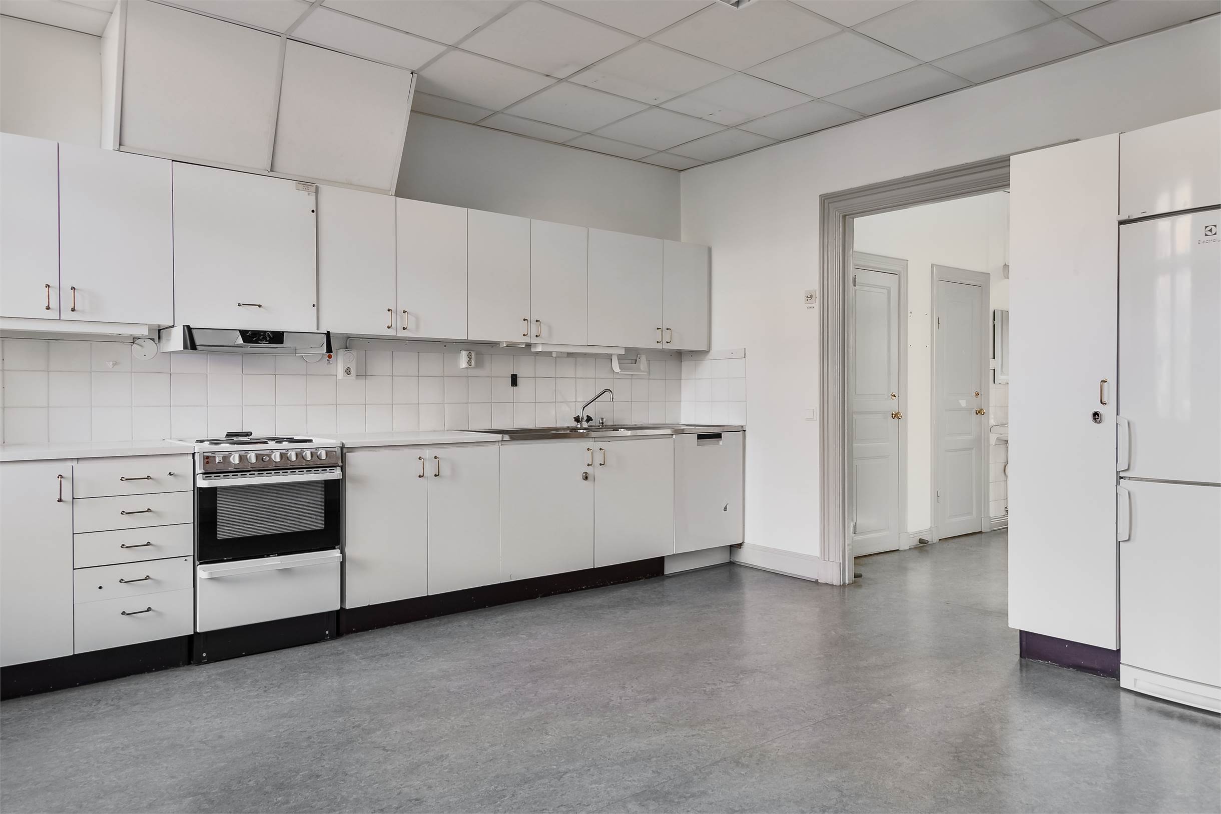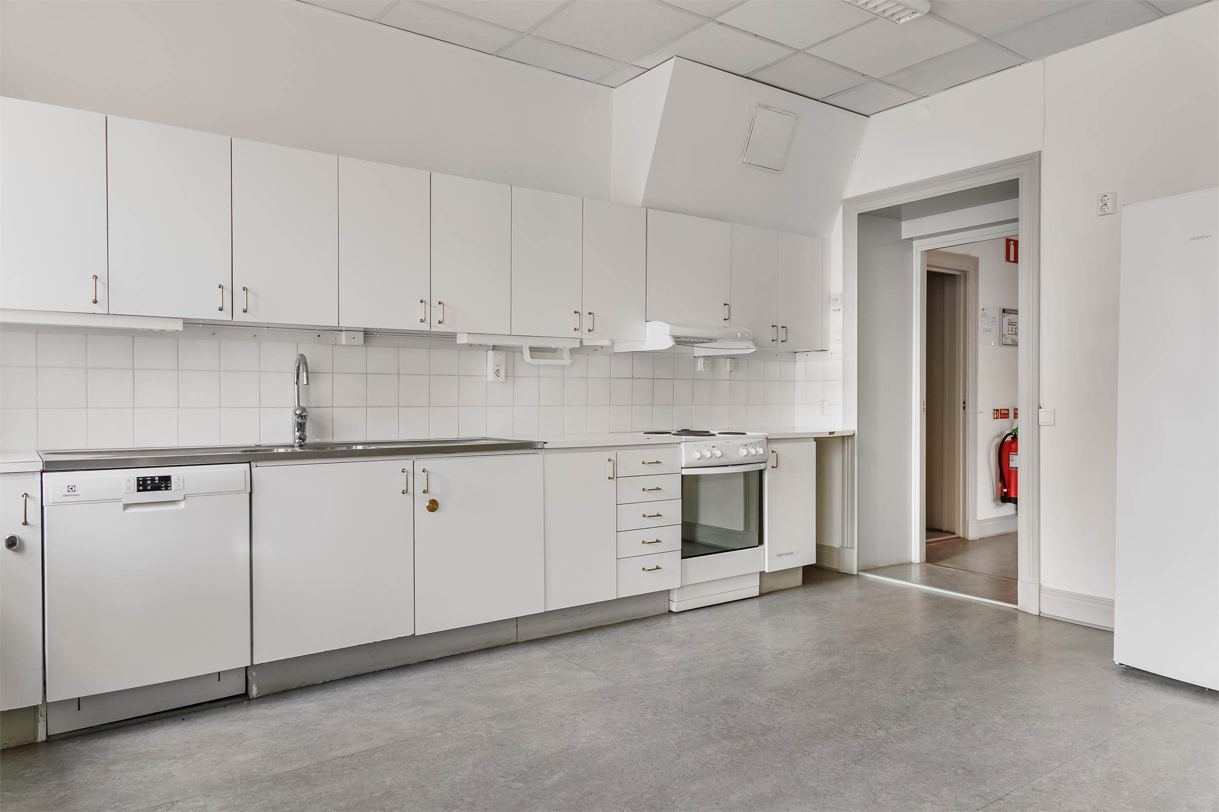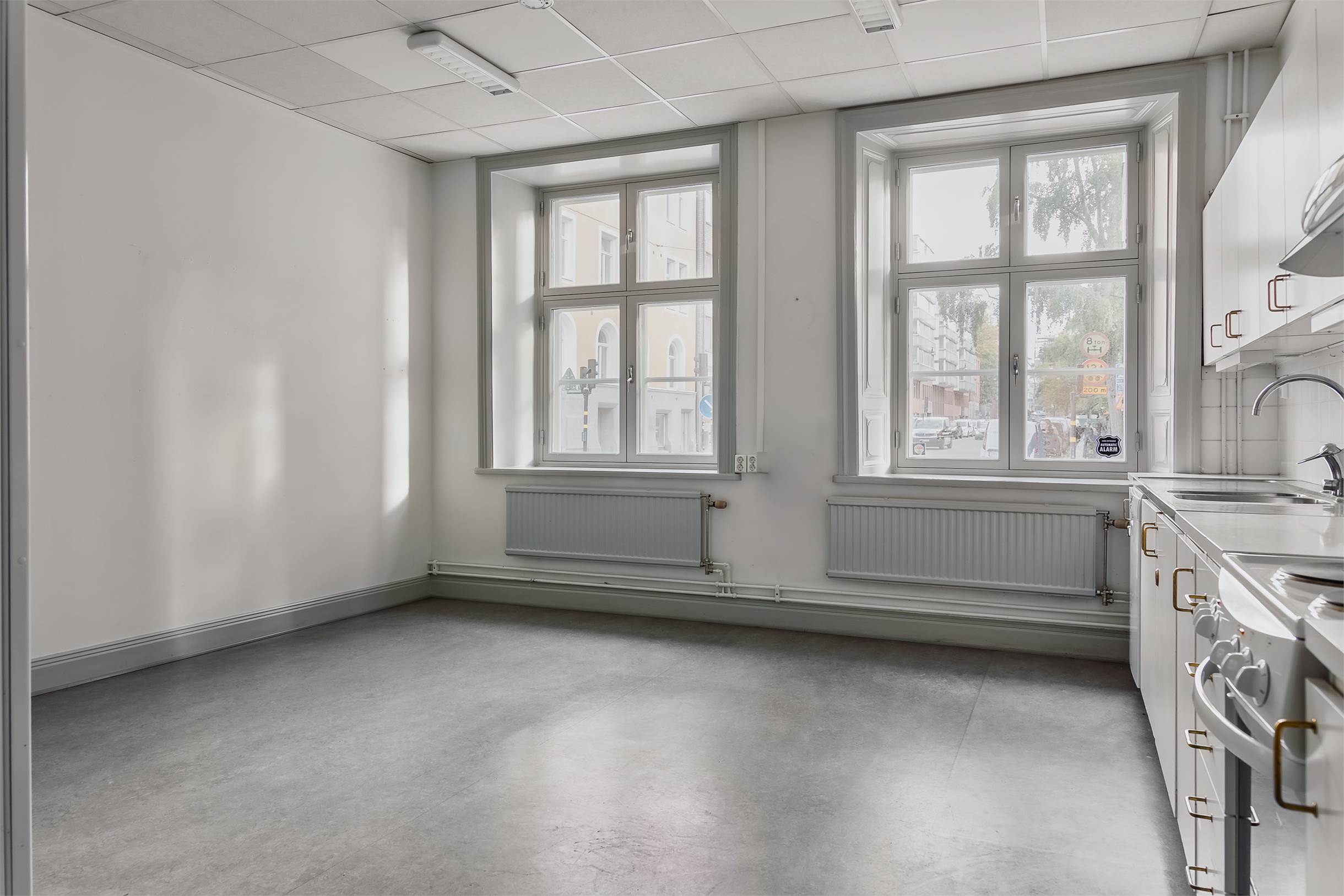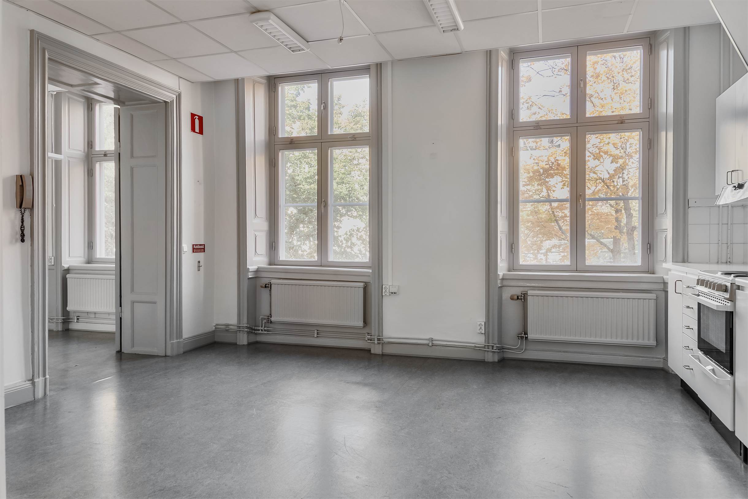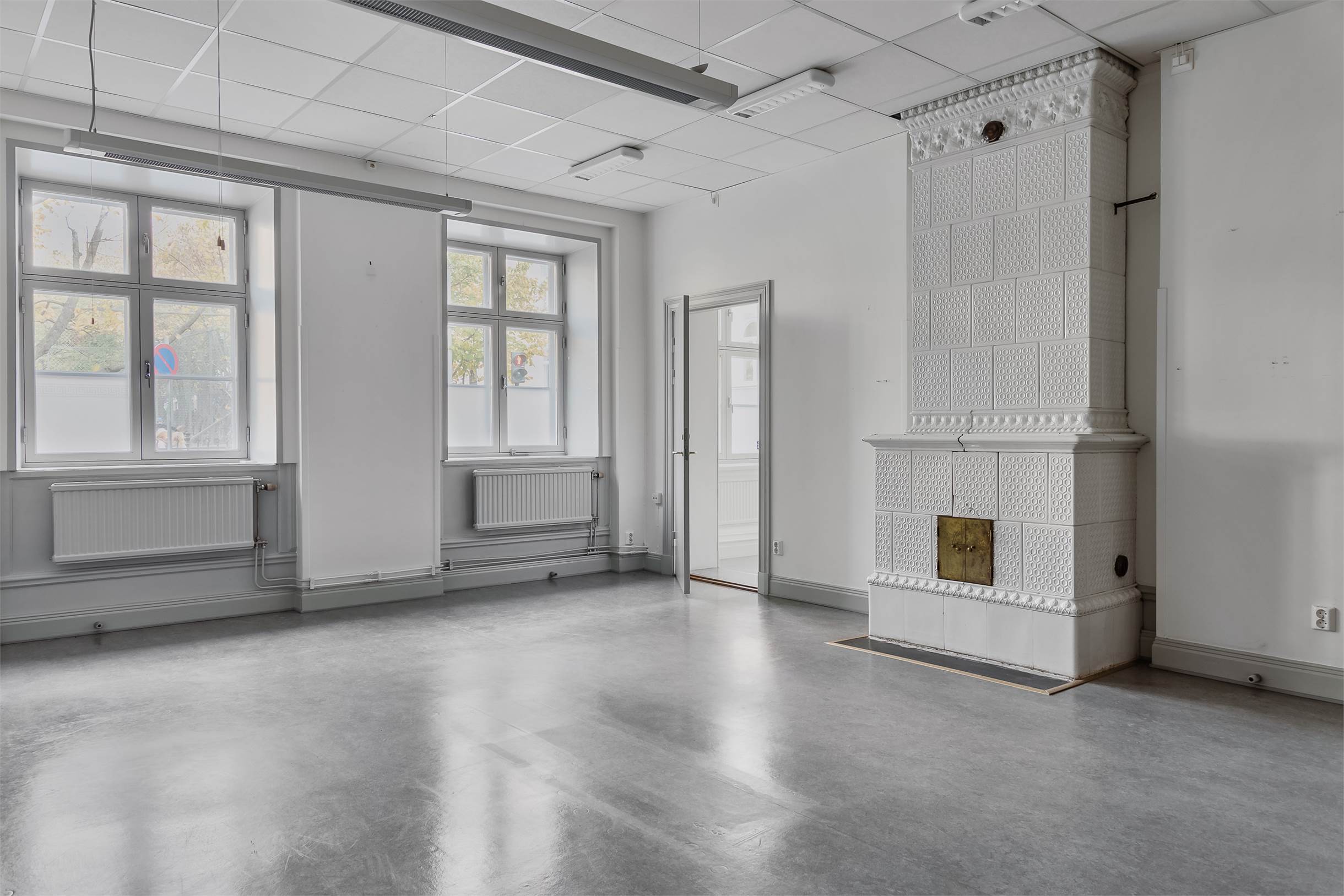 Den större lokalen är belägen på bottenplan i huset medan den mindre ligger en trappa upp. Båda lokalerna har generös takhöjd och gott om fönster i flera väderstreck. Det finns både mindre kontorsrum och större mötesrum. Köken i båda lokalerna är välutrustade och har gott om plats för t.ex. ett matbord. Det finns två toaletter i varje lokal och på bottenvåningen även dusch. Till lokalen en trappa upp hör en liten balkong.